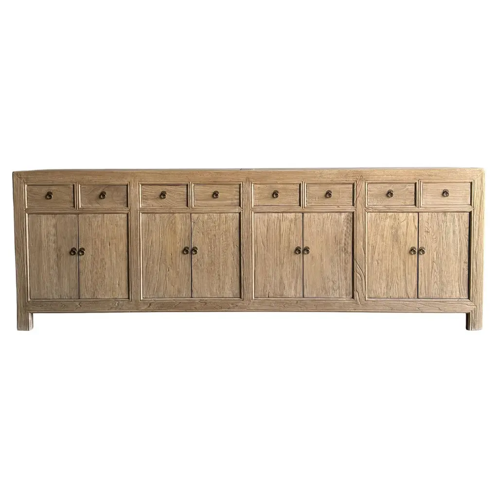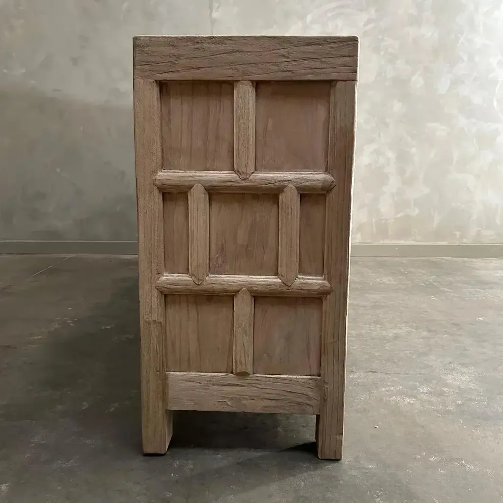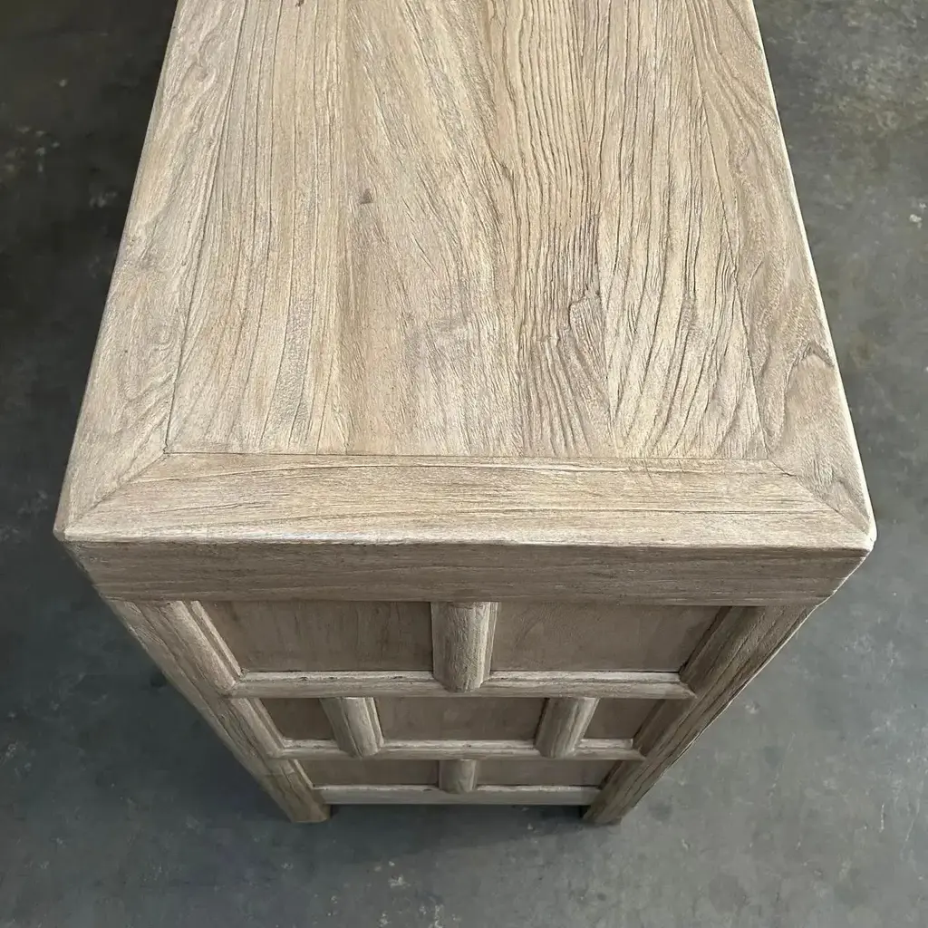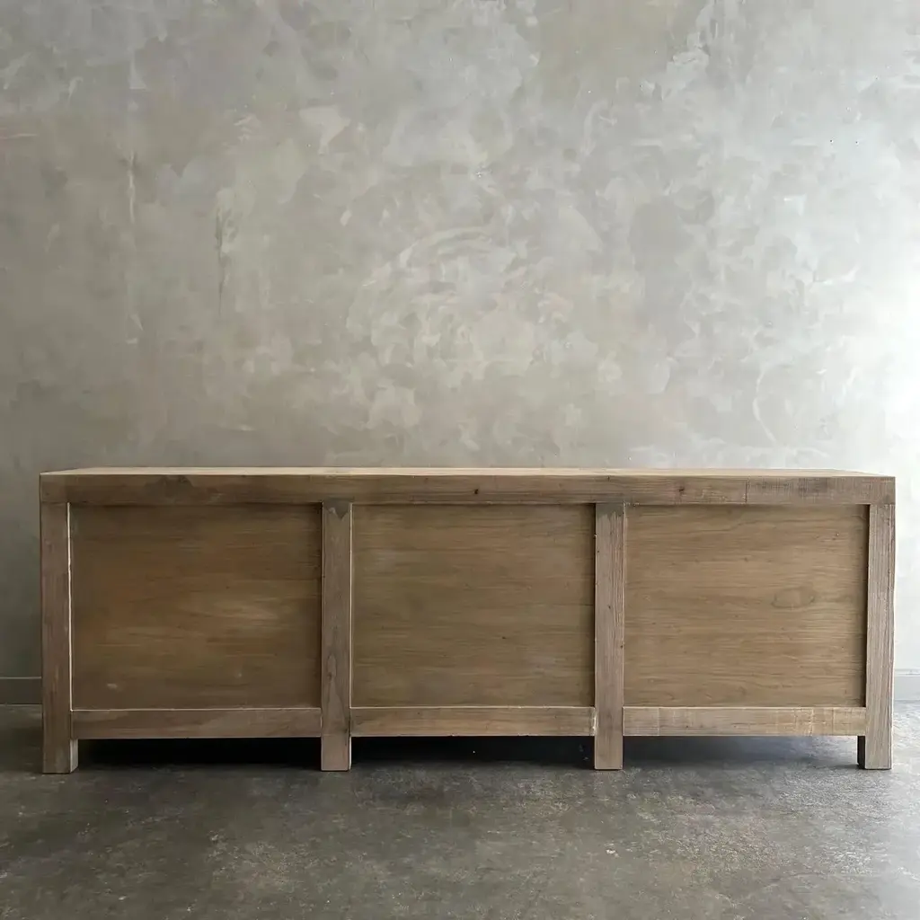 CARY SIDEBOARD IN NATURAL FINISH Made from salvaged reclaimed timbers, this console is reminiscent of antique apothecary cabinets. Featuring 21 drawers for ample storage and a distinctive weathered finish, this rustic sideboard adds a unique touch to any space. Reclaimed Materials: there may be some imperfections in the piece or grain of the wood. We like to call that character. Please note this item is handcrafted and slight variations can be expected from piece to piece. Materials: Reclaimed Elm Care Instructions: Do not use harsh chemical, use damp cloth. Drawer cabinet 94”w x 16.5”d x 33”h