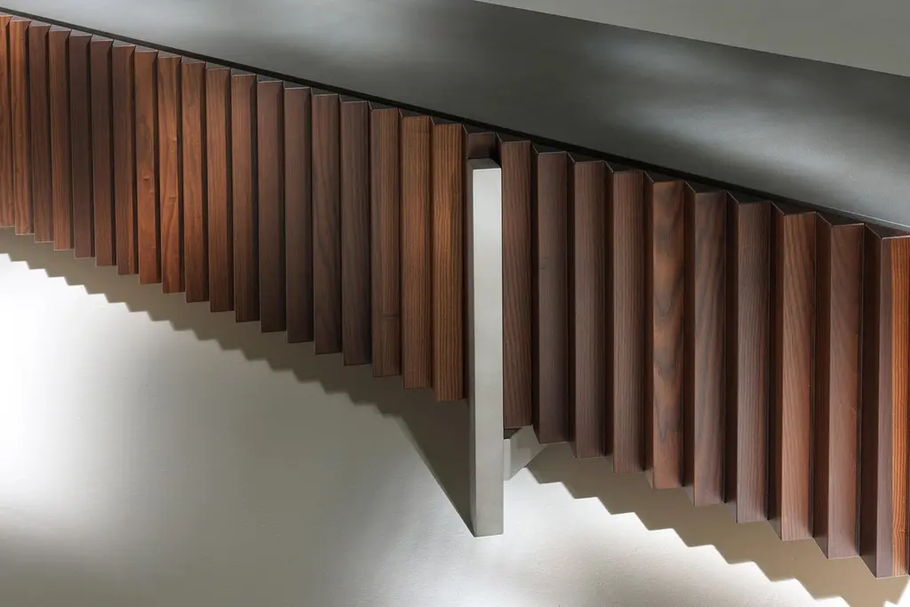 Design Carlo Cumini - TV NOT INCLUDEDTV stand cabinetBase with adjustable feet H cm. 3Available inHeat-treated ashLight bronze top finishCopper top finishTop brass finishSizesL 146 x P 58 x H 123 cmL 204 x P 53,5 x H 93 cmTV cabinet with 2 doors and a centralflap, finished back for use in the centerof the room, cable hole in the back.External structure with “light bronze”clouded finish, internally matt blacklacquered, doors and feet in solidheat-treated ash.
