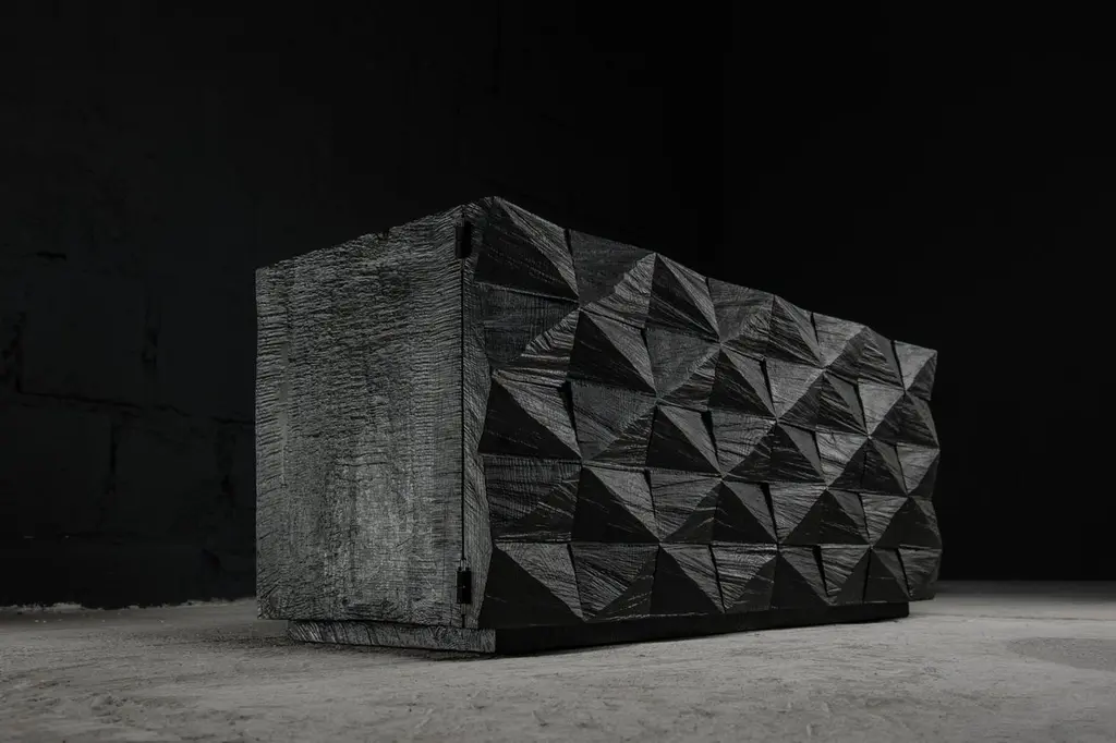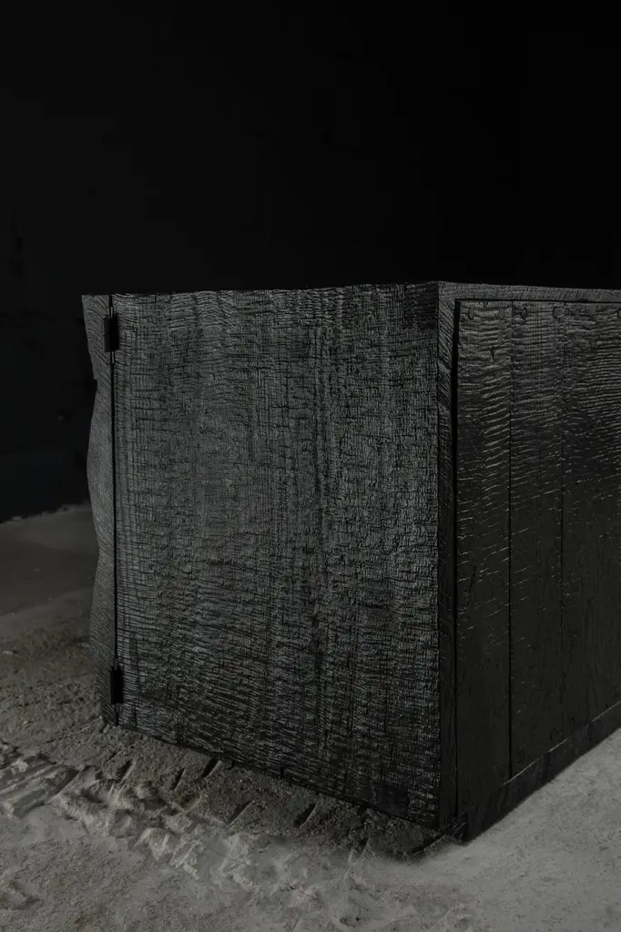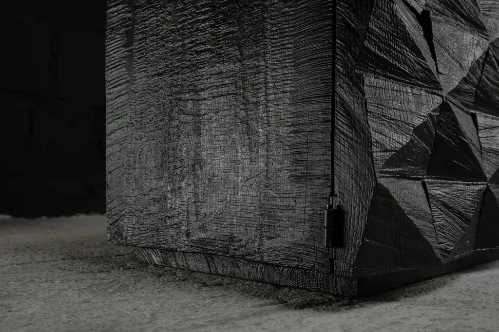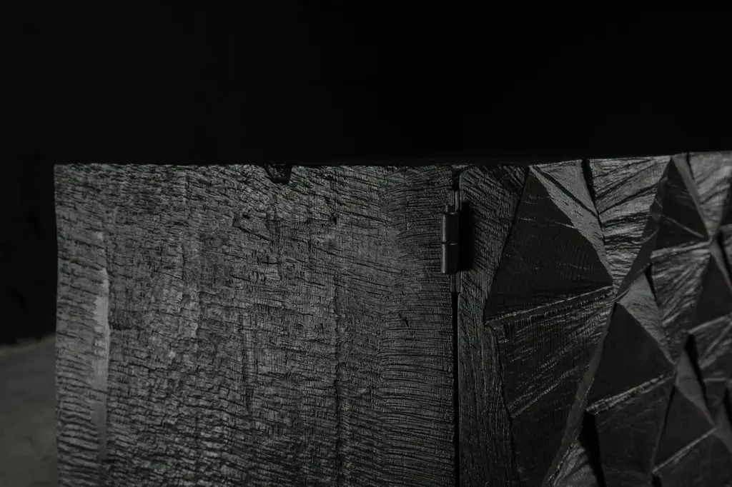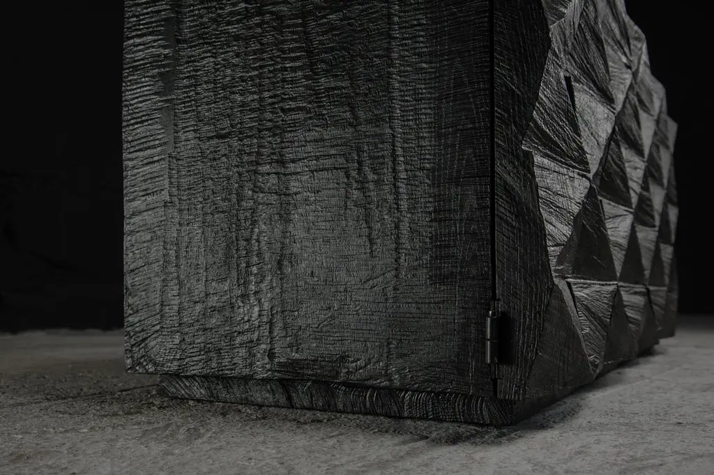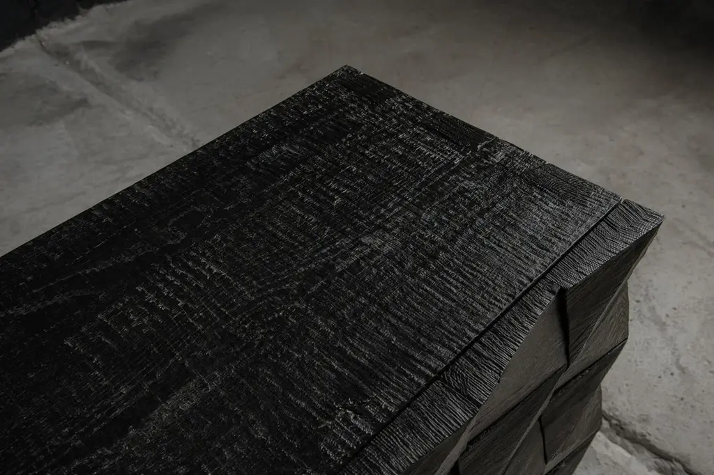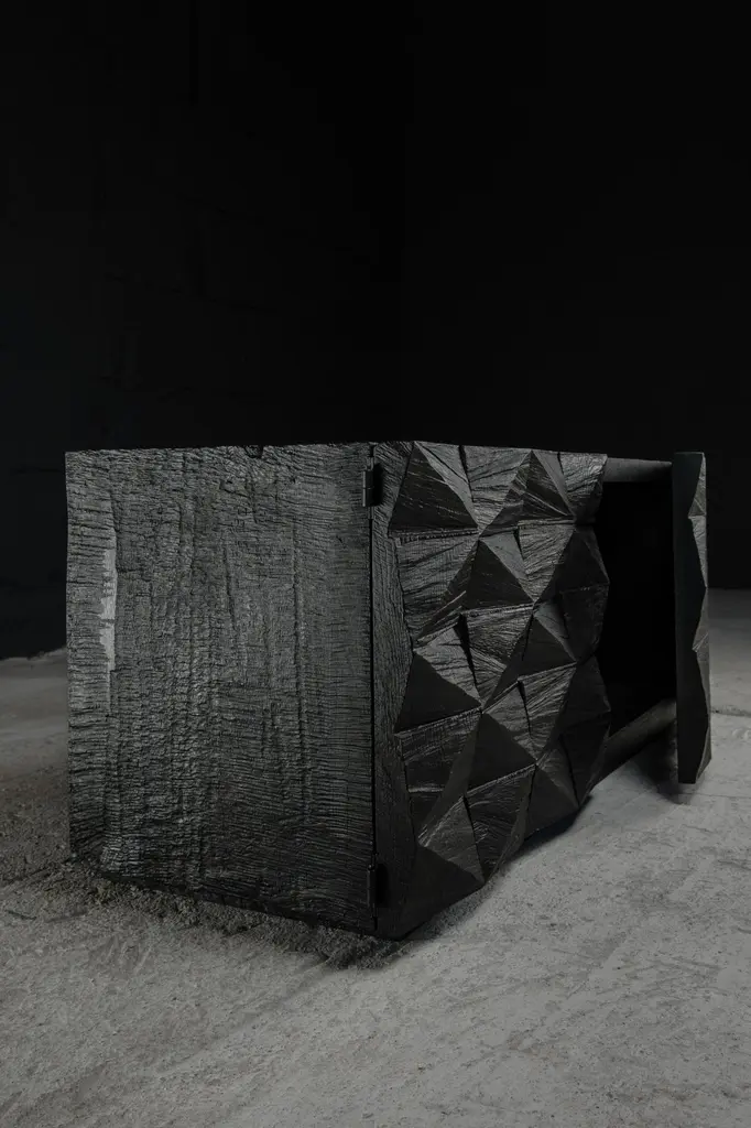 Contemporary Brutalist Sculpted Cabinet in Solid Black Oak, Diamond PatternMaterials:solid oak (+ linseed oil)Dimensions: H. 50 x 120 x 45 cmCustomizable SÓHA design studio conceives and produces furniture design and decorative objects in solid oak in an authentic style. Inspiration to create all these items comes from the Russian North aesthetics with its severe nature, log huts black from time and climate and scant patterns. Wood is masterfully hand processed with chainsaw or chisel, whereby producing beautiful surface patterns. The wood is soaked in boiling baths of linseed oil, creating this special patina and making each creation a very unique piece. Reacting with tanning substances under high temperature, oil gives the objects expressive and natural colours, from light brown to charcoal-black. SÓHA offers a vast array of neo-primitivist interior objects. Our kitchen utensil, wall panels, sculptures and furniture solutions are executed in one unique style and will organically fit into the interior of your home. Each piece is one-of-a-kind handmade product.Unique piece made to order.