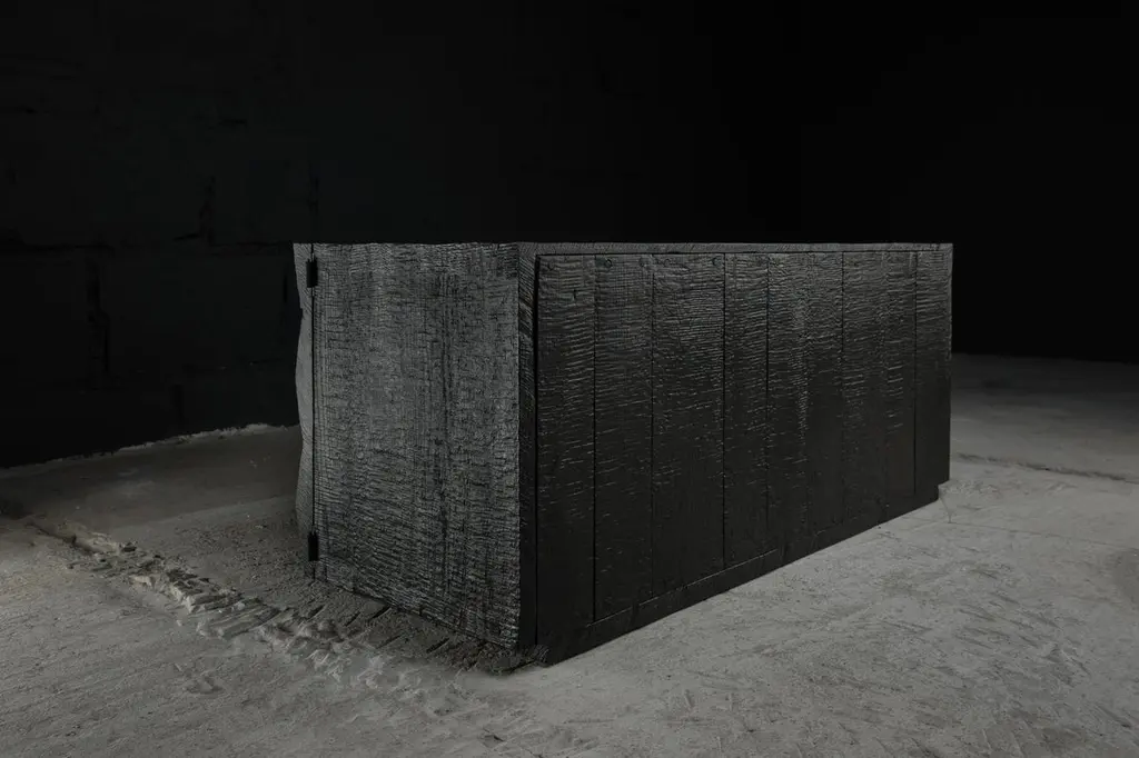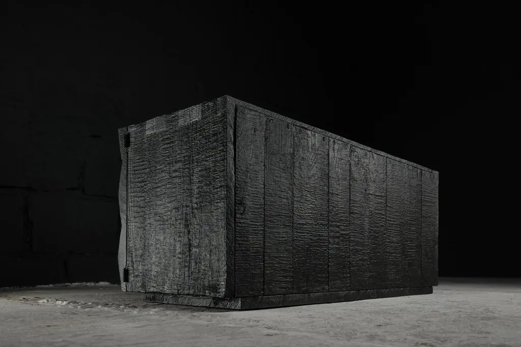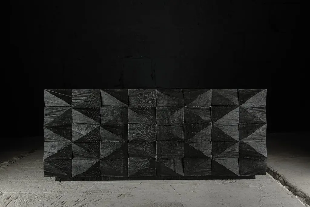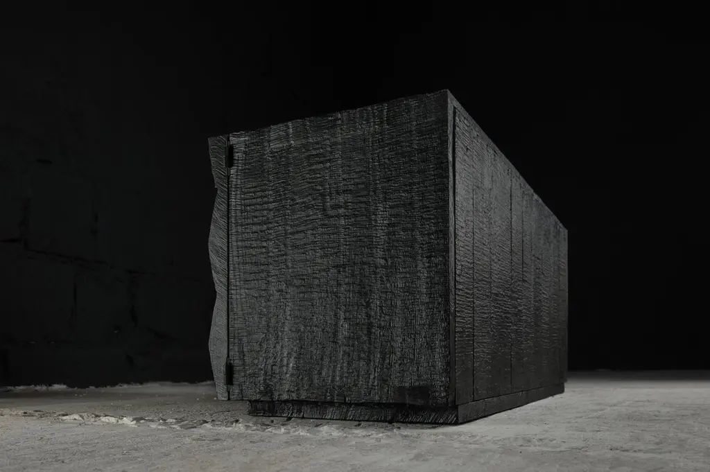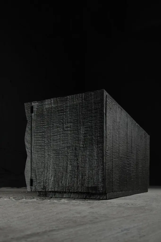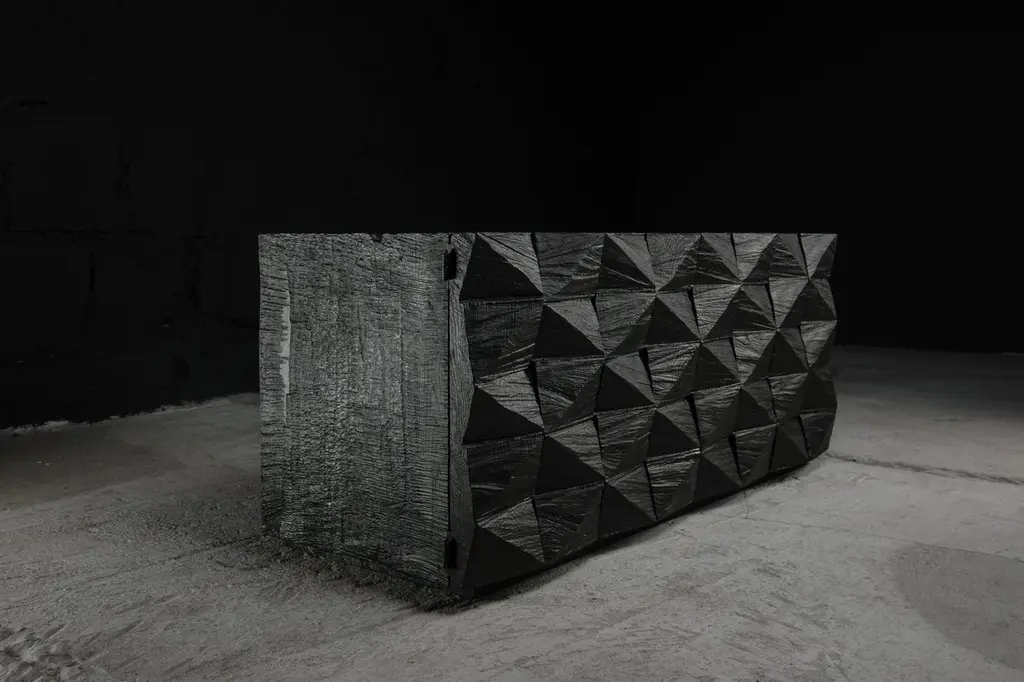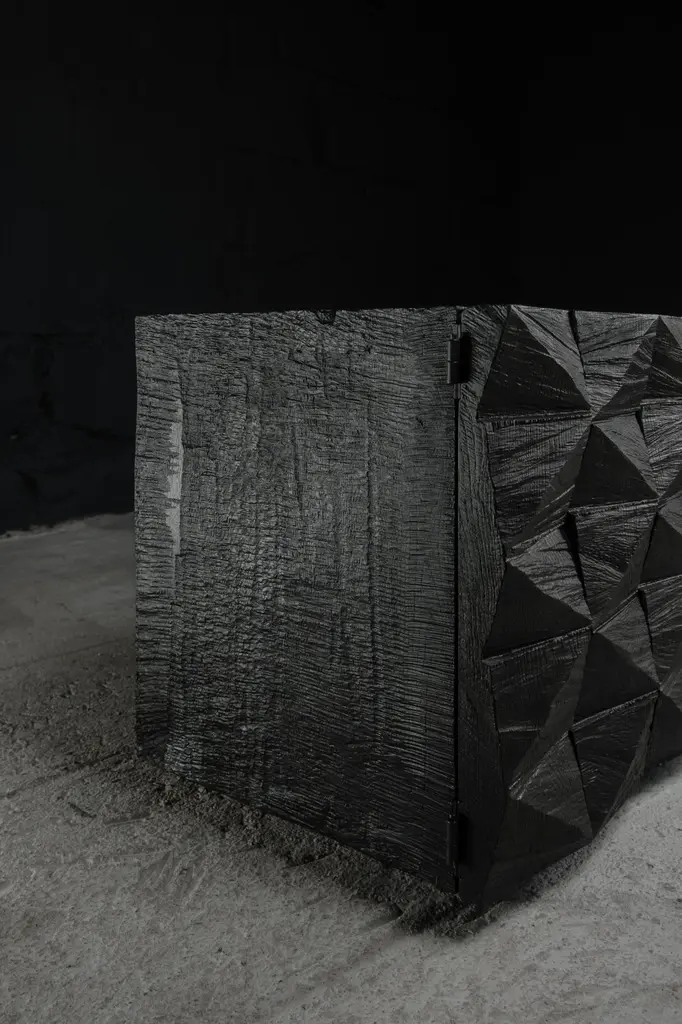 Contemporary Brutalist Sculpted Cabinet in Solid Black Oak, Diamond PatternMaterials:solid oak (+ linseed oil)Dimensions: H. 50 x 120 x 45 cmCustomizable SÓHA design studio conceives and produces furniture design and decorative objects in solid oak in an authentic style. Inspiration to create all these items comes from the Russian North aesthetics with its severe nature, log huts black from time and climate and scant patterns. Wood is masterfully hand processed with chainsaw or chisel, whereby producing beautiful surface patterns. The wood is soaked in boiling baths of linseed oil, creating this special patina and making each creation a very unique piece. Reacting with tanning substances under high temperature, oil gives the objects expressive and natural colours, from light brown to charcoal-black. SÓHA offers a vast array of neo-primitivist interior objects. Our kitchen utensil, wall panels, sculptures and furniture solutions are executed in one unique style and will organically fit into the interior of your home. Each piece is one-of-a-kind handmade product.Unique piece made to order.