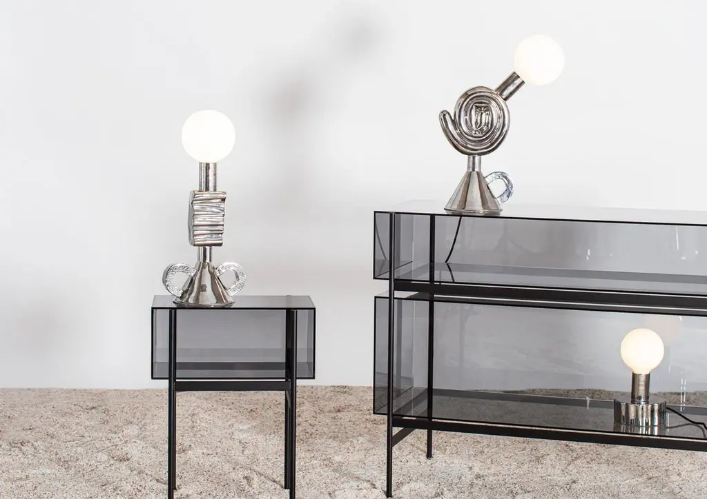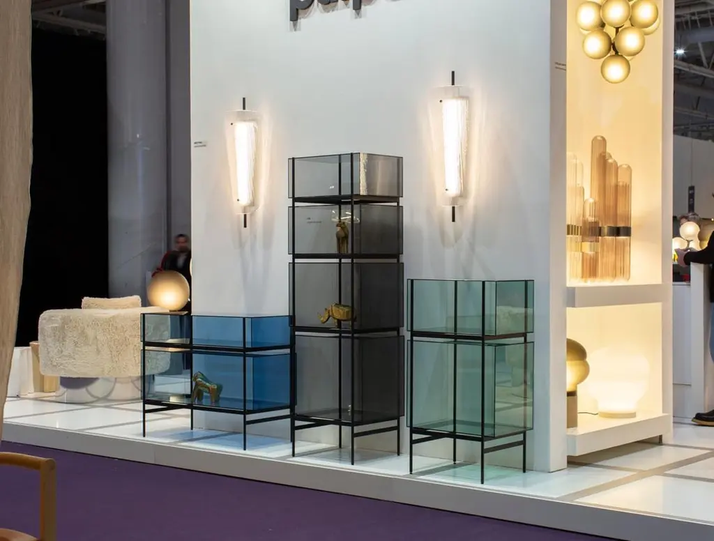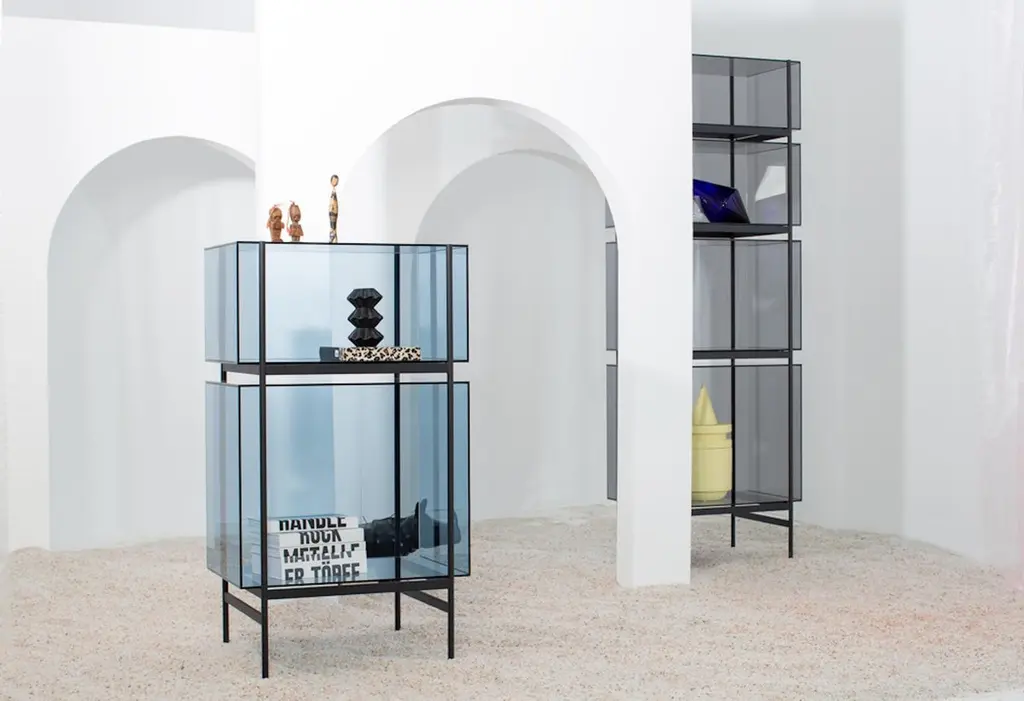StudioVisser & Meijwaard describe their conception of lyn as a “graphic interplay between glass and the metal frameworks”. The doorless and diverse series of cabinets and high boards are equivalent to the designers’ ambition to rethink established forms, like they did in their past as fashion designers. The reduction to the absolute essential form opens a free interplay of material and colour. Depending on the lighting conditions, the viewer’s perspective and arrangement it casts the utmost of diverse highlights.Material: handmade glass + steelSizesmall, high, extended, miniColourblue/black, green/black, grey/black