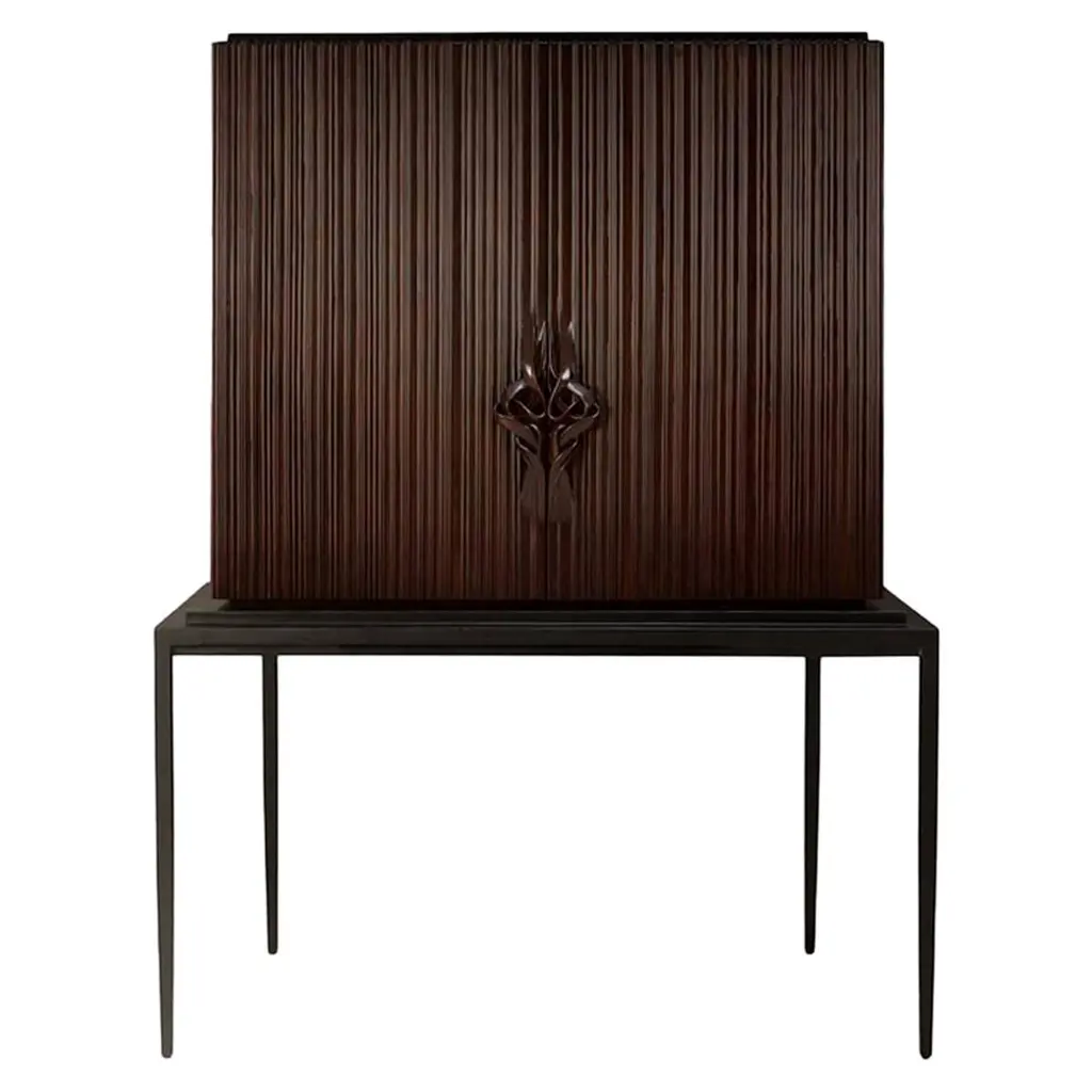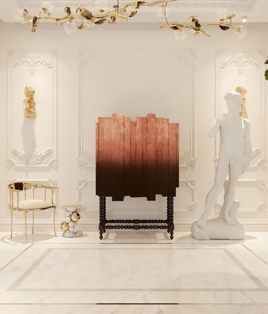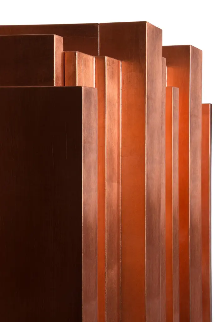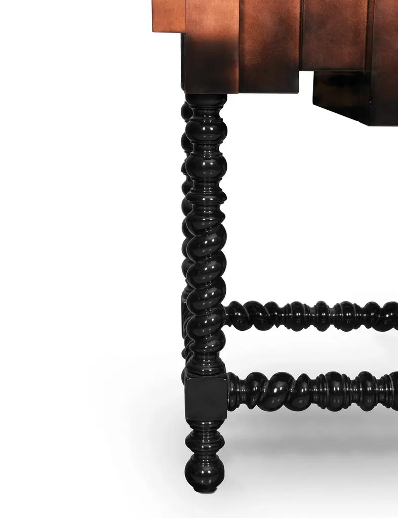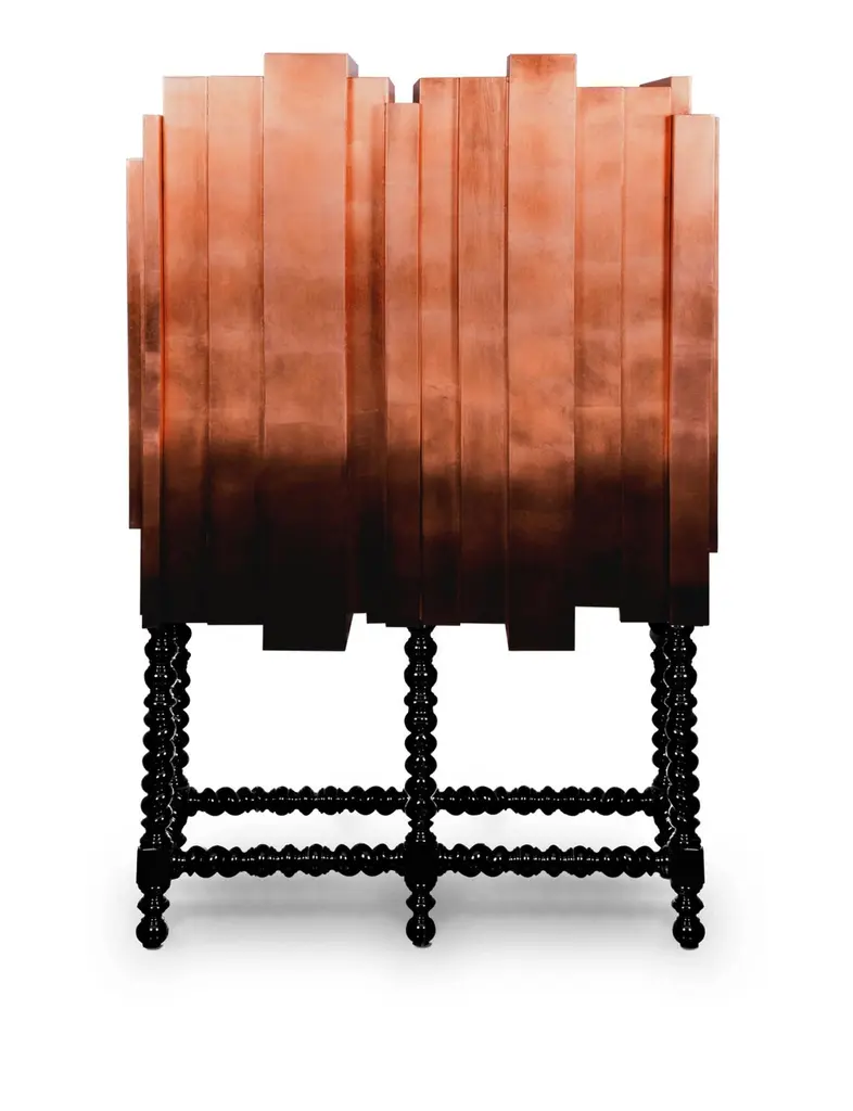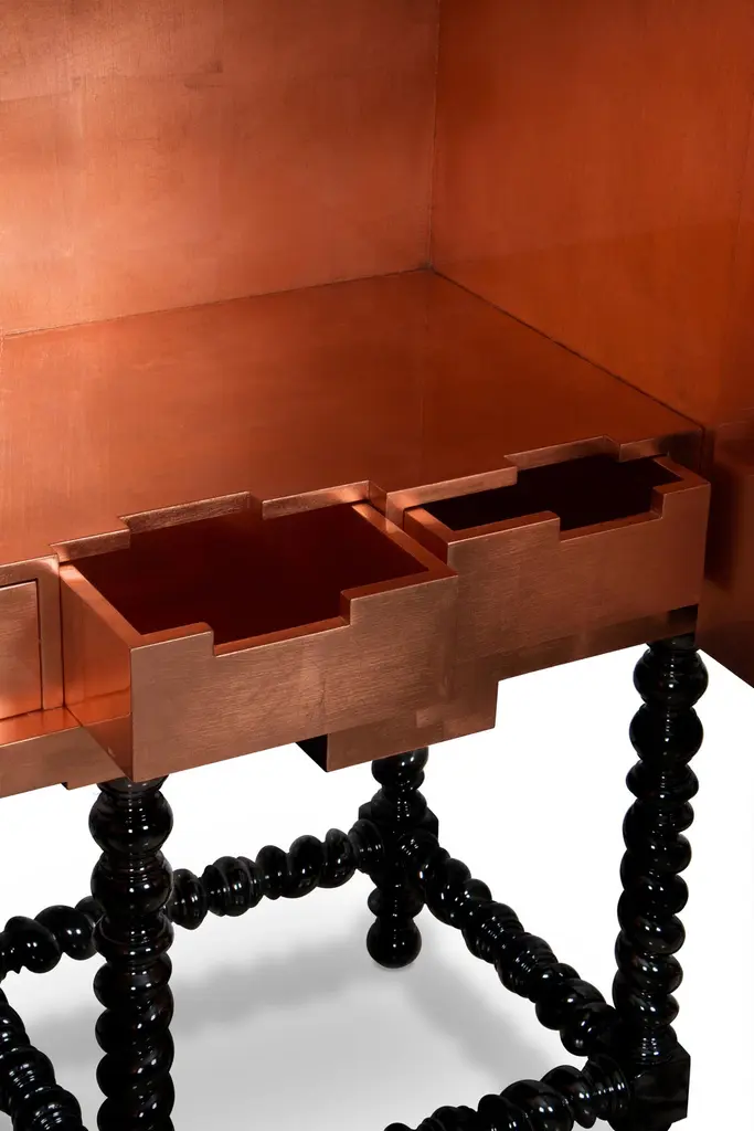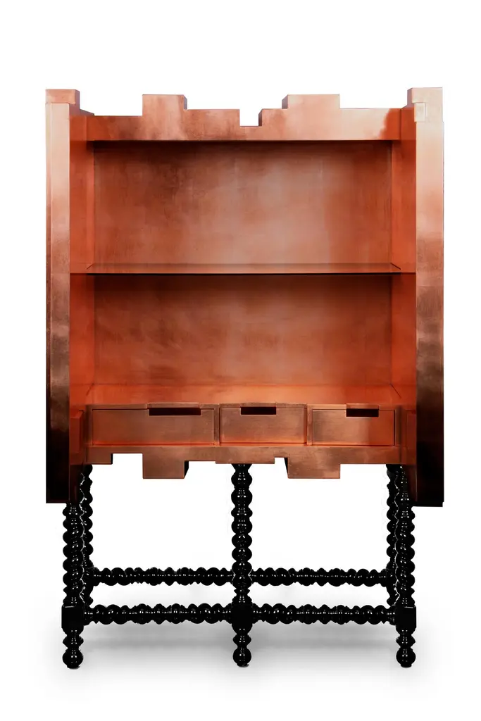 This unique and contemporary cabinet is inspired by the Manueline style, a style of architectural ornamentation of the first decades of the 16th century. A perfect symbiosis of innovative design and techniques with historic heritage. The body is made from wood and coated in copper leaf, finished with a black lacquer gradient that highlights its imposing architectural lines, causing the same impression as the first glimpse at a great cathedral. Two overlay doors give way to an interior lined in copper that boasts a glass shelf and a set of four drawers. In absolute contrast with the modern body of this statement piece, the legs are carved from solid mahogany and it features a turned twist style, making the D. Manuel a versatile cabinet for either classical rooms or modern houses.