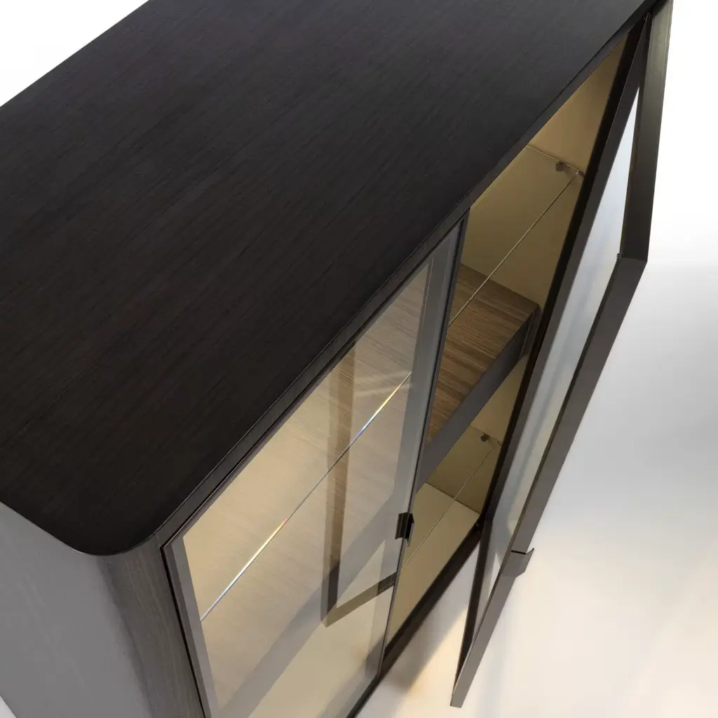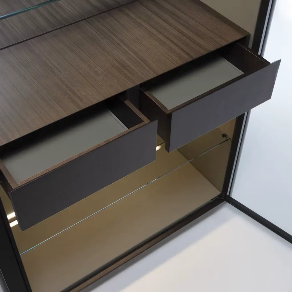 Glass cabinet with an elegant linear design. The external structure is embellished by the covering in dark Tay and by the detail of the rounded corners. The interior is characterized by the quality of the details, internal drawers in dark Tay, internal structure covered in leather, mirrored back panel and doors with aluminum profile. This piece is also available with an internal lighting system upon request.