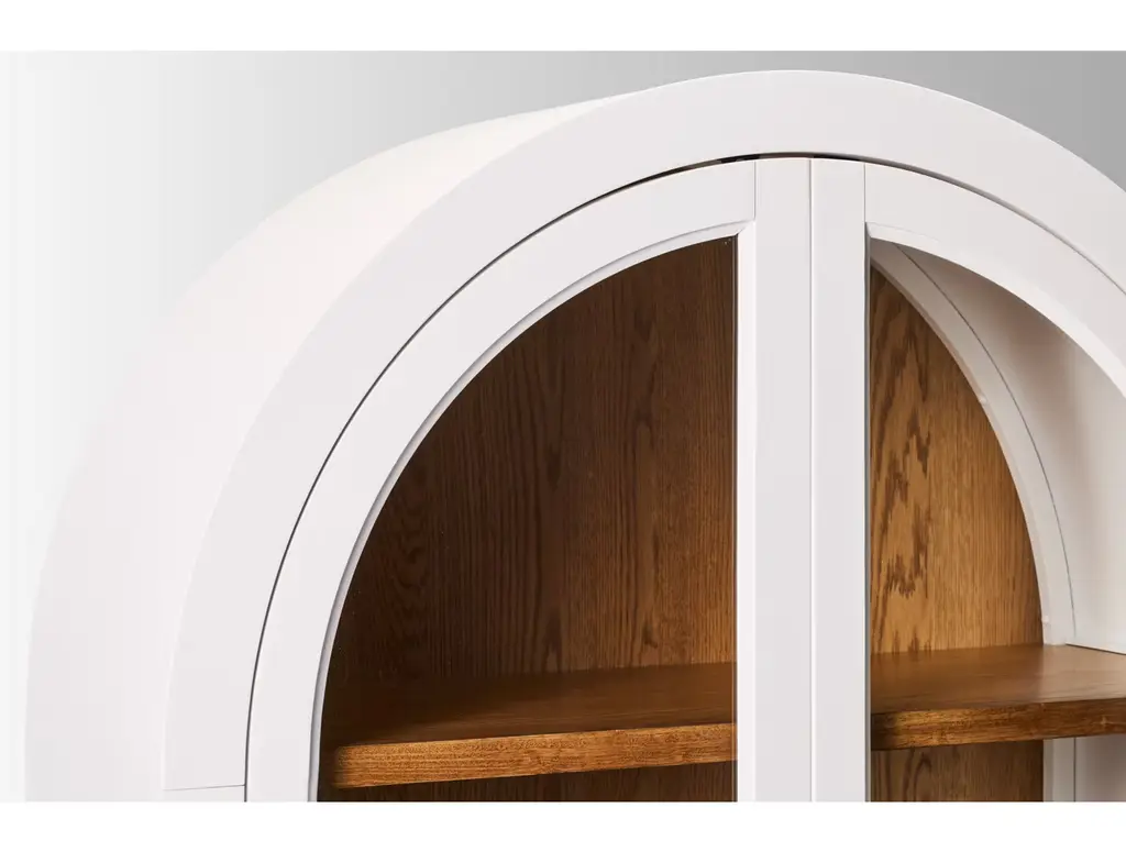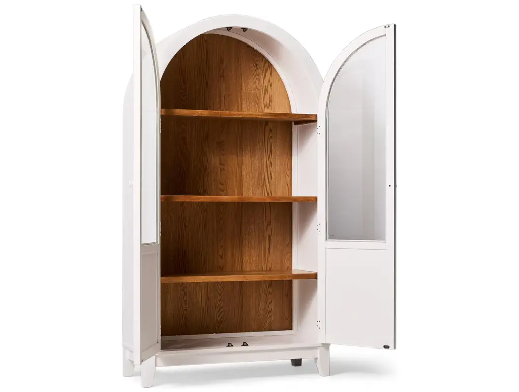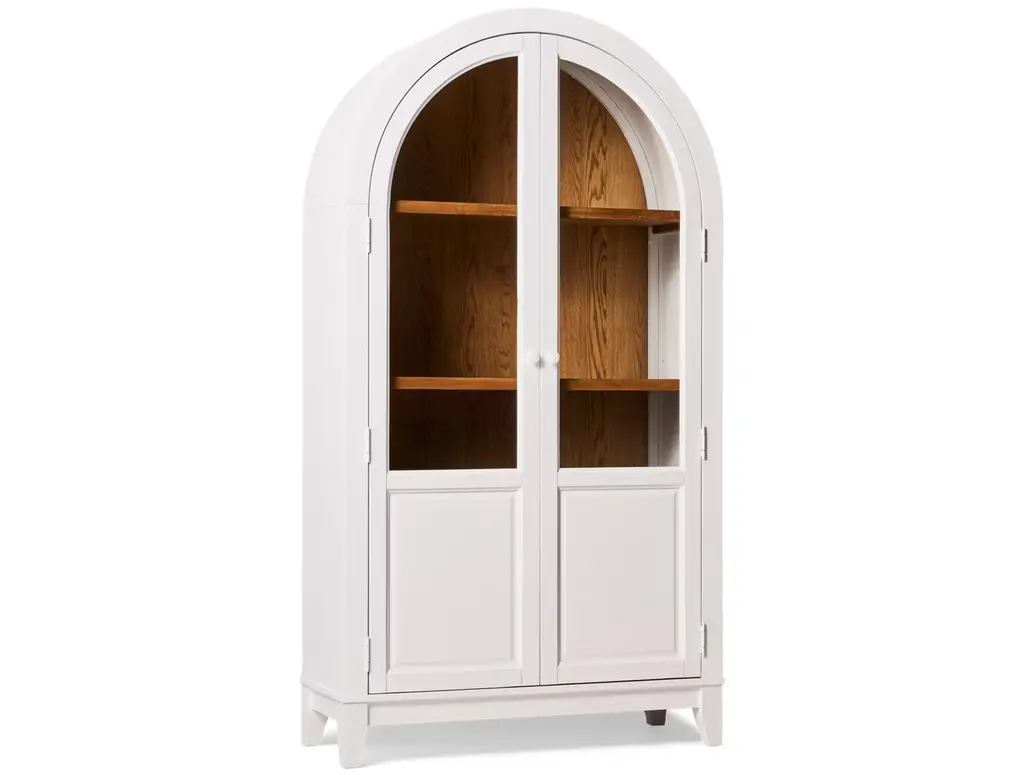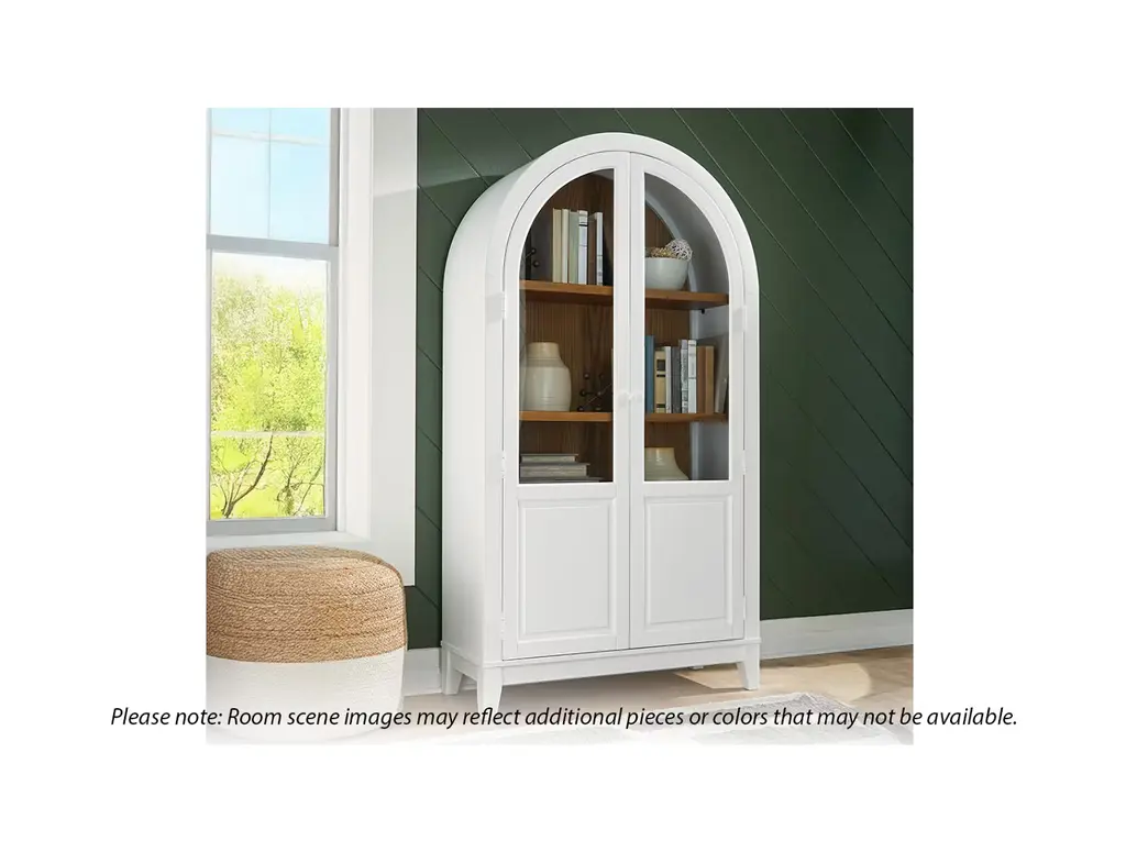 Display your souvenirs and treasures inside the Ashley Dagandale Accent Cabinet. This statement-making pieces boasts an arched top and tapered square legs. The two glass-front doors are solid paneled at the bottom to hide items you don't wish to display. Two fixed and one adjustable shelf give you many storage and display options.