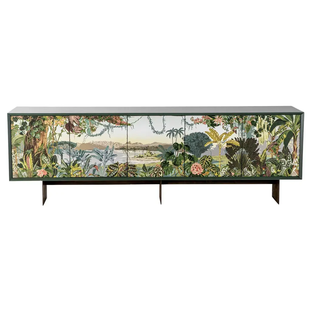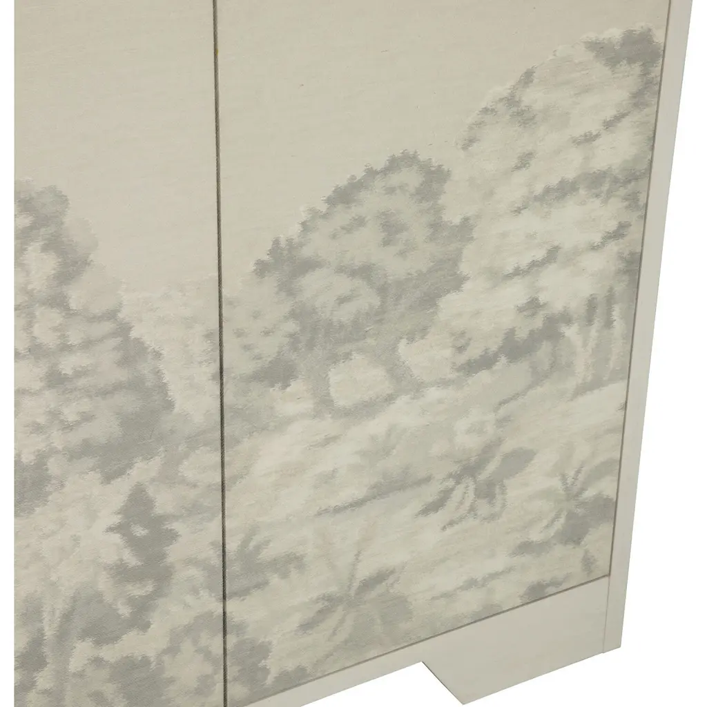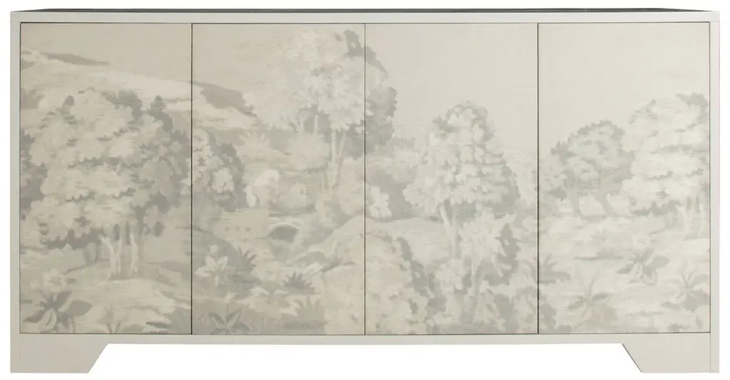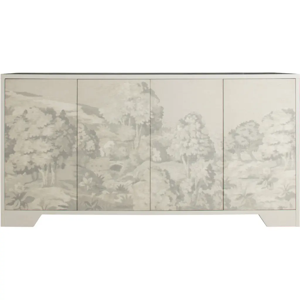The Daliyah Sideboard is a modern, tall piece that stands out with its simple geometric silhouette, designed to accentuate its front and sides. These surfaces are wrapped in a custom fabric that portrays a classic and traditional landscape in soft neutral tones, inspired by French tapestries, adding an artistic and sophisticated touch. With four doors, this sideboard offers ample storage space, making it not only a stunning decorative element but also a practical solution for keeping essentials organized. It's an ideal choice for those looking to add a piece with both functional value and a unique aesthetic appeal to their home.