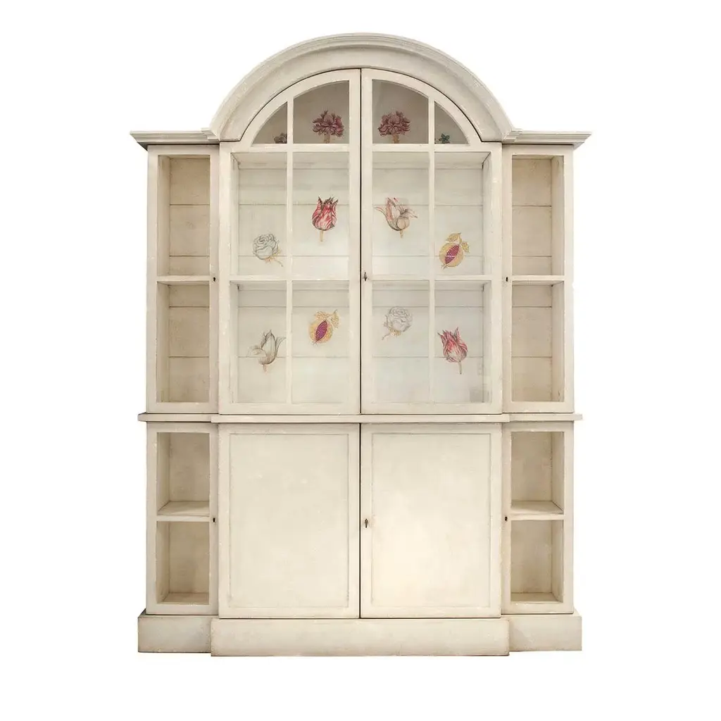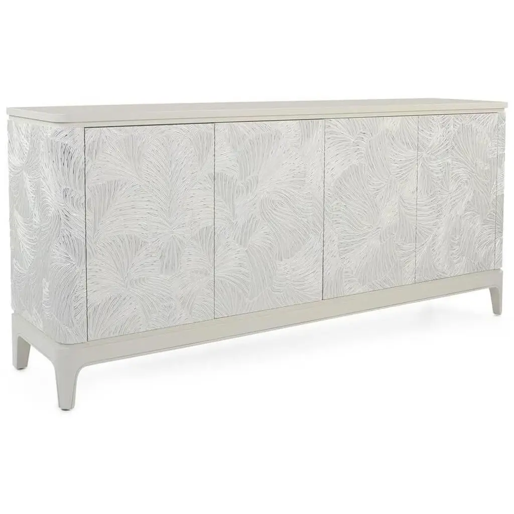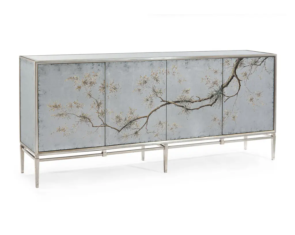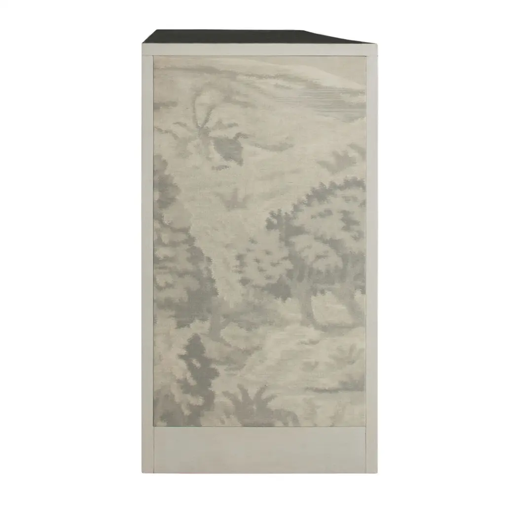 The Daliyah Sideboard is a modern, tall piece that stands out with its simple geometric silhouette, designed to accentuate its front and sides. These surfaces are wrapped in a custom fabric that portrays a classic and traditional landscape in soft neutral tones, inspired by French tapestries, adding an artistic and sophisticated touch. With four doors, this sideboard offers ample storage space, making it not only a stunning decorative element but also a practical solution for keeping essentials organized. It's an ideal choice for those looking to add a piece with both functional value and a unique aesthetic appeal to their home.