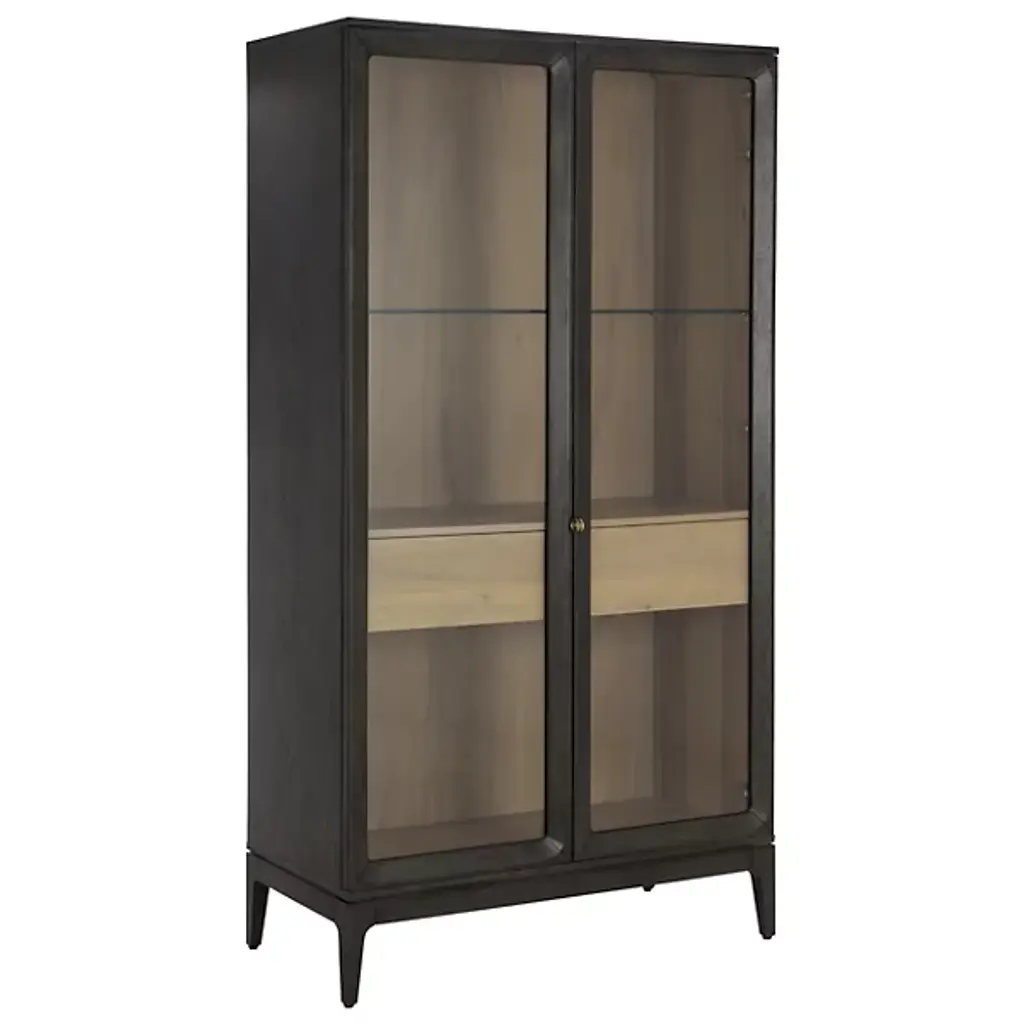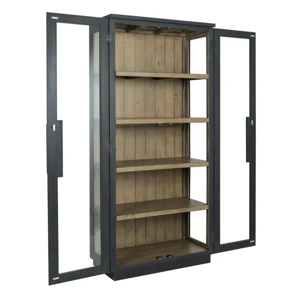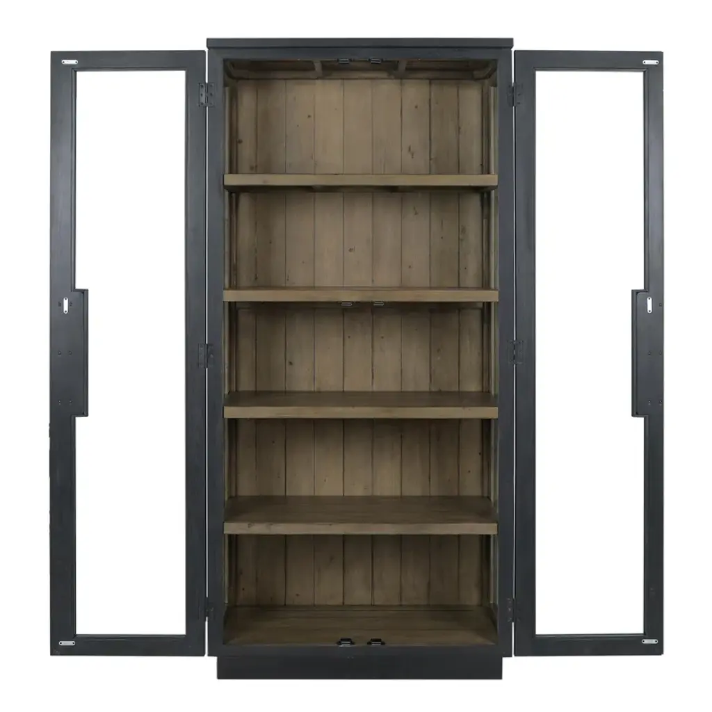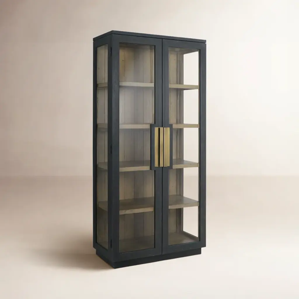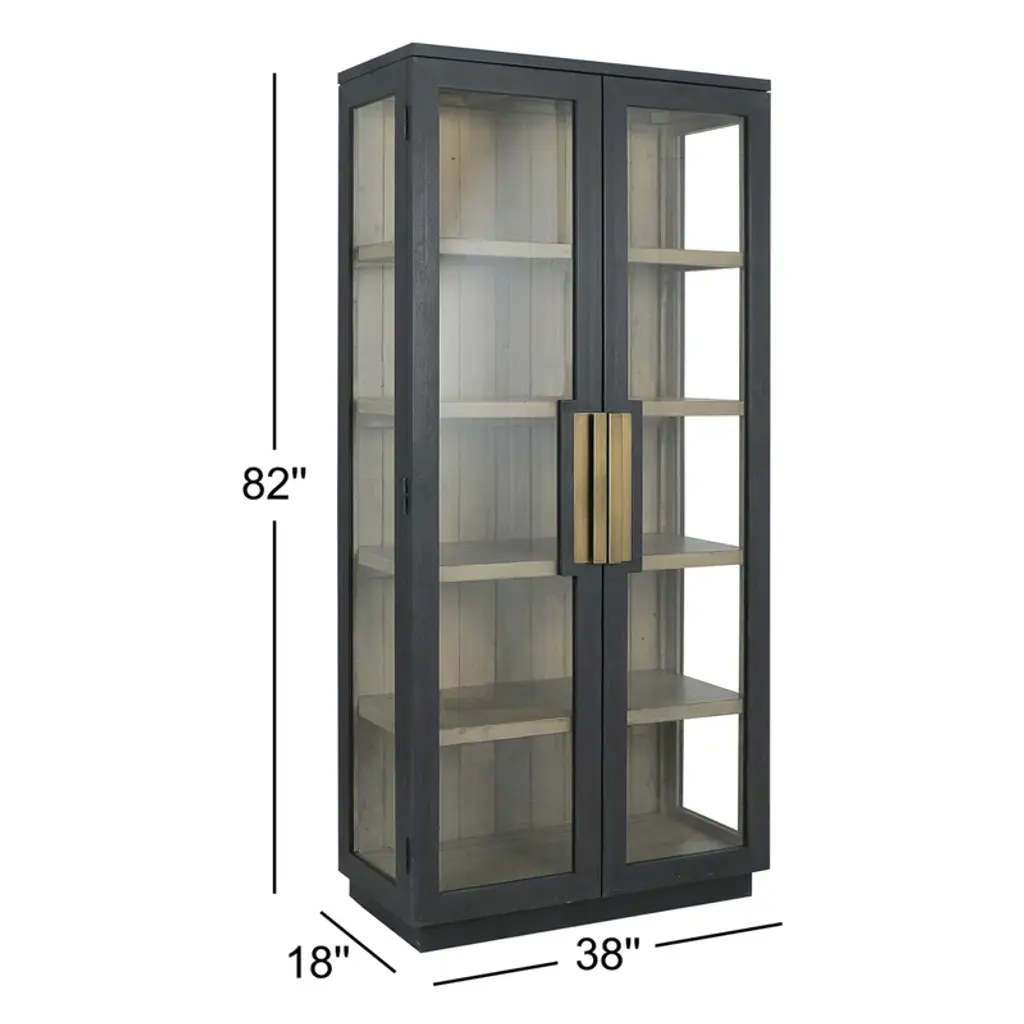 Combining traditional cabinet design and reclaimed pine wood with chic brass hardware, this piece demonstrates the dynamic beauty that occurs when old meets new. Tempered glass doors add shine to the look, and make this cabinet an ideal display and storage space for kitchenware, books and games, or beloved collectibles.