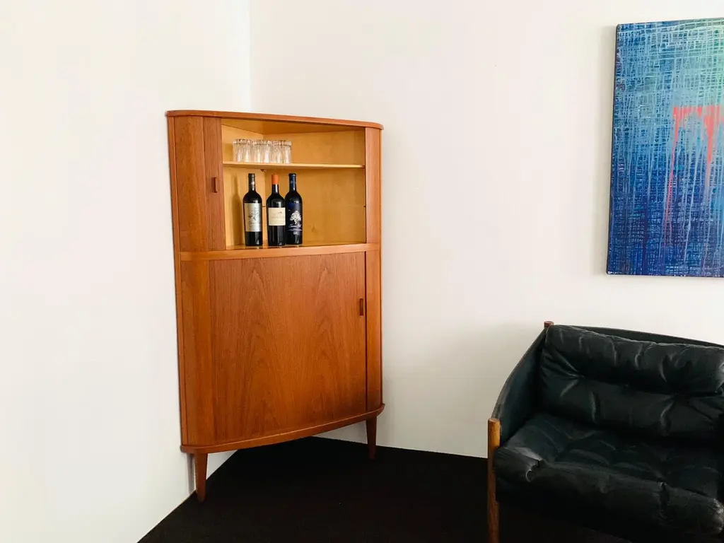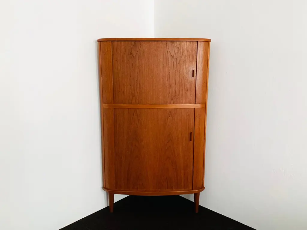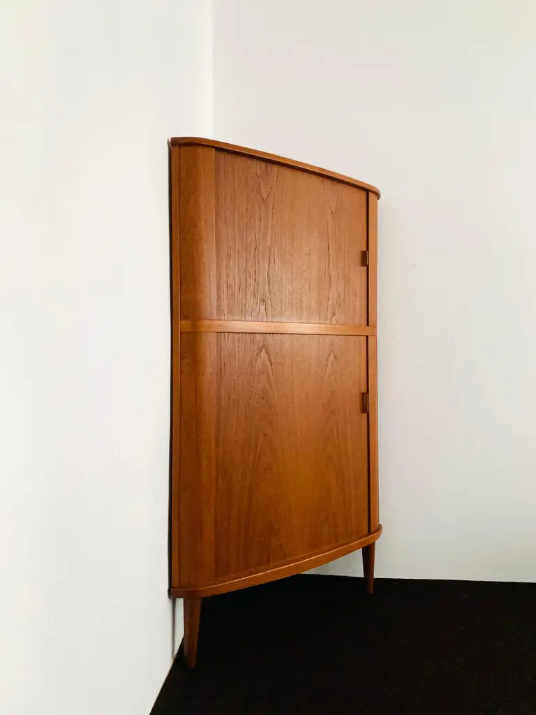 Exceptionally beautiful Danish teak corner cabinet from the 1960s.The high-quality workmanship and the elegant design make the corner cabinet a real favourite.Design: Arne Hovmand-OlsenManufacturer: Skovmand and AndersenCondition:Very good vintage condition with slight signs of wear consistent with age.The photos are part of the description.Dimensions:Side length: 66 cm/ 25.98 in.Overall height: 155cm/ 61.02in.Storage space below height: 73.5 cm/ 28.94 in.Height storage space above: 50.5 cm/ 19.88 in.Depth: 55cm/ 21.65in.Width front: 94 cm/ 37.01 in.