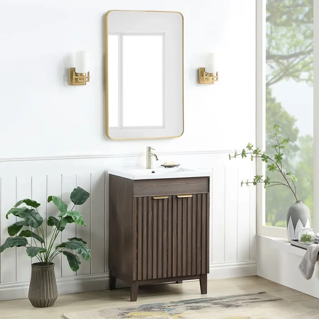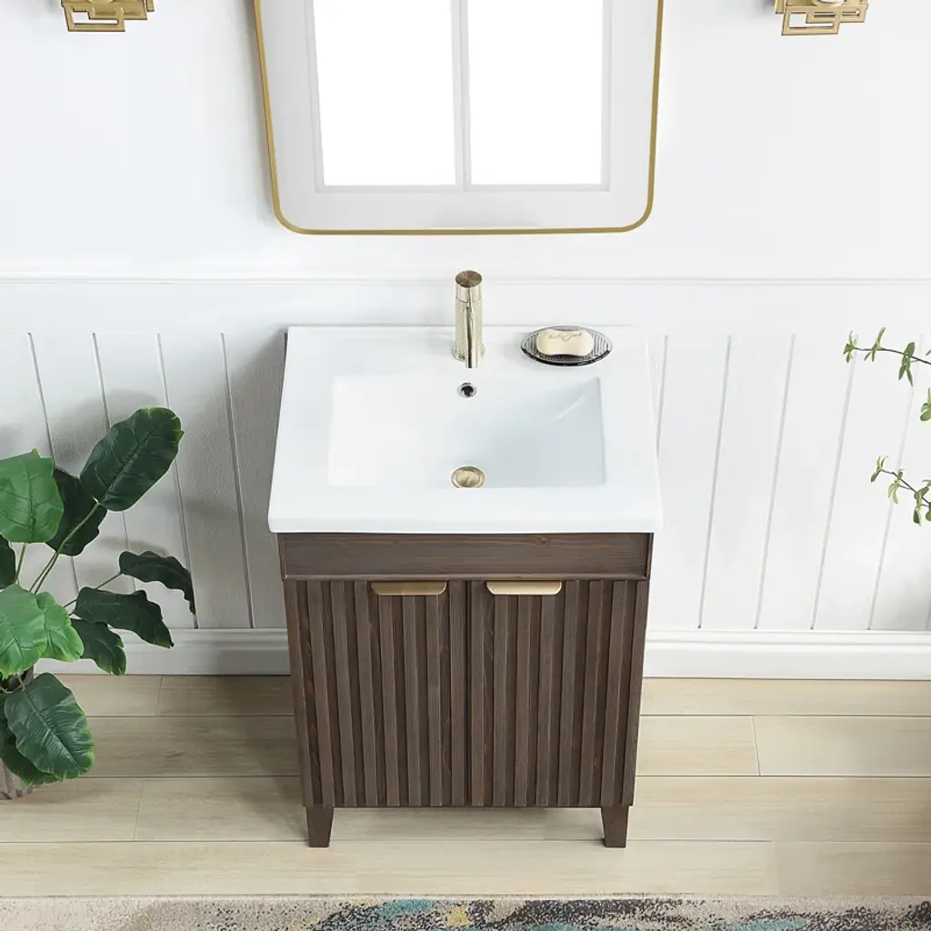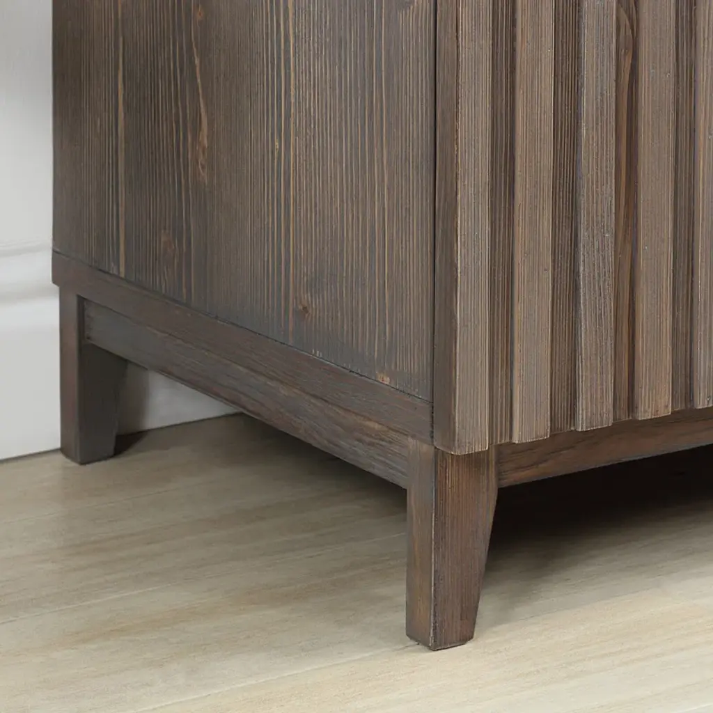 Our Pottorff Series Vanity—ruggedly crafted from fine solid wood and available in a trio of stunning finishes—embodies the elegance of minimalist design. It features ample storage space concealed behind grooved cabinet doors, making organizing your essentials effortless. A white drop-in white ceramic basin provides a bold pop of contrast with the textured wood to complete the contemporary look.