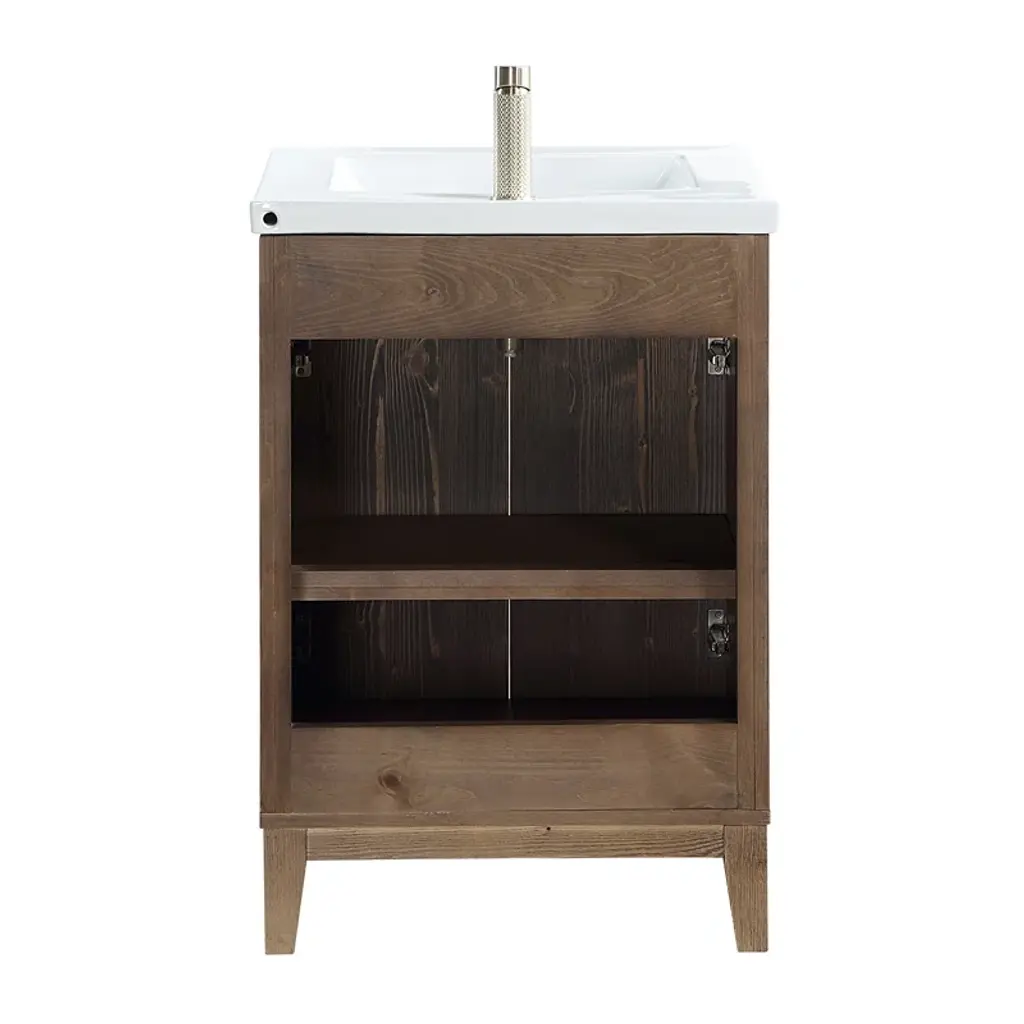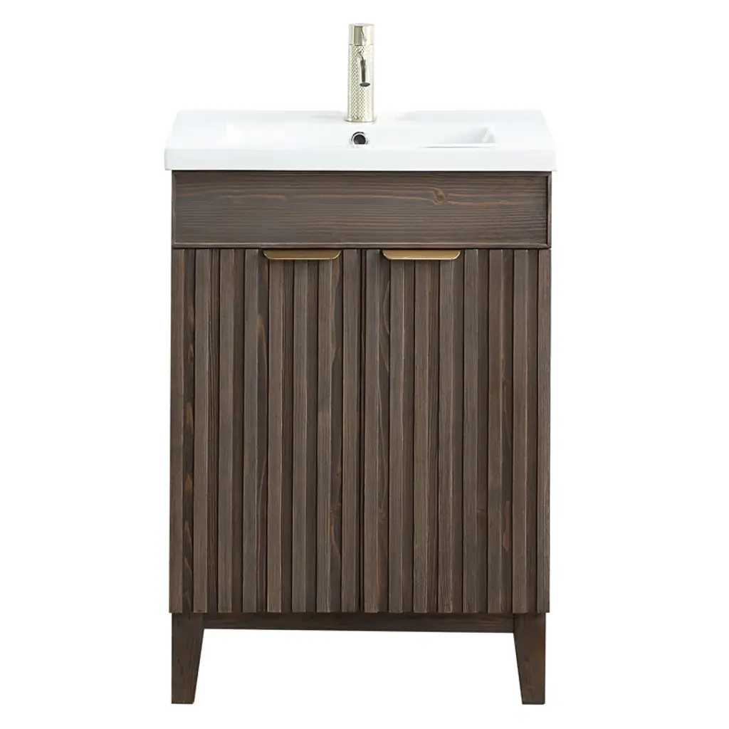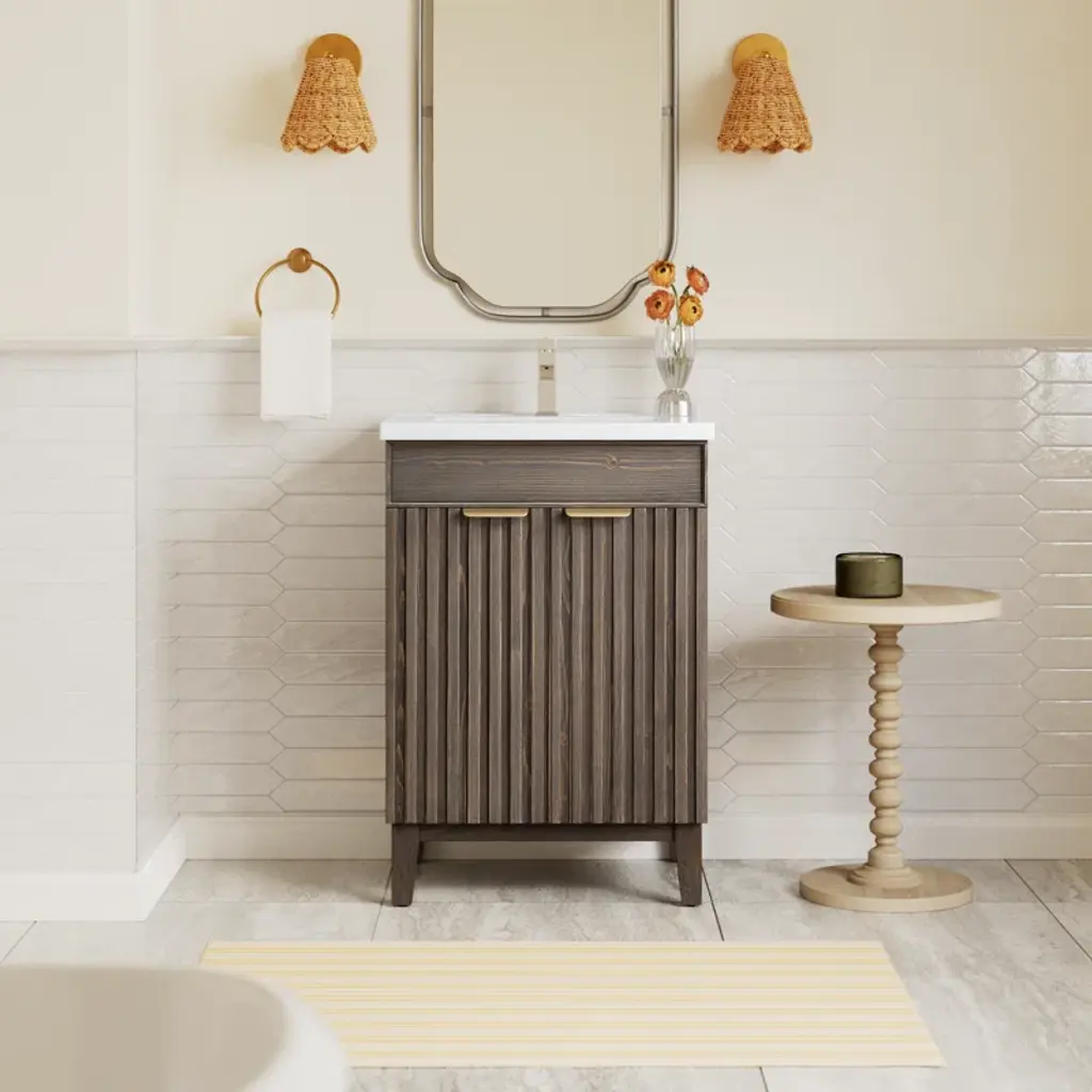 Our Pottorff Series Vanity—ruggedly crafted from fine solid wood and available in a trio of stunning finishes—embodies the elegance of minimalist design. It features ample storage space concealed behind grooved cabinet doors, making organizing your essentials effortless. A white drop-in white ceramic basin provides a bold pop of contrast with the textured wood to complete the contemporary look.