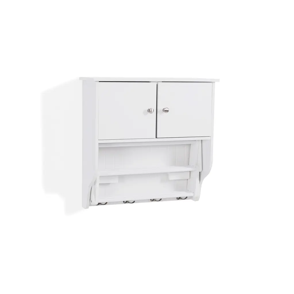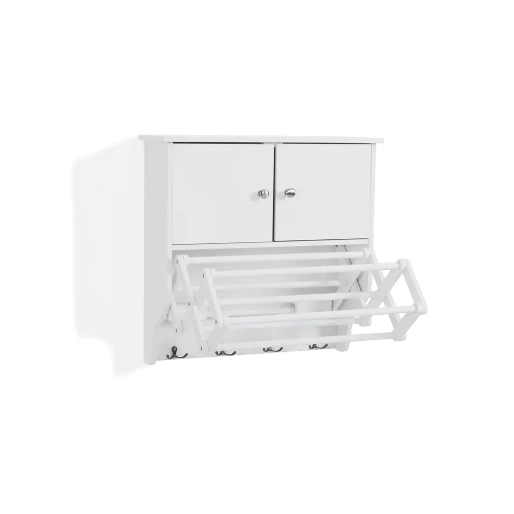 Organize your laundry space with this cabinet featuring a collapsible accordion drying rack with seven drying rods and four double metal hooks. Put your laundry supplies away in and atop the cabinet, and hang your delicate items up to dry on the rack or hooks, which may also be used for hanging stored items such as backpacks or sporting equipment.
