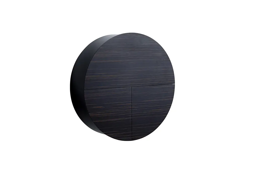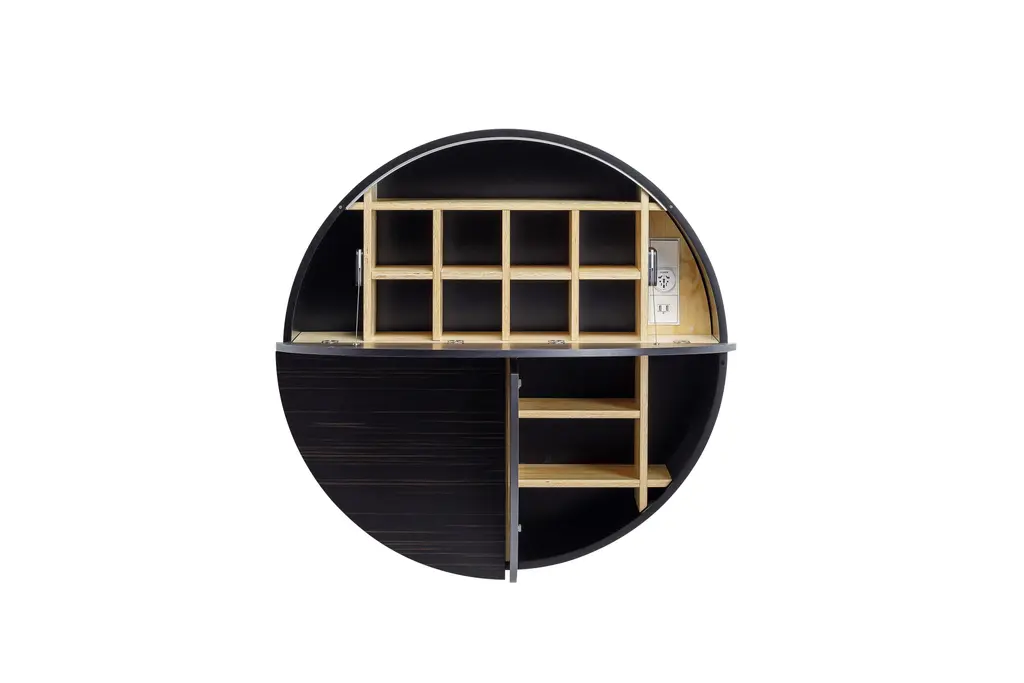 The Multifunctional Pill works great in the treatment against clutter and messy environments. It is a round cabinet that is fixed to a wall and can instantly transform into a fully-functional working place, dressing table, even a bar! Attach it at standard table height, a bit higher or a bit lower – it’s your choice. The shelving system inside is designed with the idea to allow the user to change and adapt it easily: it can fit a laptop, standard files, catalogues, books or any other personal belongings. Furthermore, the Pill comes equipped with sockets and the option of integrating LED lights. The materials and the fittings used in the manufacturing provide a reliable desk transformation and tabletop stability. The Pill perfectly suits every kind of interior, enabling you to have a hidden space for your items. Labeled by Maker