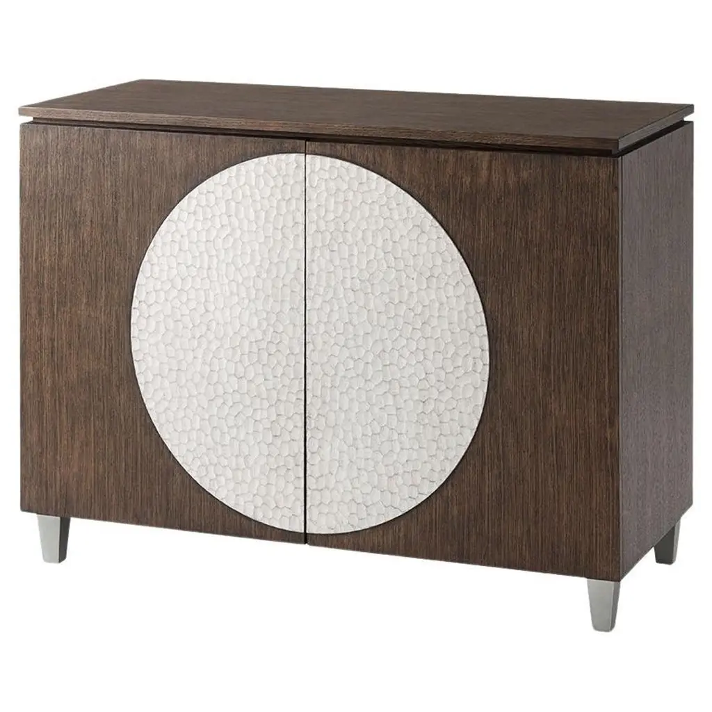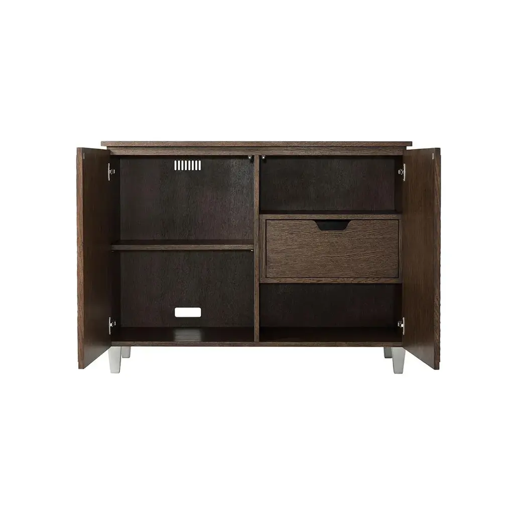 A brushed quartered oak veneer in a dark Charteris finish. With two cabinet doors enclosing one section with an adjustable shelf. The other section with a soft closing drawer and two open shelves. The central chip carved medallion in a complimentary light finish. Dimensions: 45" W x 20" D x 34" H