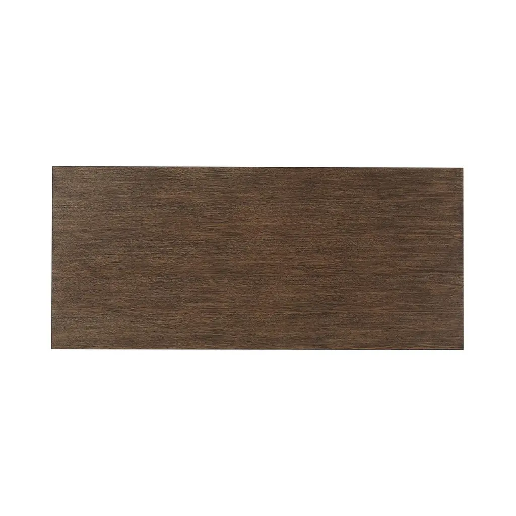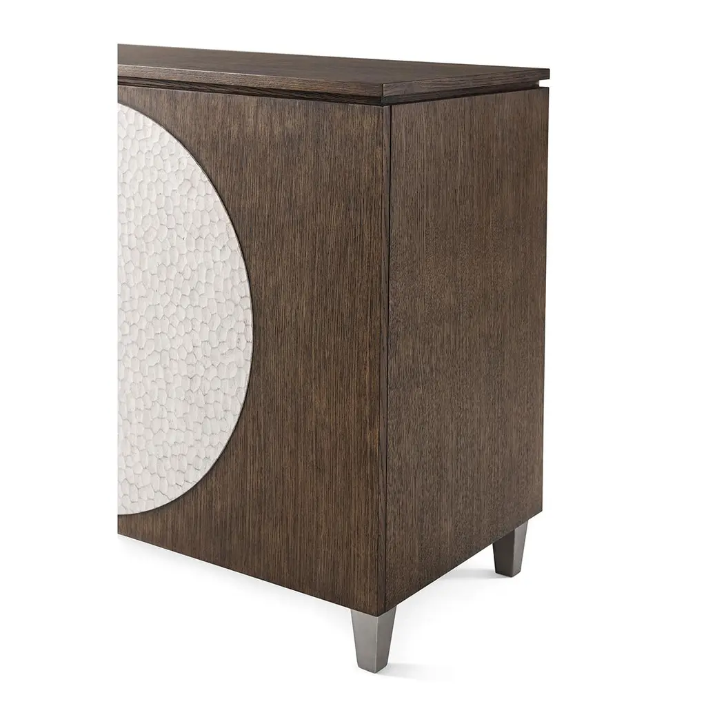 A brushed quartered oak veneer in a dark Charteris finish. With two cabinet doors enclosing one section with an adjustable shelf. The other section with a soft closing drawer and two open shelves.The central chip carved medallion in a complimentary light finish.Dimensions: 45" W x 20" D x 34" H