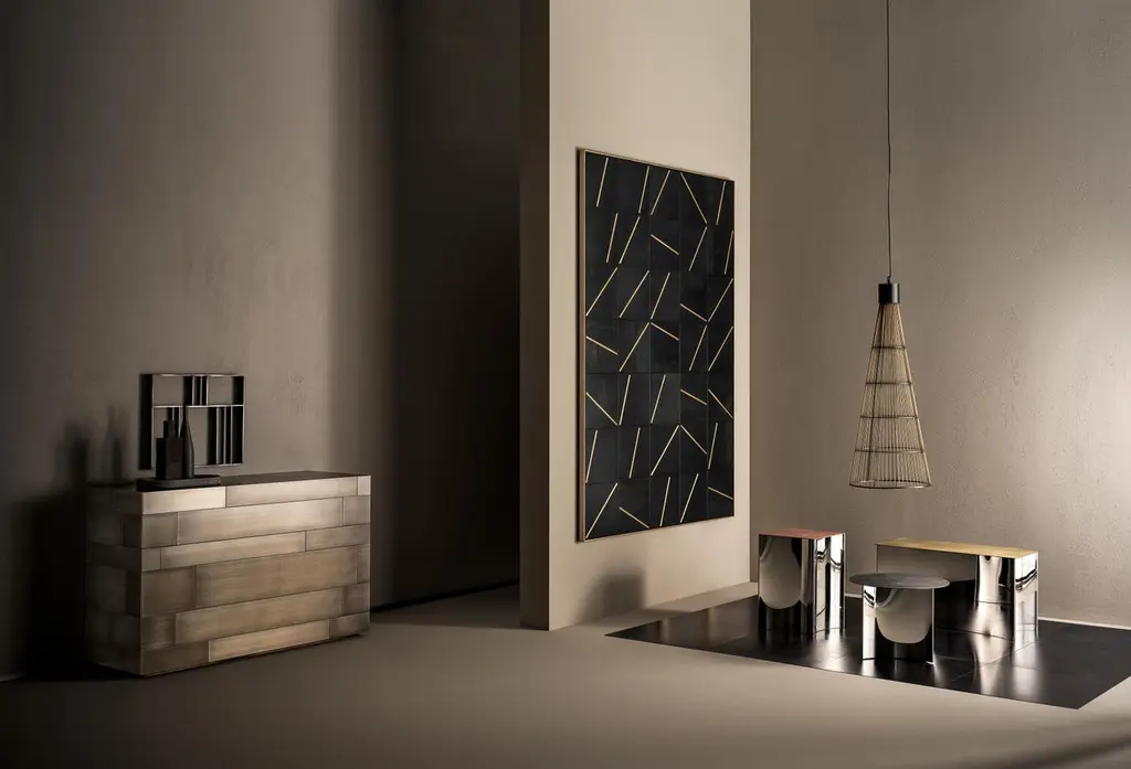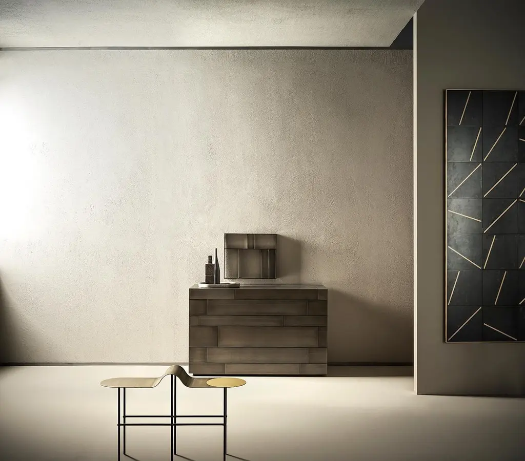 Celato is a reference to what is concealed to keep a memory intact; it’s an archetype in which beauty is revealed in stages. A monolithic appearance makes Celato a contemporary menhir; like a legend that tells of magnificent treasures safeguarded below sacred stones, Celato reveals its dual soul, with many internal, hidden, almost secret spaces. It combines several tesserae to form a whole: aesthetics, function and an incredible ability to make each piece unique, never identical to the next, which is revealed without impudence, walking an avant-garde line between tradition and modernity.Additional Information:Material: BrassFinish: Delabré Brass F2Dimensions: W. 130 x D. 46 x H. 82 cm Available in other finish options: Polished Stainless Steel D2, Delabré B Stainless Steel E5, Striped Delabré Stainless Steel E6, Delabré Brass F2, Orbitale Delabré Brass G3, Striped Delabré Brass G7, Orbitale Delabré Copper G4, Striped Delabré Copper G6, Delabré Copper G5