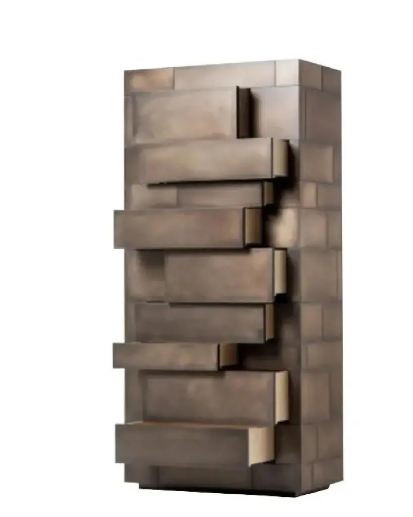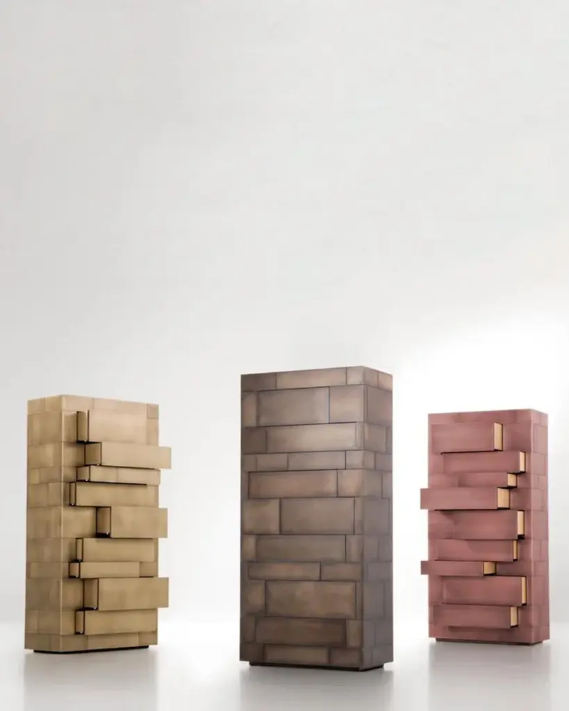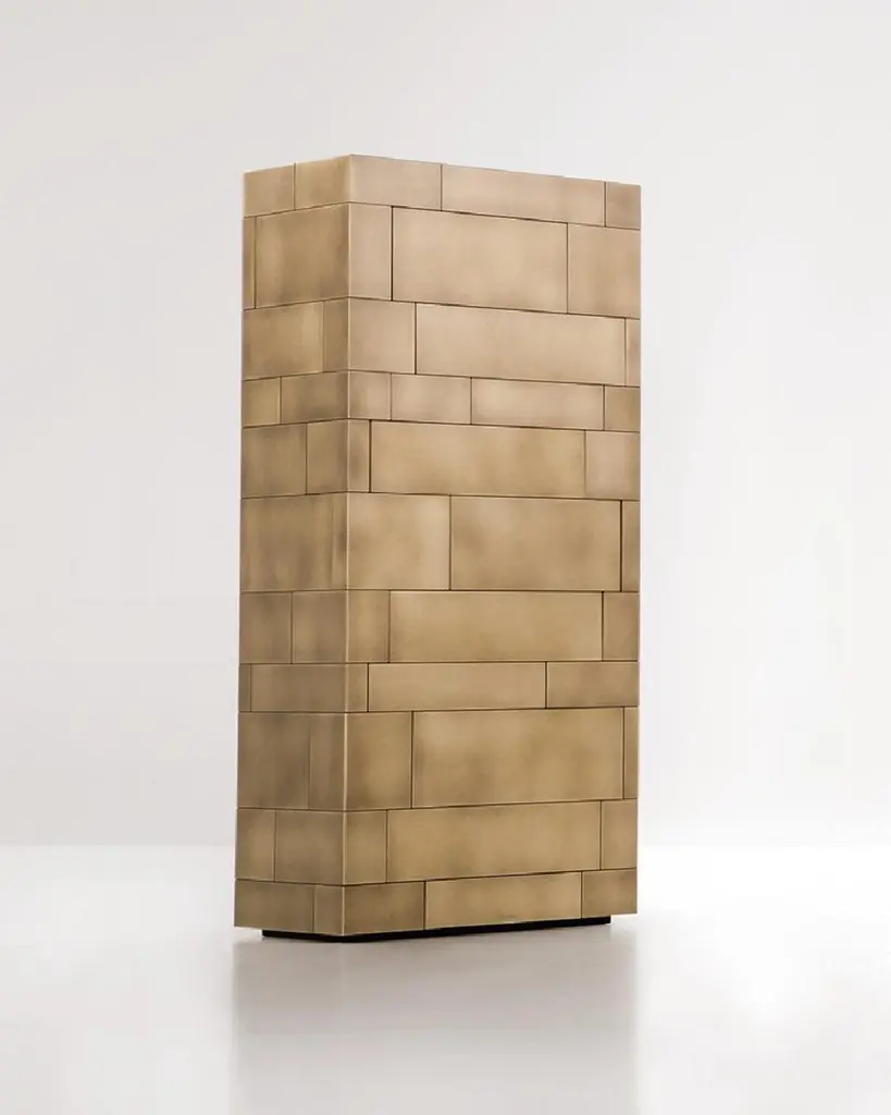Celato is a reference to what is concealed to keep a memory intact; it’s an archetype in which beauty is revealed in stages. A monolithic appearance makes Celato a contemporary menhir; like a legend that tells of magnificent treasures safeguarded below sacred stones, Celato reveals its dual soul, with many internal, hidden, almost secret spaces. It combines several tesserae to form a whole: aesthetics, function and an incredible ability to make each piece unique, never identical to the next, which is revealed without impudence, walking an avant-garde line between tradition and modernity.Additional Information:Material: BrassFinish: Orbitale delabré brassG3Dimensions: W. 75 x D. 40 x H. 162 cm Available in other finish options: Polished Stainless Steel D2, Delabré B Stainless Steel E5, Orbitale Delabré Stainless Steel G2, Striped Delabré Stainless Steel E6, Delabré Brass F2, Striped Delabré Brass G7, Orbitale Delabré Copper G4, Striped Delabré Copper G6, Delabré Copper G5
