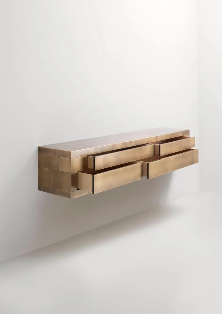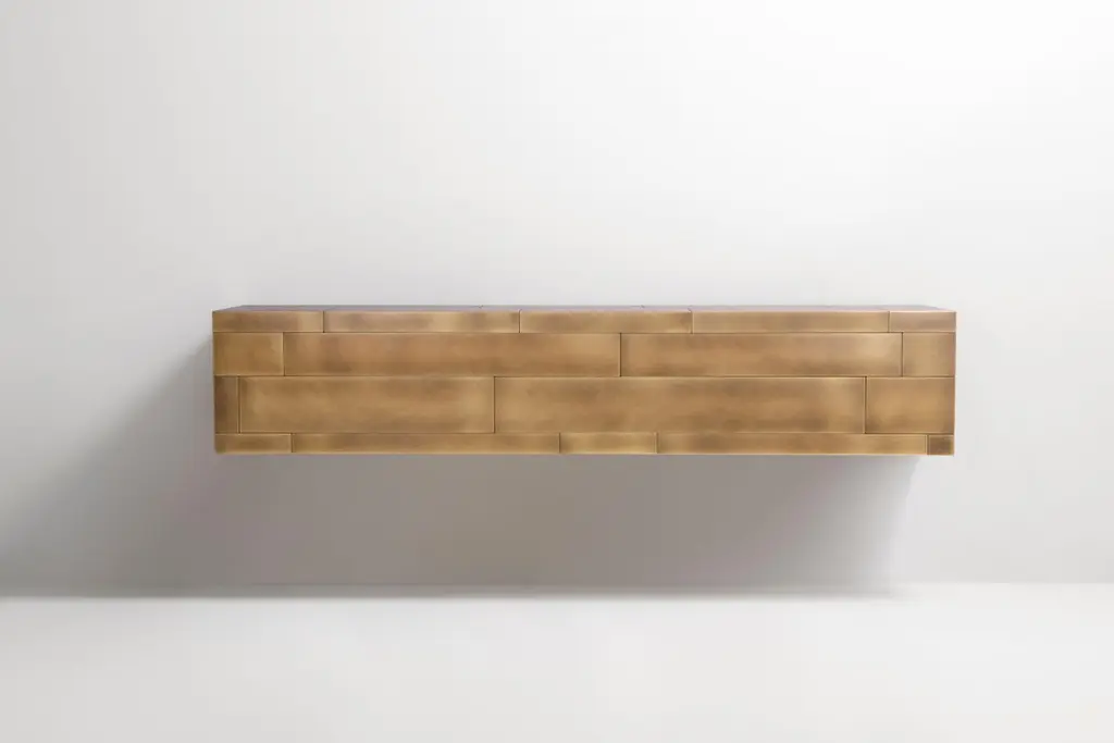 Celato is a reference to what is concealed to keep a memory intact; it’s an archetype in which beauty is revealed in stages. A monolithic appearance makes Celato a contemporary menhir; like a legend that tells of magnificent treasures safeguarded below sacred stones, Celato reveals its dual soul, with many internal, hidden, almost secret spaces. It combines several tesserae to form a whole: aesthetics, function and an incredible ability to make each piece unique, never identical to the next, which is revealed without impudence, walking an avant-garde line between tradition and modernity.Additional Information:Material: BrassFinish: Delabré Brass F2Dimensions: W. 220 x D. 45 x H. 45 cm Available in other finish options: Polished Stainless Steel D2, Delabré B Stainless Steel E5, Orbitale Delabré Stainless Steel G2, Striped Delabré Stainless Steel E6, Orbitale Delabré Brass G3, Striped Delabré Brass G7, Orbitale Delabré Copper G4, Delabré Copper G5, Striped delabré copper g6