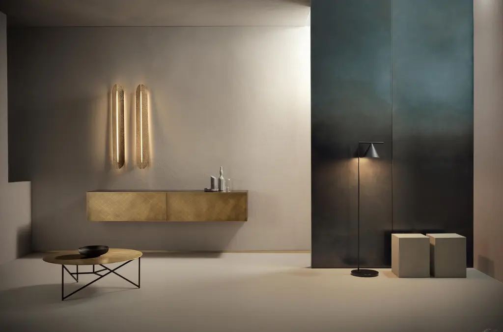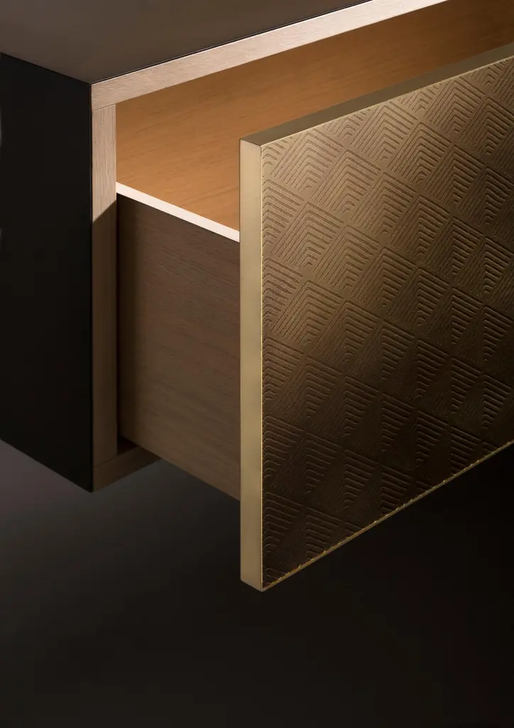 Clean volumes for a console with quite simple lines, emphasising the nobility of the metals that clad the large faces of the drawers. Available both in a hanging and free-standing version, Tako evokes the delicate decoration anointed by the DeErosion finish, for a vaguely-Japanese inspired pattern that filters light, modulating its reflections.Additional Information:Material: DeLabré B IronFinish: DeErosion H4 BrassDimensions: W. 220 x D. 41 x H. 35 cmAvailable in other pattern option: Delabré B Stainless Steel E5, Deerosion H2 Brass, Deerosion H2 Copper, Deerosion H5 Brass, Deerosion H5 Copper, Deerosion H6 Brass, Deerosion H6 Copper, Deerosion H7 Brass, Deerosion H7 Copper, Deerosion H3 Brass, Deerosion H3 Copper, Deerosion H4 CopperAlso available in other variation: 1 Drawer version