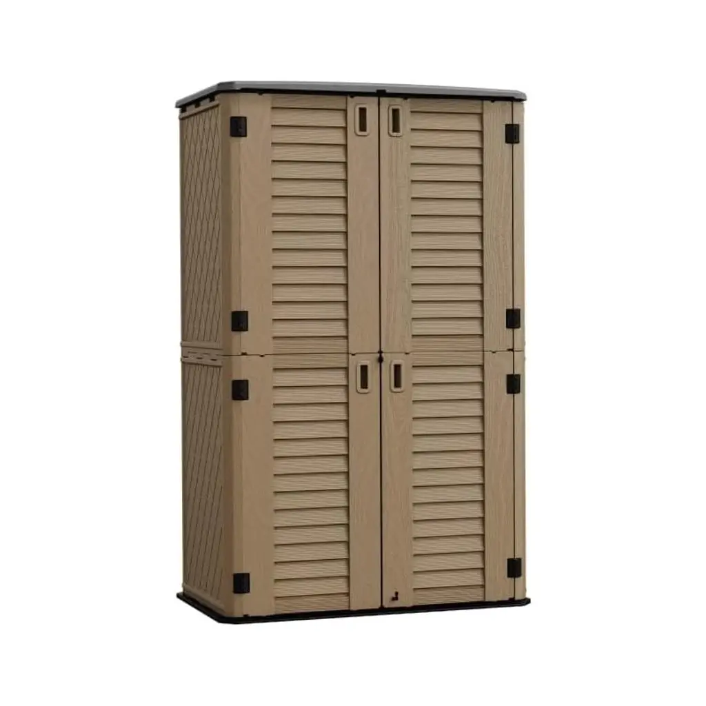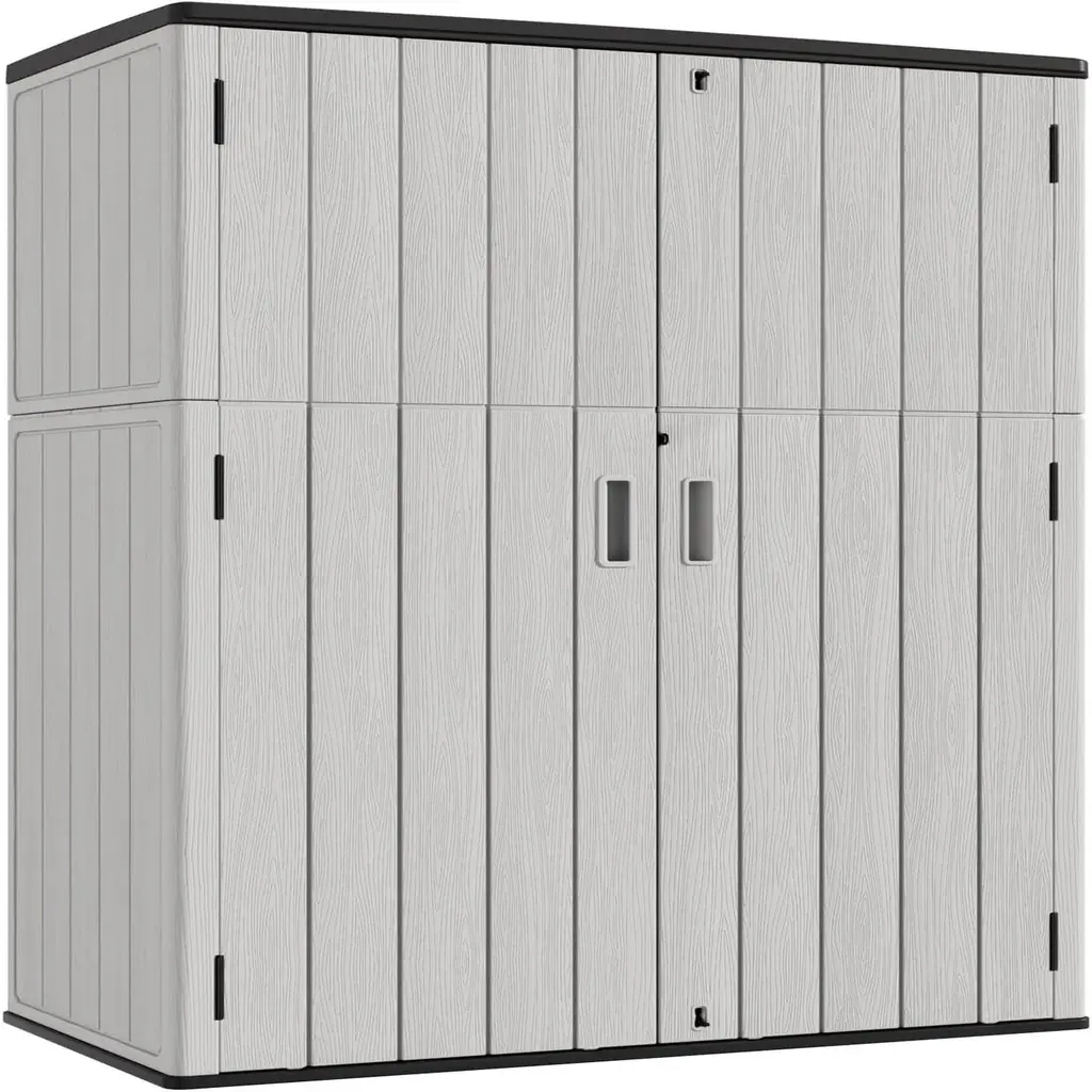 This vertical storage cabinet is designed for long-lasting durability and versatile use. Made from high-quality HDPE resin, it is weather-resistant, UV-protected, and colorfast, ensuring it won't peel, rot, or rust even in harsh conditions. The cabinet features a robust twin-wall panel construction, providing superior strength and resistance to wind and impact. With an external dimension of 50 in. W x 29.06 in. D x 79.53 in. ft., it offers ample space for storing a variety of household items such as lawnmowers, pool equipment, and children's toys. Suitable for both indoor and outdoor use, including balconies, yards, gardens, and patios. The roof gutter design ensures effective drainage, making it perfect for all-weather use. and enjoy its stylish European and American design that complements any setting