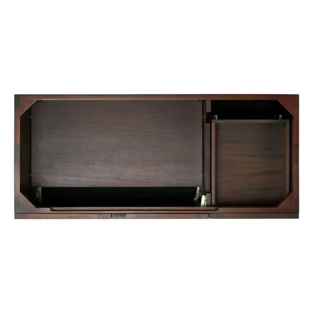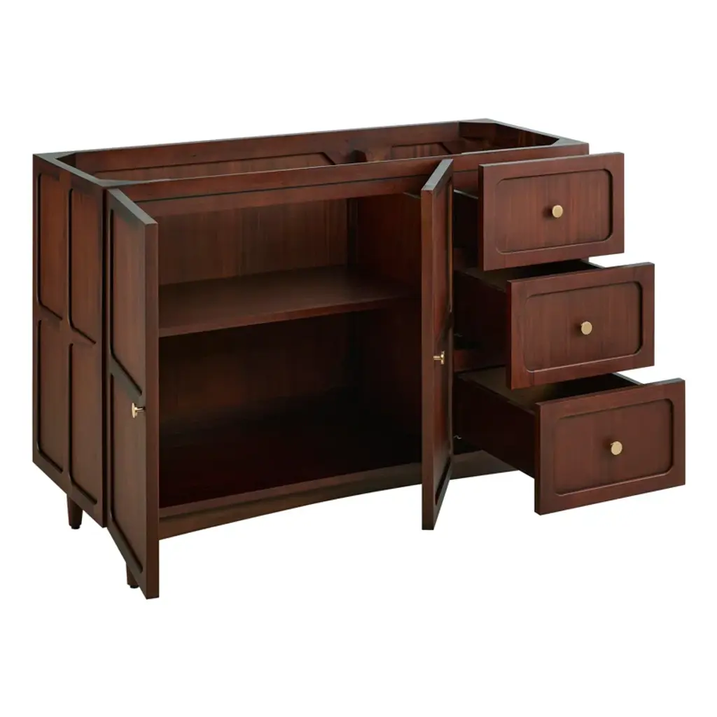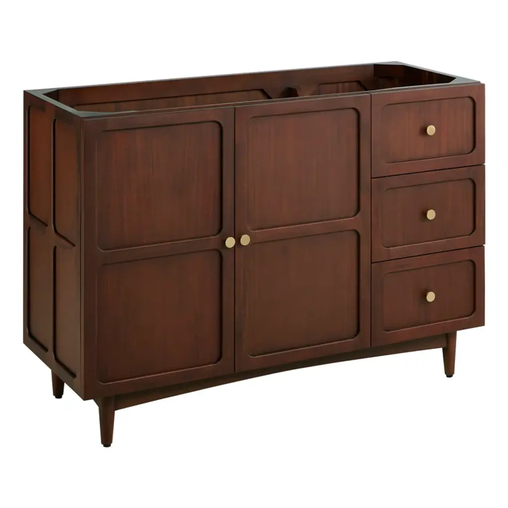 Elevate your bathroom on all levels with the 48" Delavan vanity with undermount sink. Boasting generous storage within three drawers and a cabinet, a user-focused design is complete with soft-closing entry points and an adjustable shelf. With durability and style to match, this solid mahogany build is given a rich finish and satin brass knobs for the most inviting effect. Adding unique dimension and retro flair, recessed paneling and peg legs round out the Delavan's eye-catching facade.