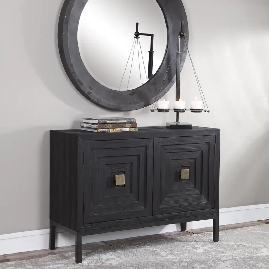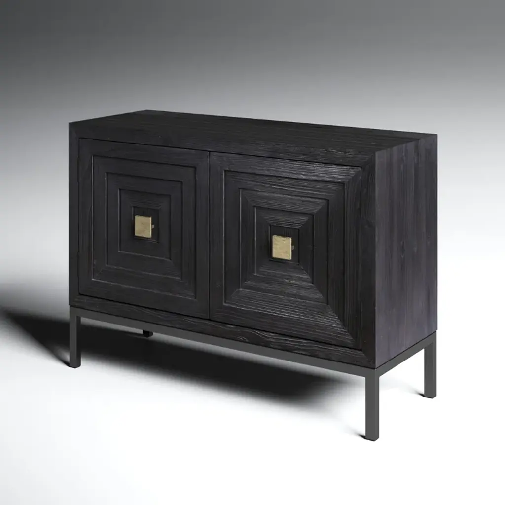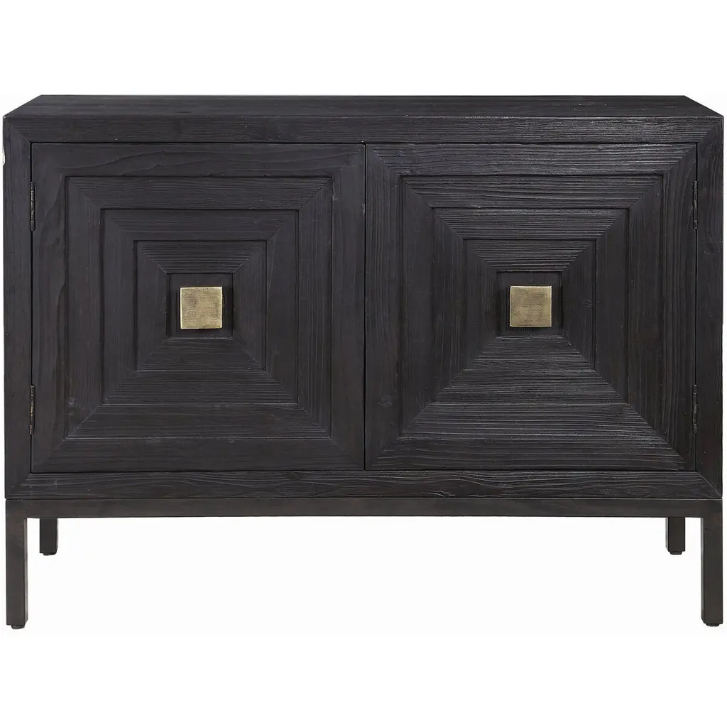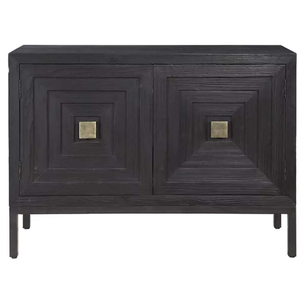 Brushed brass hardware and a dark ebony finish combine in this bold, elevated accent cabinet. It's crafted from solid and engineered wood and sits on a metal frame with four straight legs. A spacious tabletop offers a place to store a vase of flowers, an accent lamp, or a bowl to catch your keys, wallet, and other out-the-door essentials. We especially love the two door fronts, which feature a textured square pattern that adds depth and visual intrigue to this otherwise simple design. Two interior shelves offer additional out-of-sight storage. Plus, it arrives fully assembled.
