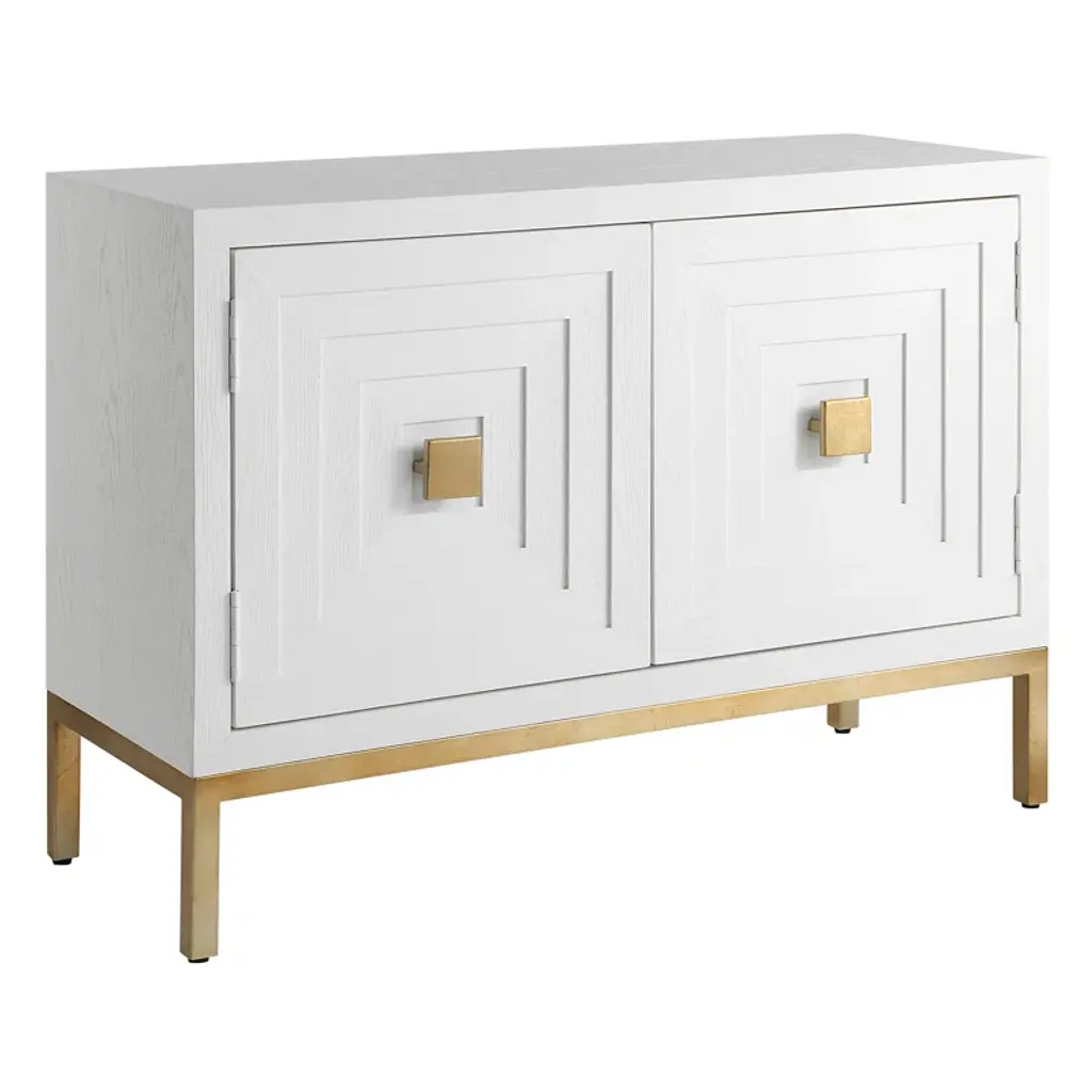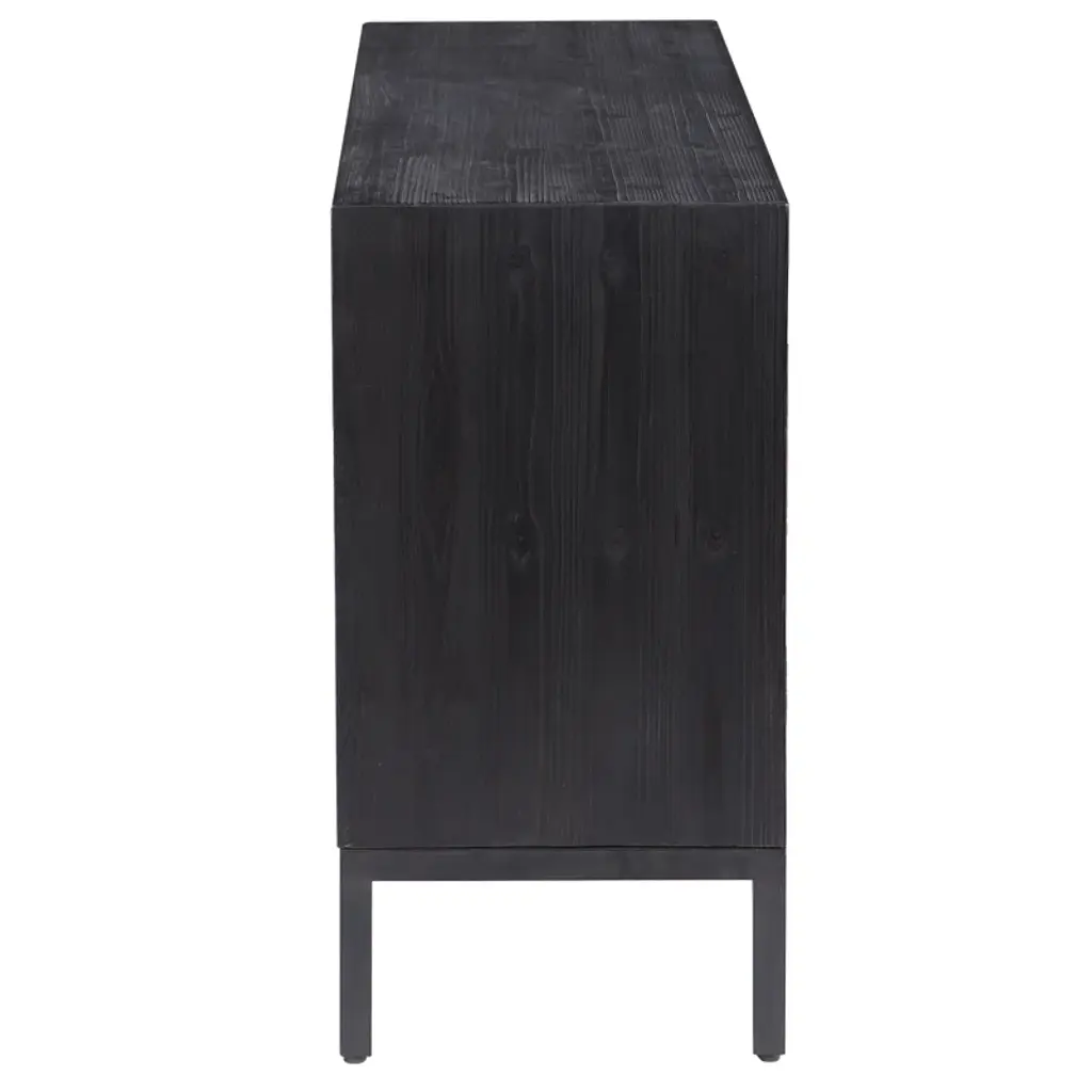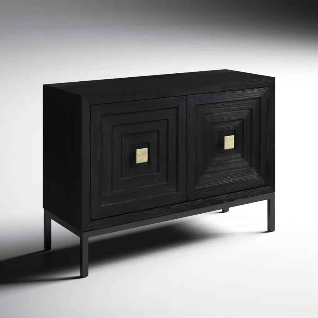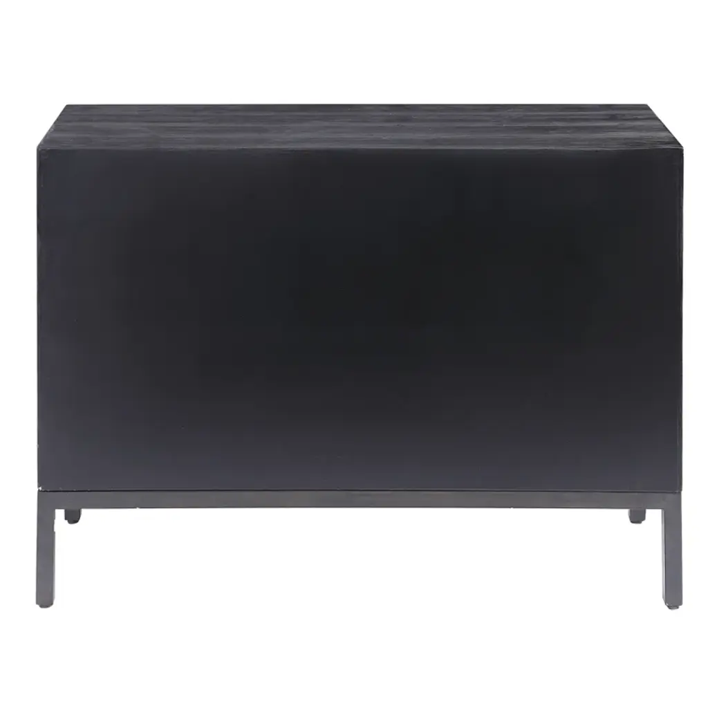 Brushed brass hardware and a dark ebony finish combine in this bold, elevated accent cabinet. It's crafted from solid and engineered wood and sits on a metal frame with four straight legs. A spacious tabletop offers a place to store a vase of flowers, an accent lamp, or a bowl to catch your keys, wallet, and other out-the-door essentials. We especially love the two door fronts, which feature a textured square pattern that adds depth and visual intrigue to this otherwise simple design. Two interior shelves offer additional out-of-sight storage. Plus, it arrives fully assembled.