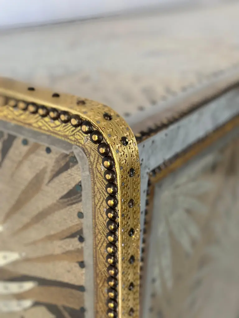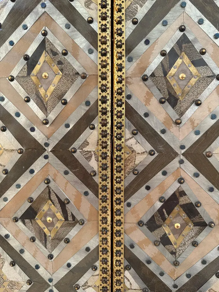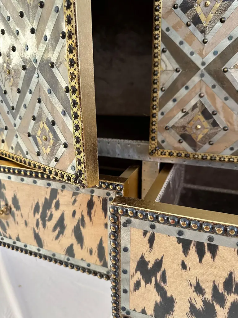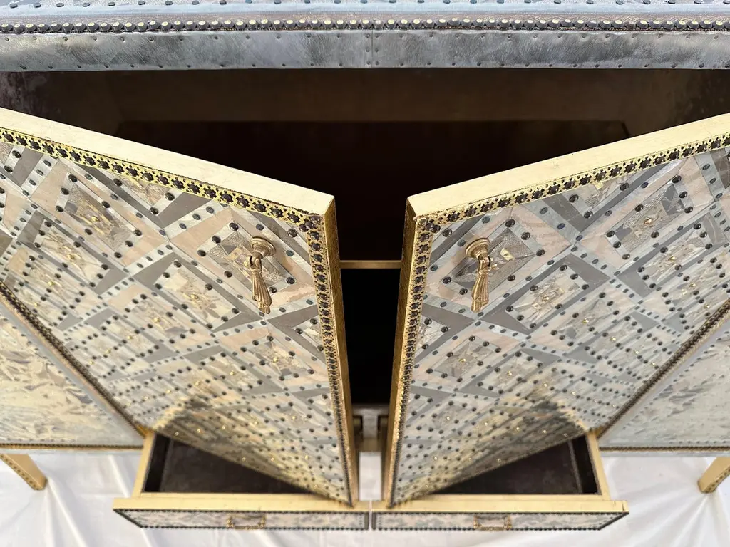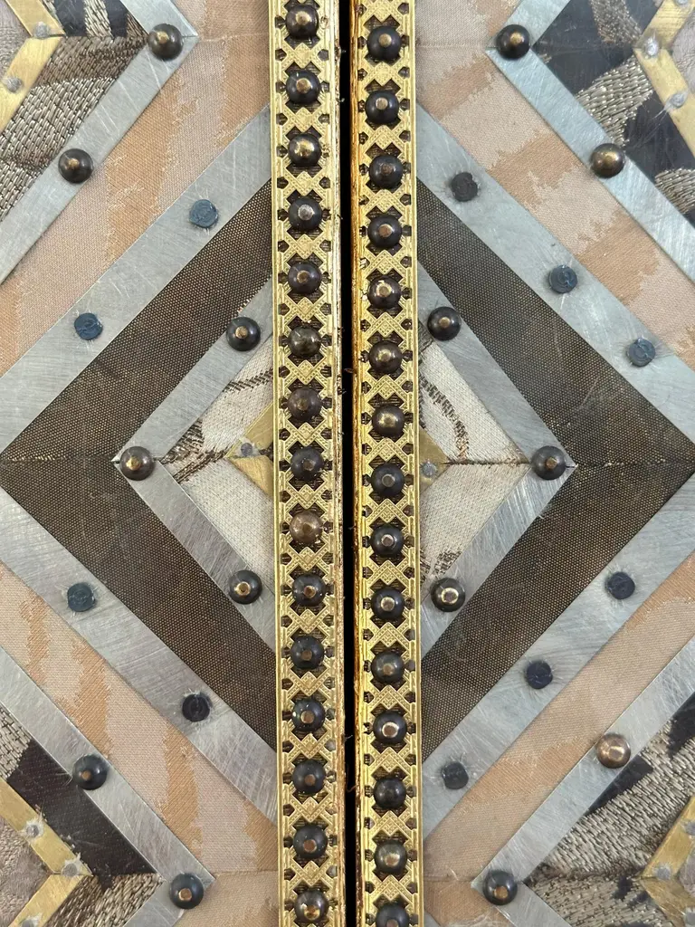 Delon Cabinet by Valentina GiovandoDimensions: W 200 x D 47 x H 145 cm.Materials: Wood, Fabric, Brass, Fiberglass, Nails, Studs, Metal sheet.Valentina Giovando, Lives and works in Sarzana, in Liguria, and for over 20 years she dedicated herself to the production of a new style. Her style is personal and full of splendour that she declines in the interior decoration through a range of high-craft artistic products. All these products are completely hand-made. Everything contributes to create unique and original pieces that mix ancient and modern, primitive and industrial, poor and precious materials, in a fascinating mix, by the capable Valentinaʼ and her artisanal team hands.