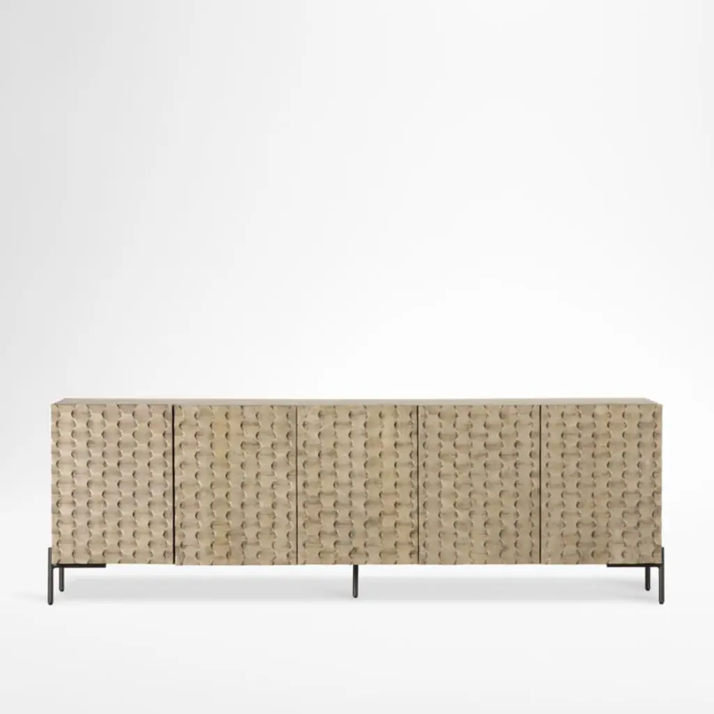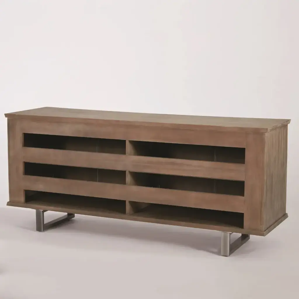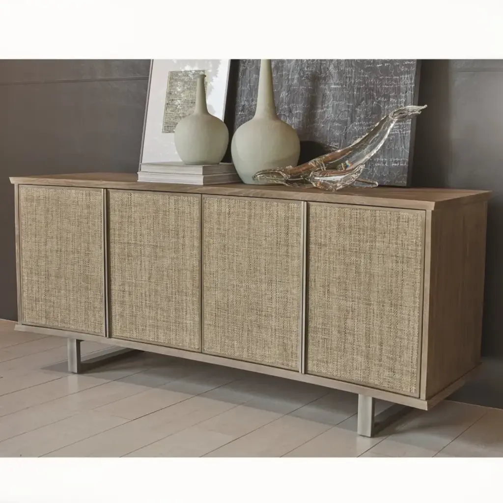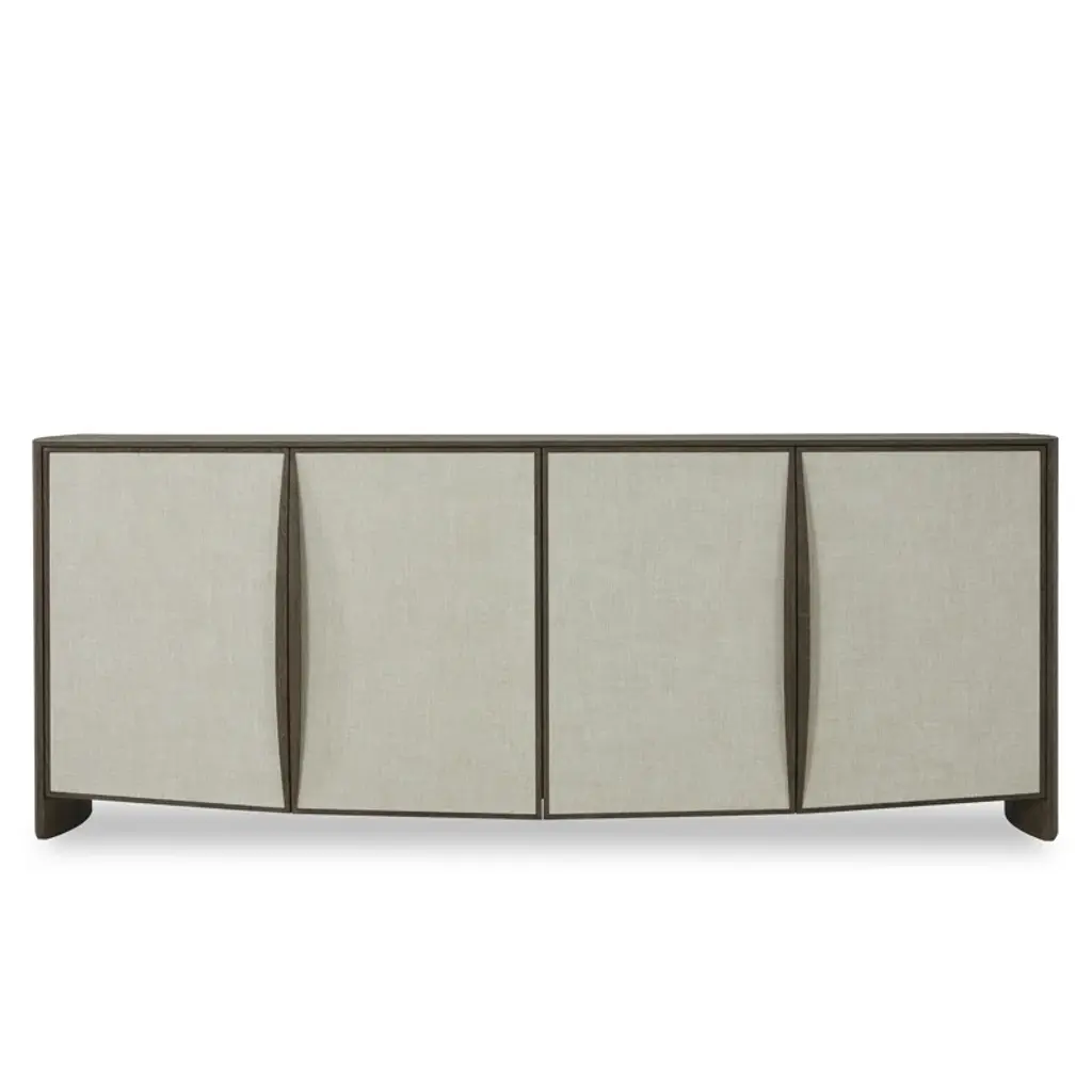 Notice the gently curved front of the beautiful grass cloth faced Delphi Media Cabinet. The soft grey cerused Ash complements the multi-toned, textured grass cloth on the door surfaces. Pewter finished door pulls and metal sleigh base. Media cutouts on the back panel allows for easy access to electronics. Note that the back panel fits flush to the wall, though the front is curved. One adjustable shelf per compartment. Hidden, soft-close hinges. From a fashion forward perspective, Global Views offers accessories, furniture, statement lighting, and an assortment of rugs and mirrors to add beauty and joy to your home.