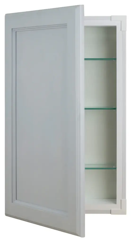 Perfect for any bathroom. Recesses in the wall between the studs, and simply screws to the studs on each side of the opening. Only the door is outside the wall. Fully adjustable glass shelves inside. Our unique, patented design of shelf supports keeps each shelf in place. Concealed hinges with soft close built in assures the door will never slam shut, but softly close on its own instead. Box is SOLID pine and the Inset panel style door is SOLID maple. We''ve painted the inside of the box white, so you don''t have to! Primed door is ready for you to paint it. The box is 3.5" deep inside and gives you plenty of usable depth, but fits in standard 2x4 walls. Cabinet box is 12.5" wide inside. Door is reversible to open either Left or Right. Completely assembled! All you need to do is put one screw in each hinge to mount the door. Then insert it in the wall and screw it to the studs with included screws. If you are replacing a current cabinet, measure your wall opening! White plastic trim surround covers the rough edges of your opening up to 1/2" all around. Door covers the trim surround when closed so the only thing you see outside the wall is the door itself. White plastic trim surround covers the rough edges of your opening up to 1/2" all around. Door covers the trim surround when closed so the only thing you see outside the wall is the door itself. Made in Sarasota, FL.