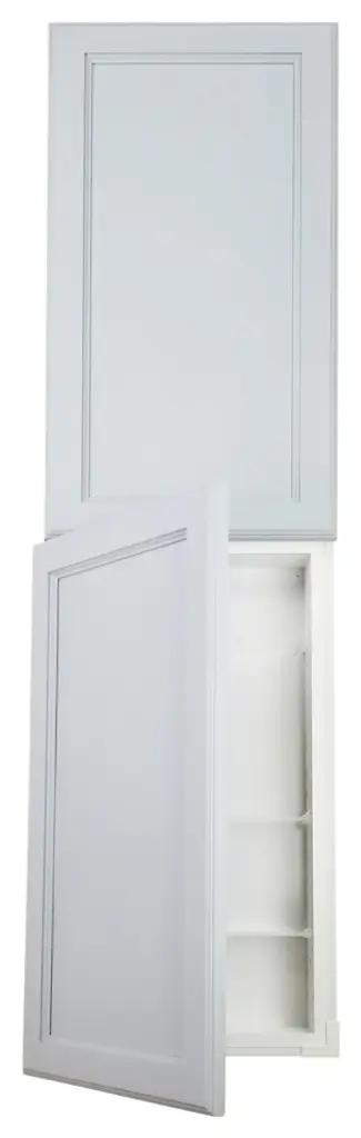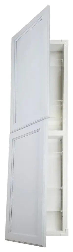 Perfect for any bathroom. Recesses in the wall between the studs, and simply screws to the studs on each side of the opening. Only the doors are outside the wall. Fully adjustable glass shelves inside. Our unique, patented design of shelf supports keeps each shelf in place. Concealed hinges with soft close built in assures the door will never slam shut, but softly close on its own instead. Box is SOLID pine and the Inset Panel style door is SOLID maple. We''ve painted the inside of the box white, so you don''t have to! Door is primed and ready for you to paint it. The box is 3.5" deep inside and gives you plenty of usable depth, but fits in standard 2x4 walls. This model has TWO doors which open to reveal two separate cabinet sections. Cabinet box is 12.5" wide inside. Doors are reversible to open either Left or Right. Completely assembled! All you need to do is put one screw in each hinge to mount the door. Then insert it in the wall and screw it to the studs with included screws. If you are replacing a current cabinet, measure your wall opening! White plastic trim surround covers the rough edges of your opening up to 1/2" all around. Doors cover the trim surround when closed so the only thing you see outside the wall are the doors. Made in USA.