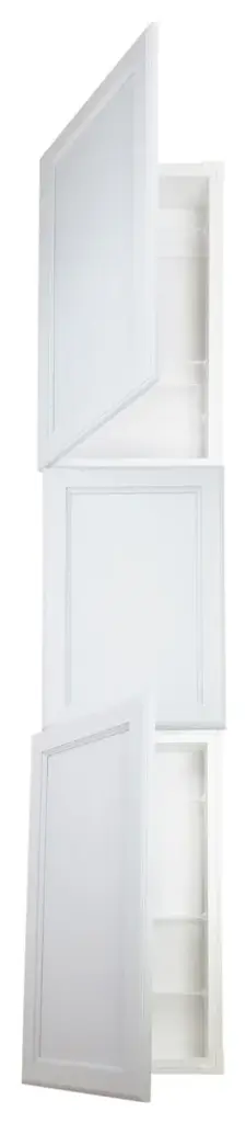 Perfect for any bathroom. Recesses in the wall between the studs, and simply screws to the studs on each side of the opening. Only the doors are outside the wall. Fully adjustable glass shelves inside. Our unique, patented design of shelf supports keeps each shelf in place. Concealed hinges with soft close built in assures the door will never slam shut, but softly close on its own instead. Box is SOLID pine and the Inset panel style door is SOLID maple. We''ve painted the inside of the box white, so you don''t have to! Doors are primed and ready for you to paint them. The box is 3.5" deep inside and gives you plenty of usable depth, but fits in standard 2x4 walls. This model has THREE doors which open to reveal two separate cabinet sections. Cabinet box is 12.5" wide inside. Doors are reversible to open either Left or Right. Completely assembled! All you need to do is put one screw in each hinge to mount the door. Then insert it in the wall and screw it to the studs with included screws. If you are replacing a current cabinet, measure your wall opening! White plastic trim surround covers the rough edges of your opening up to 1/2" all around. Doors cover the trim surround when closed so the only thing you see outside the wall is the door itself. Made in USA.