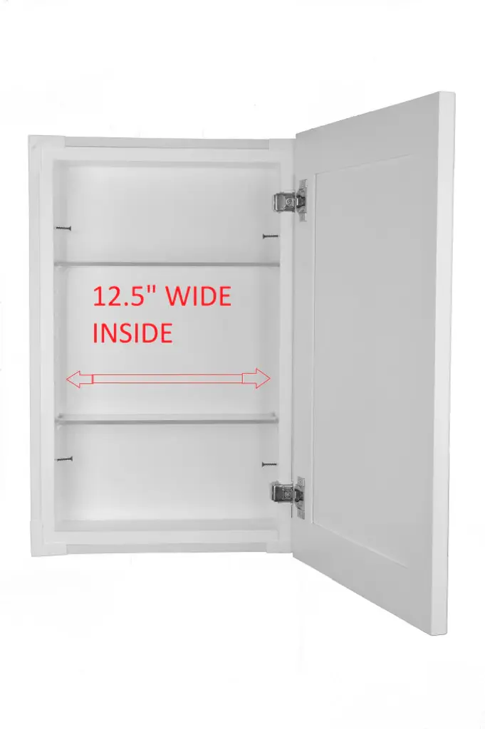 Perfect for any bathroom. Recesses in the wall between the studs, and simply screws to the studs on each side of the opening. Only the door is outside the wall. Fully adjustable glass shelves inside. Our unique, patented design of shelf supports keeps each shelf in place. Concealed hinges with soft close built in assures the door will never slam shut, but softly close on its own instead. Box is SOLID pine and the Inset panel style door is SOLID maple. We''ve painted the inside of the box white, so you don''t have to! Unfinished door can be painted or stained. The box is 3.5" deep inside and gives you plenty of usable depth, but fits in standard 2x4 walls. Cabinet box is 12.5" wide inside. Door is reversible to open either Left or Right. Completely assembled! All you need to do is put one screw in each hinge to mount the door. Then insert it in the wall and screw it to the studs with included screws. If you are replacing a current cabinet, measure your wall opening! White plastic trim surround covers the rough edges of your opening up to 1/2" all around. Door covers the trim surround when closed so the only thing you see outside the wall is the door itself. Made in Sarasota, FL.