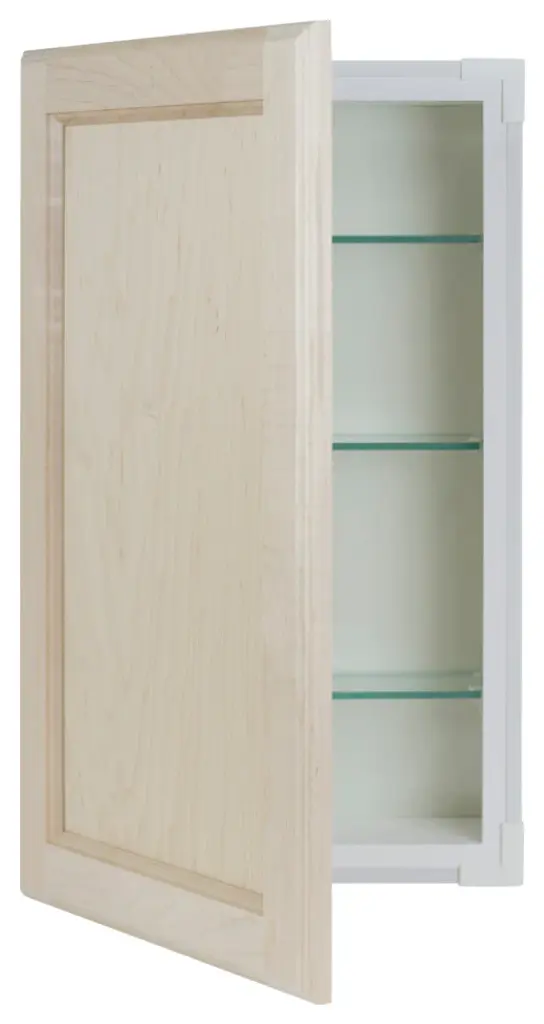 Perfect for any bathroom. Recesses in the wall between the studs, and simply screws to the studs on each side of the opening. Only the door is outside the wall. Fully adjustable glass shelves inside. Our unique, patented design of shelf supports keeps each shelf in place. Concealed hinges with soft close built in assures the door will never slam shut, but softly close on its own instead. Box is SOLID pine and the Inset panel style door is SOLID maple. We''ve painted the inside of the box white, so you don''t have to! Unfinished door can be painted or stained. The box is 3.5" deep inside and gives you plenty of usable depth, but fits in standard 2x4 walls. Cabinet box is 12.5" wide inside. Door is reversible to open either Left or Right. Completely assembled! All you need to do is put one screw in each hinge to mount the door. Then insert it in the wall and screw it to the studs with included screws. If you are replacing a current cabinet, measure your wall opening! White plastic trim surround covers the rough edges of your opening up to 1/2" all around. Door covers the trim surround when closed so the only thing you see outside the wall is the door itself. Made in Sarasota, FL.