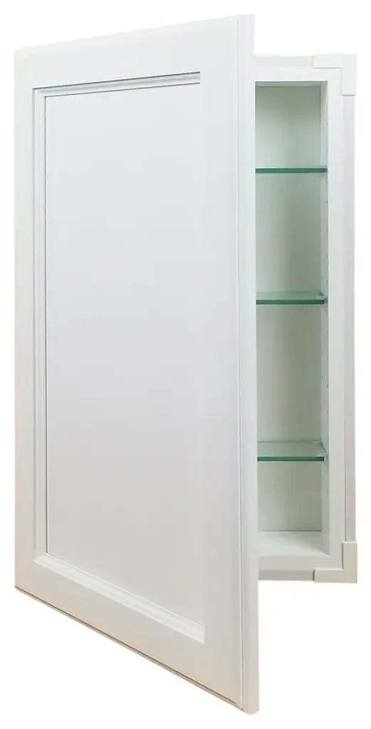 Perfect for any bathroom. Recesses in the wall between the studs, and simply screws to the studs on each side of the opening. Only the door is outside the wall. Fully adjustable glass shelves inside. Our unique, patented design of shelf supports keeps each shelf in place. Concealed hinges with soft close built in assures the door will never slam shut, but softly close on its own instead. Box is SOLID pine and the Inset panel style door is SOLID maple. White enamel finish. The box is 3.5" deep inside and gives you plenty of usable depth, but fits in standard 2x4 walls. Cabinet box is 12.5" wide inside. Door is reversible to open either Left or Right. Completely assembled! All you need to do is put one screw in each hinge to mount the door. Then insert it in the wall and screw it to the studs with included screws. If you are replacing a current cabinet, measure your wall opening! White plastic trim surround covers the rough edges of your opening up to 1/2" all around. Door covers the trim surround when closed so the only thing you see outside the wall is the door itself. White plastic trim surround covers the rough edges of your opening up to 1/2" all around. Door covers the trim surround when closed so the only thing you see outside the wall is the door itself. Made in Sarasota, FL.
