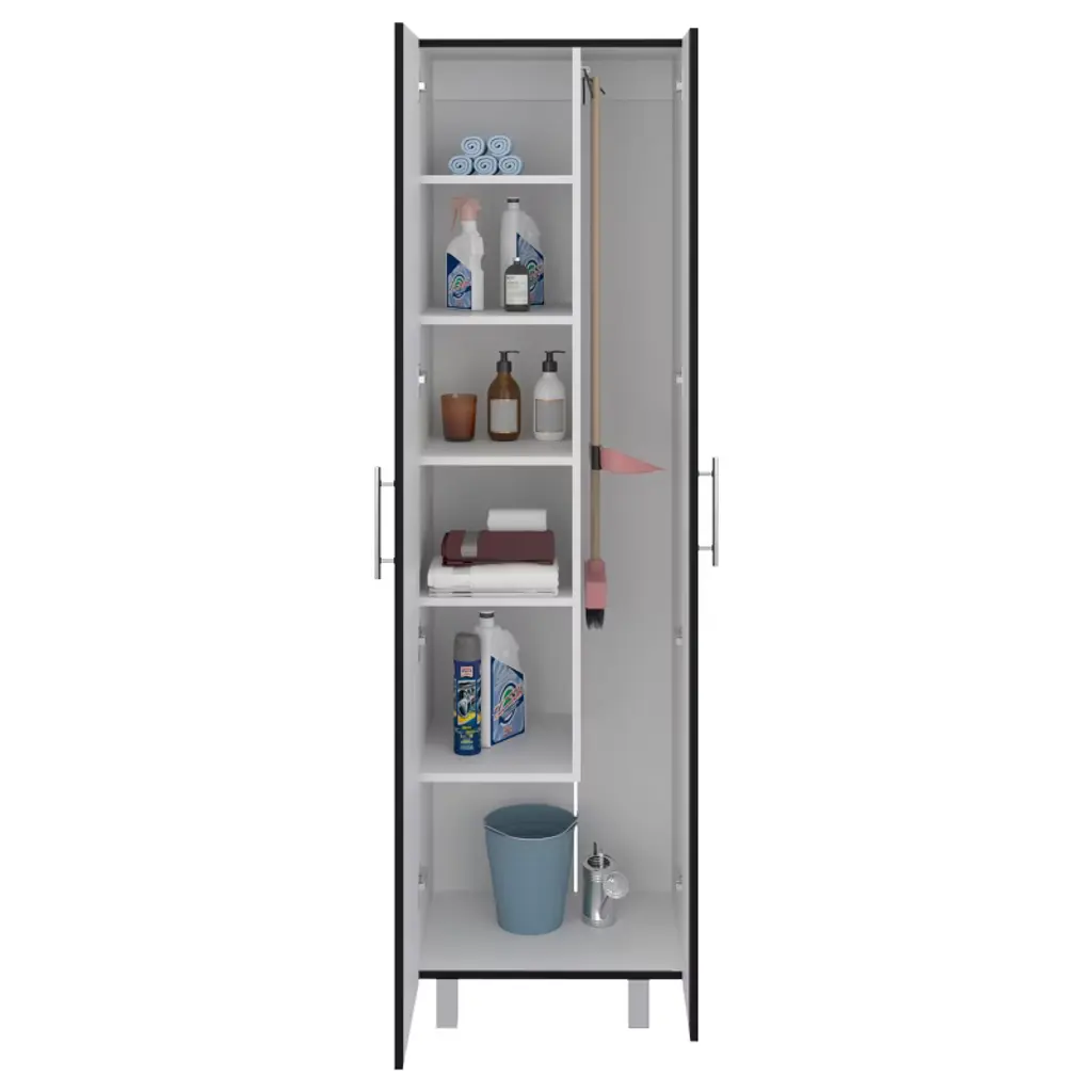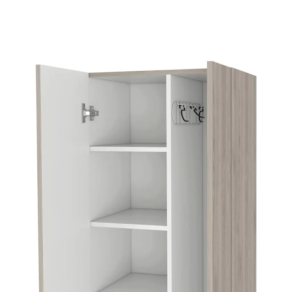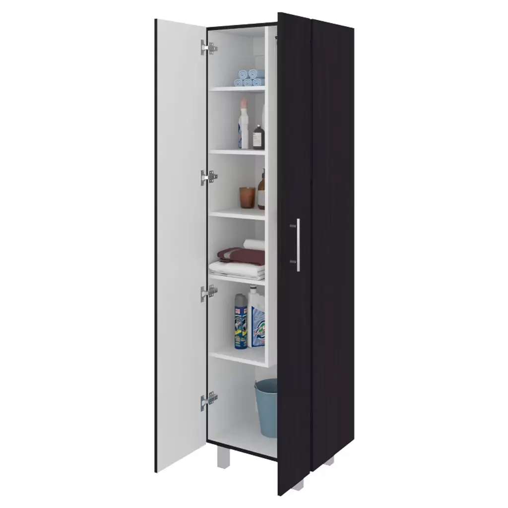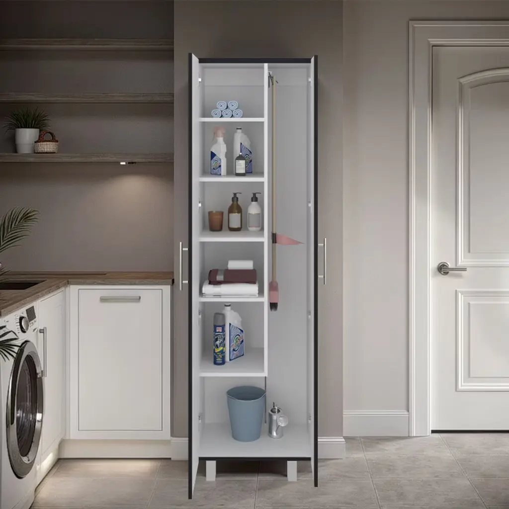 storage cabinet is specifically made for your cleaning supplies. Features two doors with metal hinges and handles, standing at 71.3 In High and 20.1 Inches wide. Inside you will find a 66.1 inches high x 7.3 inches wide space specially designed to store your broom and mop with a hanging rack to have them elevated and in the best condition possible; six different shelves, starting at the bottom with a 13.5-inch-high space that will be enough to store your buckets and bigger cleaning supplies. You will also find another five different shelves in different sizes for the rest of your cleaning supplies. With this product, you will save a lot of space in your kitchen and garage and have the perfect solution for concealed storage. Designed with elegant Light Grey / White, Black Wengue / White manufactured wood. Dimensions: • Height: 71,3" • Width: 20,1" • Depth: 15,1" Furniture Type: Ready to assemble (full assembly required) Certifications: CARB phase II compliant – TSCA Title VI Compliant Warranty: 1-year warranty coverage in wooden parts- 1-year warranty coverage in hardware pieces since its manufacturing date is found in the lot number printed in the product box.