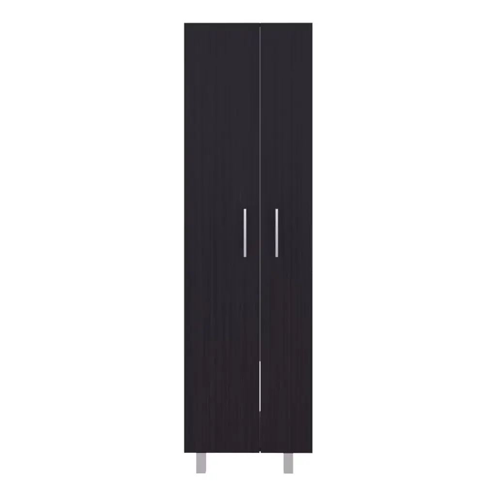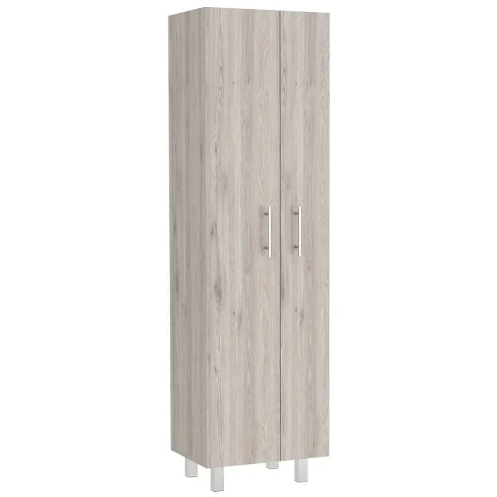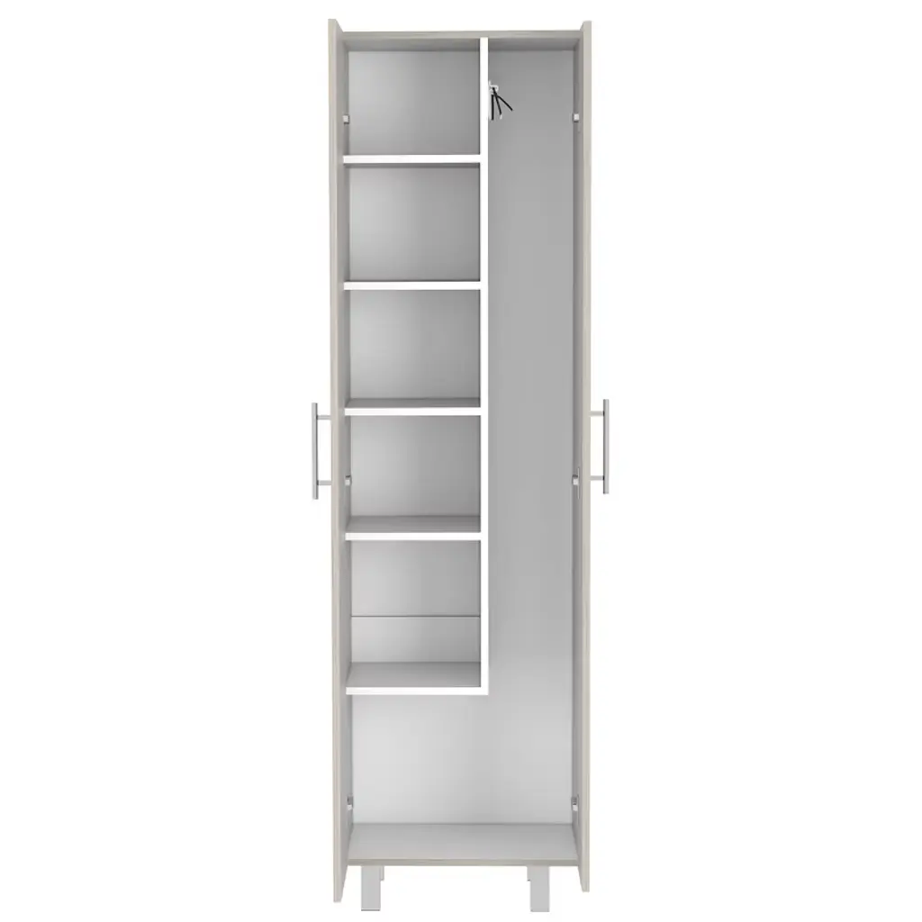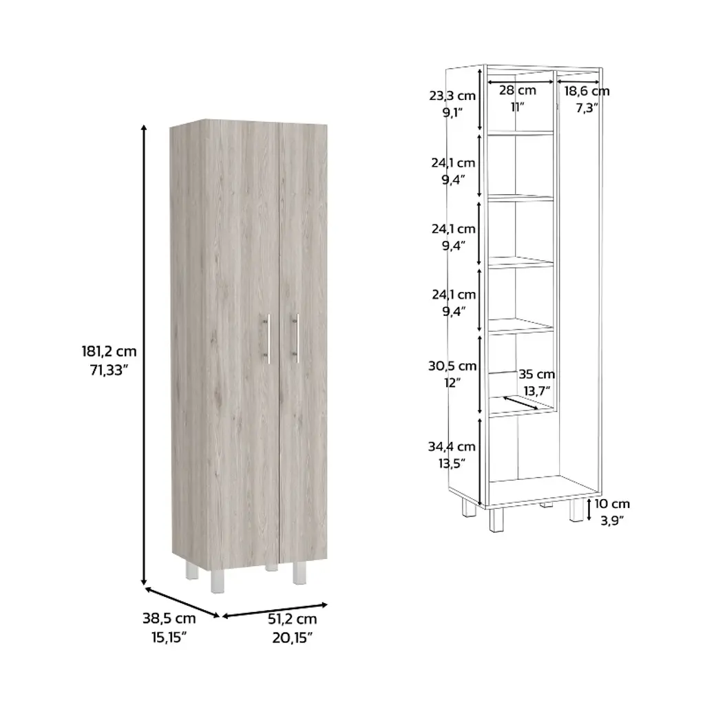 storage cabinet is specifically made for your cleaning supplies. Features two doors with metal hinges and handles, standing at 71.3 In High and 20.1 Inches wide. Inside you will find a 66.1 inches high x 7.3 inches wide space specially designed to store your broom and mop with a hanging rack to have them elevated and in the best condition possible; six different shelves, starting at the bottom with a 13.5-inch-high space that will be enough to store your buckets and bigger cleaning supplies. You will also find another five different shelves in different sizes for the rest of your cleaning supplies. With this product, you will save a lot of space in your kitchen and garage and have the perfect solution for concealed storage. Designed with elegant Light Grey / White, Black Wengue / White manufactured wood. Dimensions: • Height: 71,3" • Width: 20,1" • Depth: 15,1" Furniture Type: Ready to assemble (full assembly required) Certifications: CARB phase II compliant – TSCA Title VI Compliant Warranty: 1-year warranty coverage in wooden parts- 1-year warranty coverage in hardware pieces since its manufacturing date is found in the lot number printed in the product box.