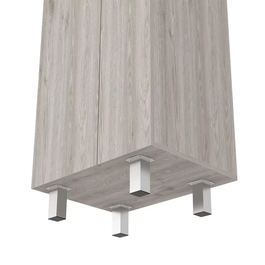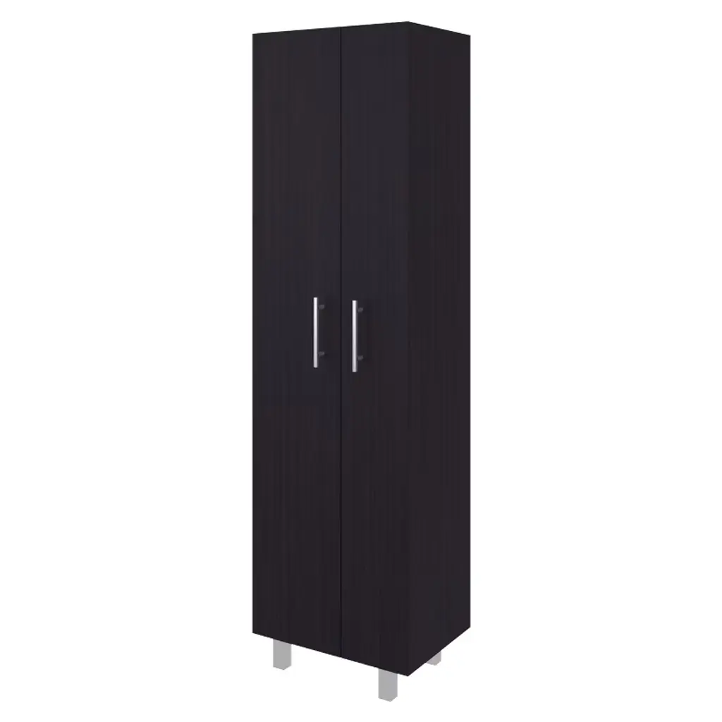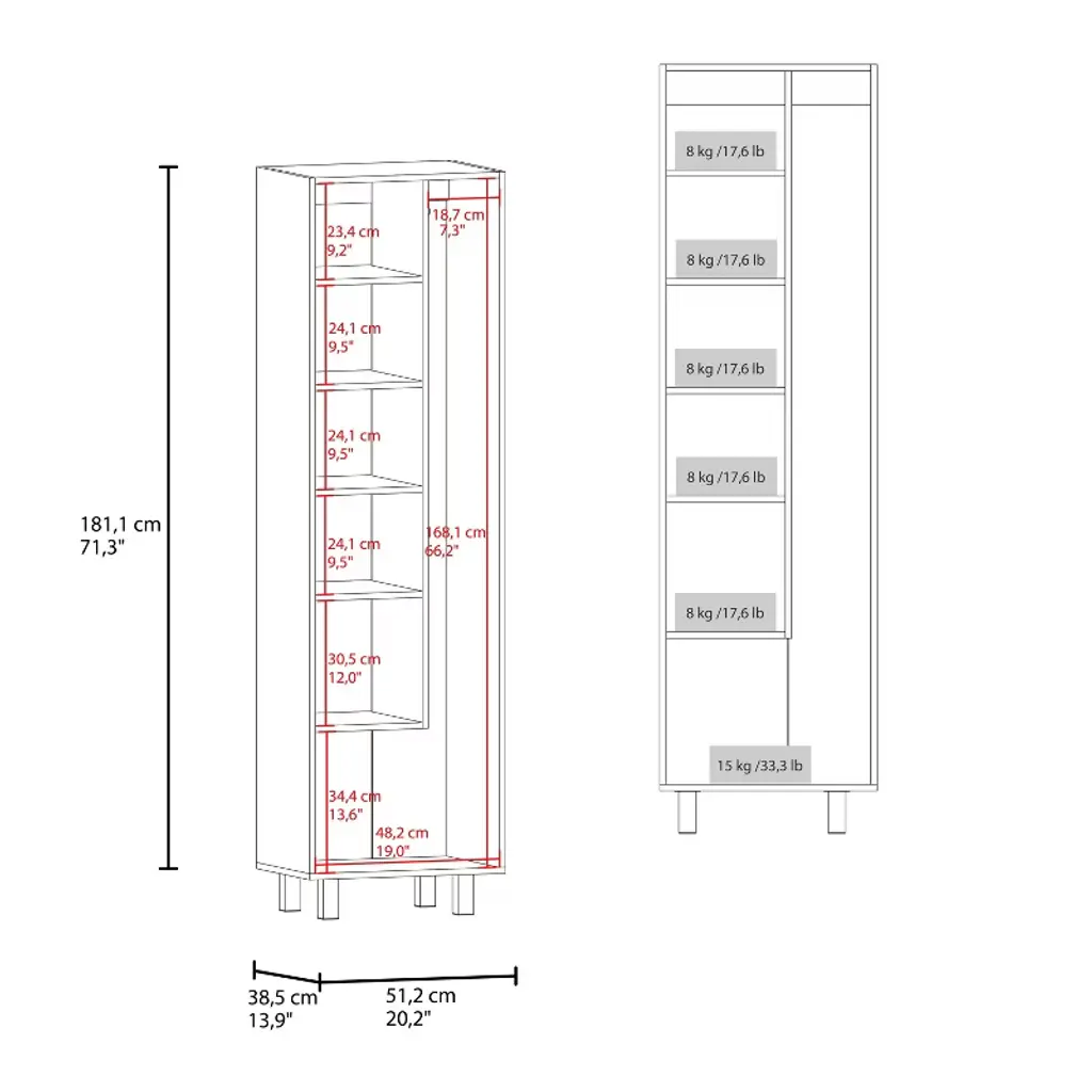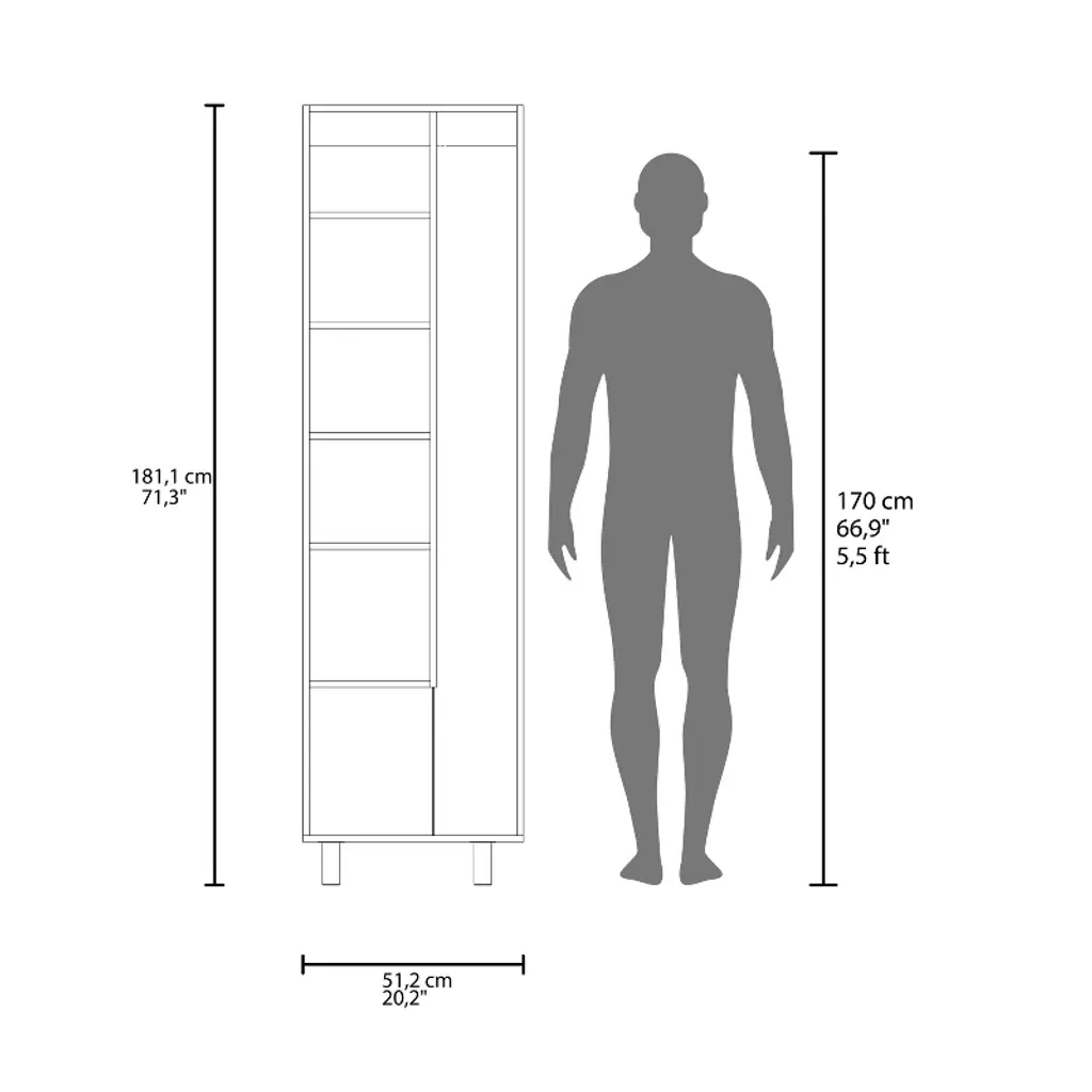 storage cabinet is specifically made for your cleaning supplies. Features two doors with metal hinges and handles, standing at 71.3 In High and 20.1 Inches wide. Inside you will find a 66.1 inches high x 7.3 inches wide space specially designed to store your broom and mop with a hanging rack to have them elevated and in the best condition possible; six different shelves, starting at the bottom with a 13.5-inch-high space that will be enough to store your buckets and bigger cleaning supplies. You will also find another five different shelves in different sizes for the rest of your cleaning supplies. With this product, you will save a lot of space in your kitchen and garage and have the perfect solution for concealed storage. Designed with elegant Light Grey / White, Black Wengue / White manufactured wood. Dimensions: • Height: 71,3" • Width: 20,1" • Depth: 15,1" Furniture Type: Ready to assemble (full assembly required) Certifications: CARB phase II compliant – TSCA Title VI Compliant Warranty: 1-year warranty coverage in wooden parts- 1-year warranty coverage in hardware pieces since its manufacturing date is found in the lot number printed in the product box.