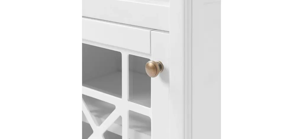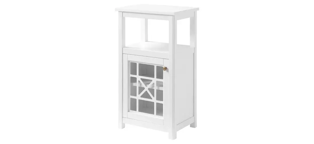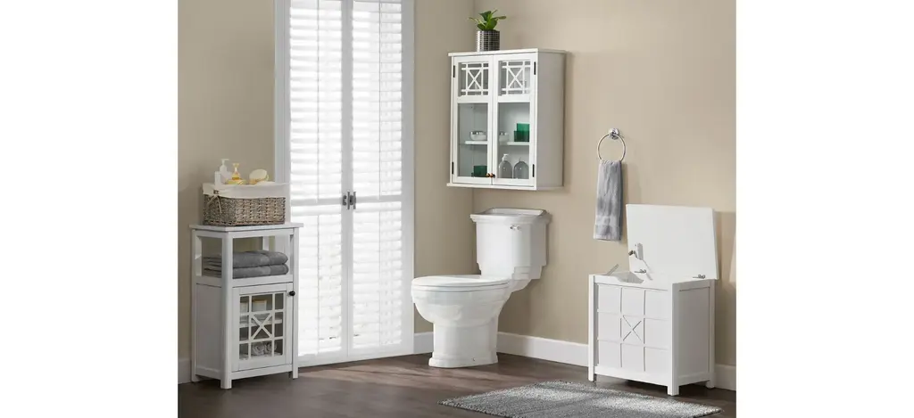 Bring style and function to your bathroom with Derby Deluxe Floor Storage Cabinet. Distinctive styling and grid work details are designed to complement any d_cor. Offers a surprising amount of storage for such a small footprint. Provides space for towels, toiletries, or paper supplies.
