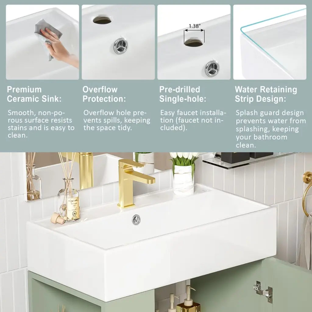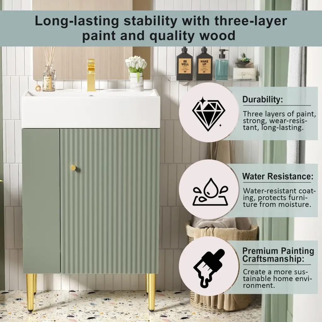 21.6" Green Left Side Storage Bathroom Vanity Upgrade your bathroom with this elegant and functional bathroom storage cabinet. Designed with a modern touch, this cabinet is the perfect blend of style and practicality. It features a high-quality ceramic sink with a built-in overflow hole and water barrier edges to prevent spills. With a sturdy metal frame and golden legs, this piece provides both stability and a contemporary aesthetic for your bathroom. Why Choose This Bathroom Storage Cabinet? This stylish and efficient cabinet not only enhances your bathroom’s aesthetic but also provides the functionality you need for storage. Its contemporary design and smart features, like the ceramic sink and side storage, make it the perfect choice for any modern bathroom. Triple-Coat Finish, Enhanced Protection Triple-coat finish provides effective water and moisture resistance, reducing cracking and peeling for long-lasting use with a balance of style and sustainability. Side Storage, Easy Access Side-open storage allows easy access to small items like phones, toilet paper, and shoe brushes, while the spacious cabinet holds laundry detergent, clothes, and more. Elegant Design, Comfortable Experience Soft-close hinges ensure a quiet opening and closing experience, while adjustable plastic feet enhance stability. The wave-textured surface adds an elegant touch, complemented by gold handles for a modern aesthetic. Semi-Open Back Design Easy plumbing access, enhanced ventilation keeps it dry, fits various bathroom layouts.