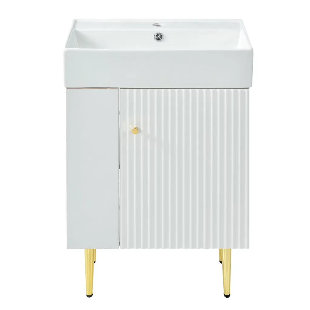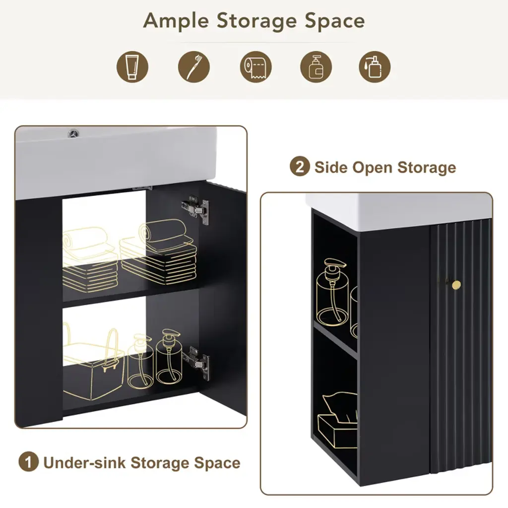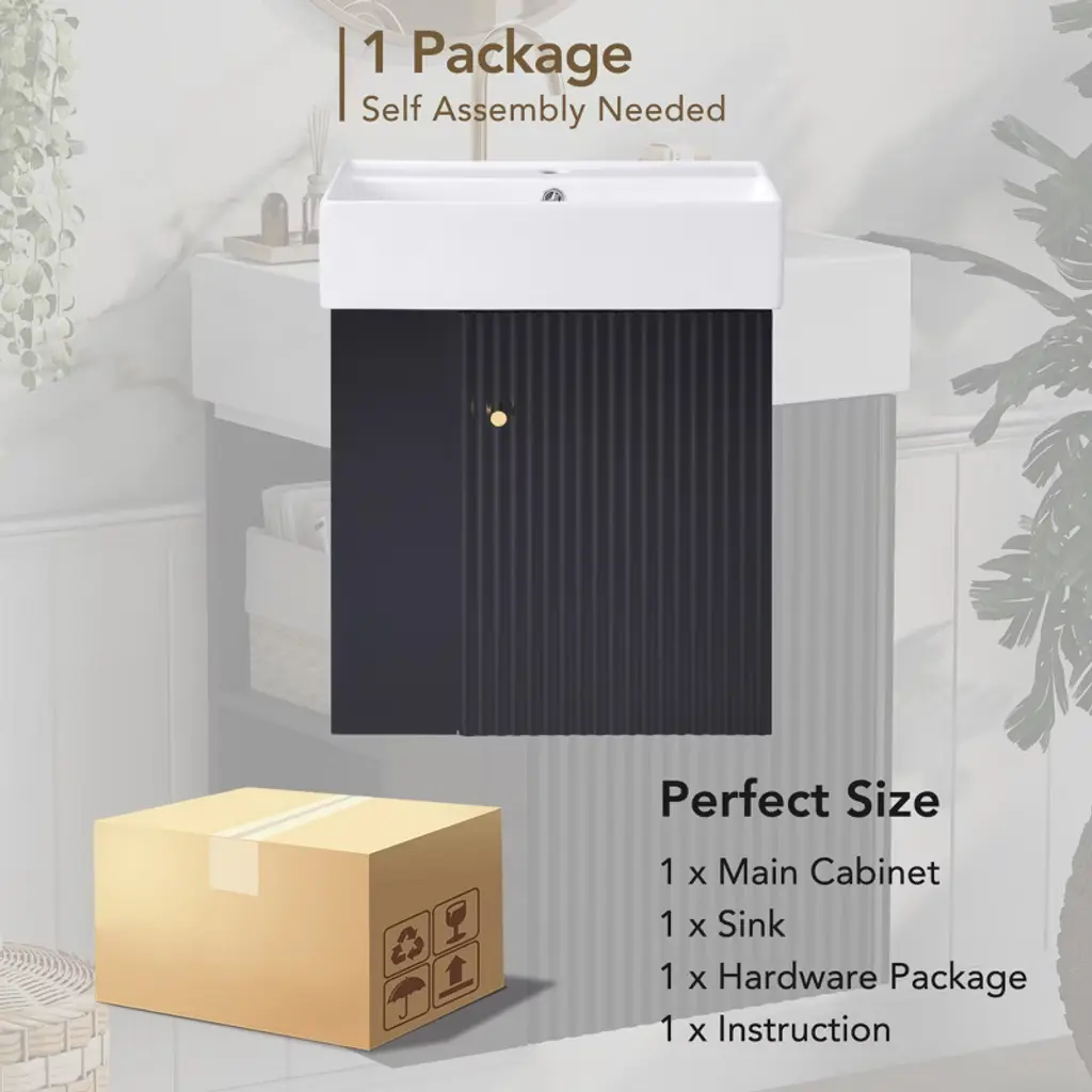 Elevate your bathroom with our Modern Floating Bathroom Cabinet, showcasing a chic wave-patterned door and a rose gold handle. Designed to save space, it's the perfect fit for small bathrooms, adding a touch of modernity to your space. Constructed with a premium ceramic basin and equipped with an overflow hole, this cabinet guarantees both durability and safety in use. The compact dimensions of 21.6*12.2*26.4 inches make it adaptable to bathrooms of various sizes. Installation is a breeze with the pre-drilled single hole, allowing flexibility in faucet selection (faucet not included). Soft-close doors add a touch of luxury while minimizing noise. Convenience meets style with the side storage compartment, providing easy access to essentials like toilet paper.
