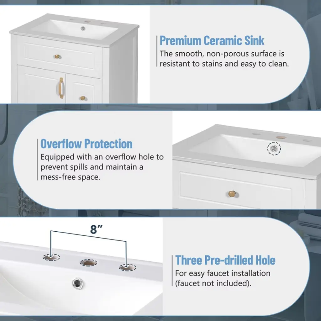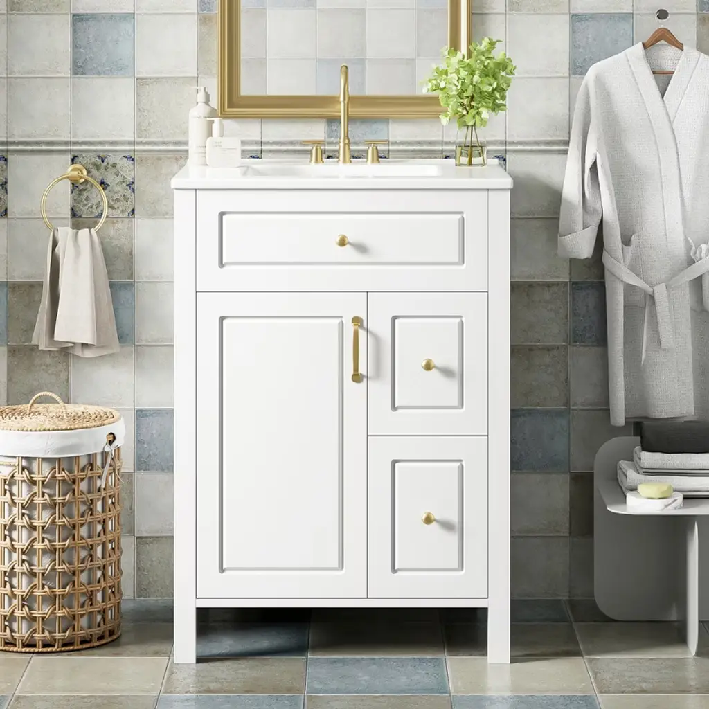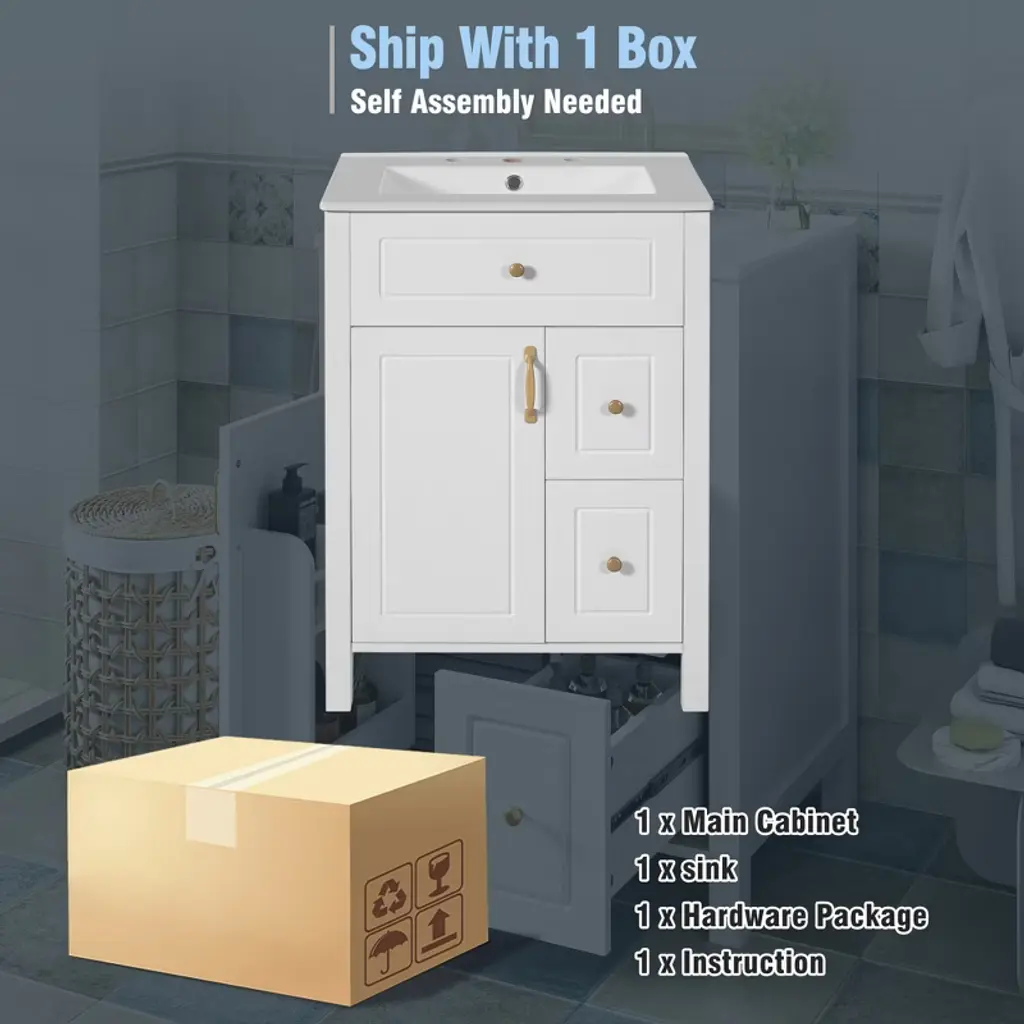 Transform your bathroom with our 24-inch white vanity, a perfect fusion of elegance and practicality. Imagine the smooth, easy-to-clean ceramic sink, accented by the gleam of golden vintage metal handles. The soft-close drawers glide open with a whisper, revealing generous storage for all your essentials. Double racks on the door keep your space organized and tidy, elevating your daily routine.Crafted with durable wood and MDF, this vanity is built to last, while its graceful lines and golden handles add a touch of luxury. Designed with a under-sink cabinet, two drawers, and double storage rack on door, this vanity keeps toiletries, towels, and other daily items neatly organized and easy to access. The smooth ceramic basin resists stains and scratches, and comes with an overflow hole and three pre-drilled faucet holes for easy installation and maintenance. Soft-close doors reduce noise and create a peaceful daily experience, while thoughtful storage compartments keep your essentials organized. Crafted with solid wood frame and MDF, this vanity combines long-lasting durability with a clean, modern look and practical storage space. Open-back design allows easy access to plumbing and makes installation more flexible, saving time during setup. The double shelves provides extra space in a compact footprint, helping you separate and organize smaller items with ease. Corrosion-resistant aluminum handles offer a luxurious look and smooth daily use. The cabinet doors of this vanity feature a soft-close function, keeping your room away from noise.