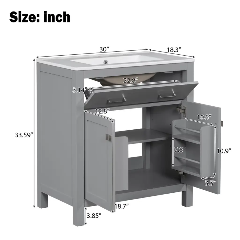30inch Modern Bathroom Vanity Cabinet Combo Featuring a sleek and elegant design, the 30-inch bathroom cabinet exudes a sense of high quality, elevating the overall ambiance of the bathroom. Reflecting the owner's unique aesthetic and taste, it adds a touch of luxury and freshness to your bathroom. Bring home this bathroom cabinet to infuse your bathroom with a blend of opulence and serenity. Attractive Appearance The combination of gray and silver exudes a stylish and elegant vibe, with the silver handles adding a touch of sophistication, while the white basin brings a sense of freshness and cleanliness. Sturdy Construction Constructed with high-quality MDF and solid wood frame, the bathroom cabinet is sturdy, ensuring a long lifespan. Versatile Storage The bathroom cabinet features a flip-out drawer that tilts open at a 45-degree angle, perfect for storing everyday items. Inside the cabinet doors, there are storage racks to hold bath essentials securely in place. Adjustable shelves inside the cabinet allow for storing a variety of bath products.
