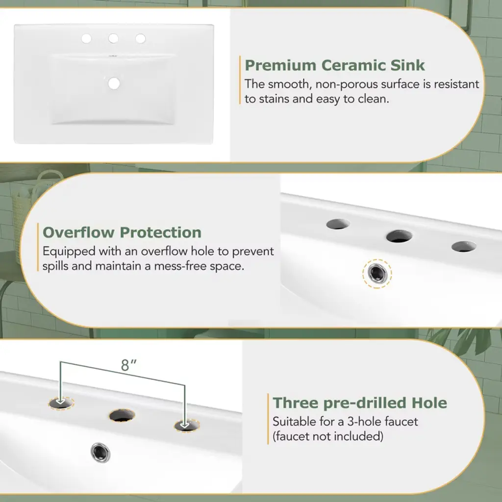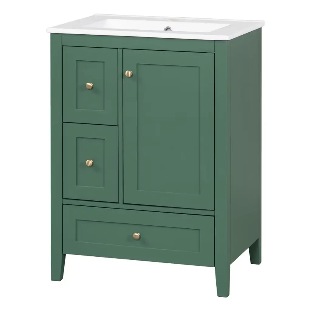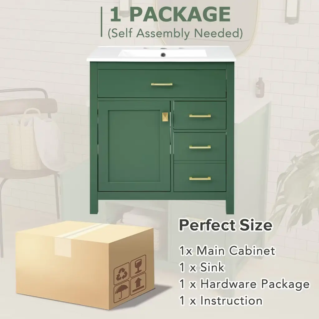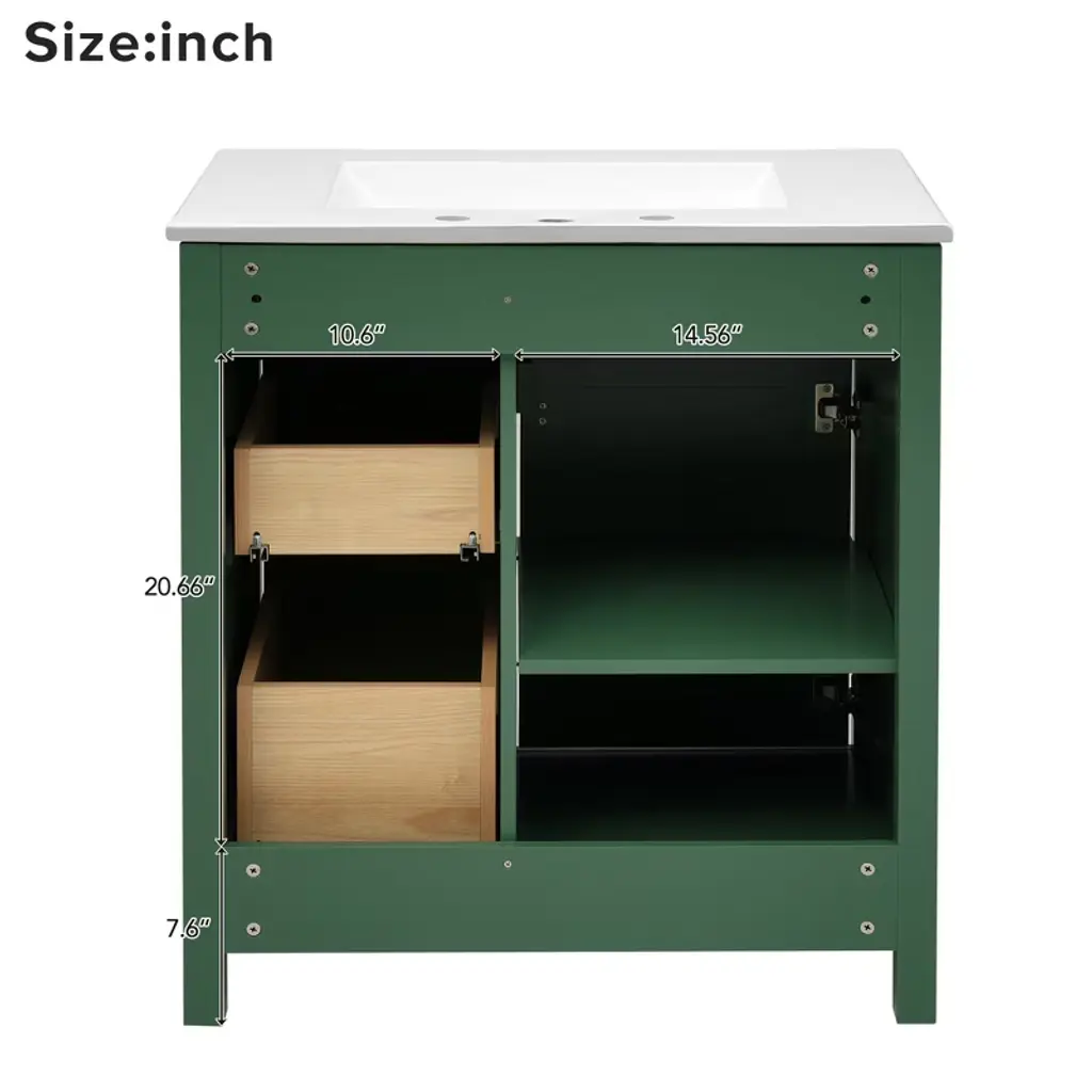 30-Inch Green Bathroom Vanity with Ceramic Sink and Ample Storage The vanity is meticulously designed using high-quality materials to enhance your bathroom experience. It includes versatile storage features, durability in humid environments, easy maintenance, and seamlessly complements various styles of bathroom design. Ample Storage Featuring 1 multifunctional storage door with dividers, 1 flip drawer, 1 shallow drawer and 1 deep drawer, this vanity provides ample storage space for your bathroom essentials. Keep everything organized and within reach. Durable Construction With a cabinet made of MDF material and solid wood legs, our dressing table is not only stylish but also durable. The golden handle adds a touch of sophistication. Space-Saving Design Perfectly designed for small bathrooms, our 30-inch vanity cabinet maximizes storage without compromising on style.