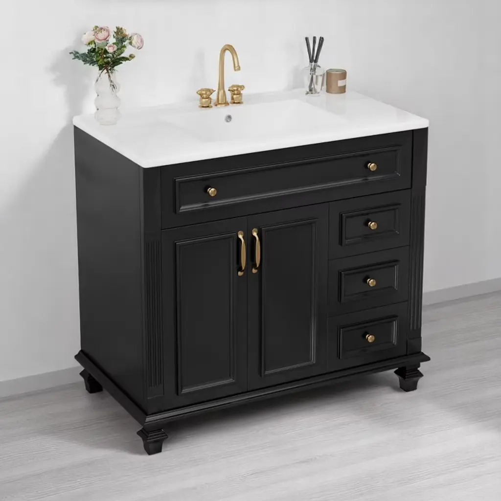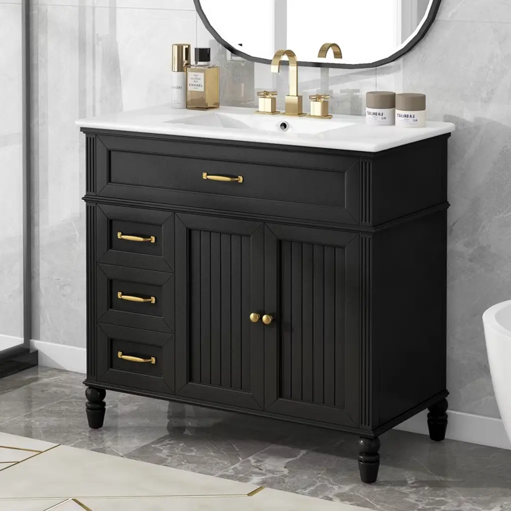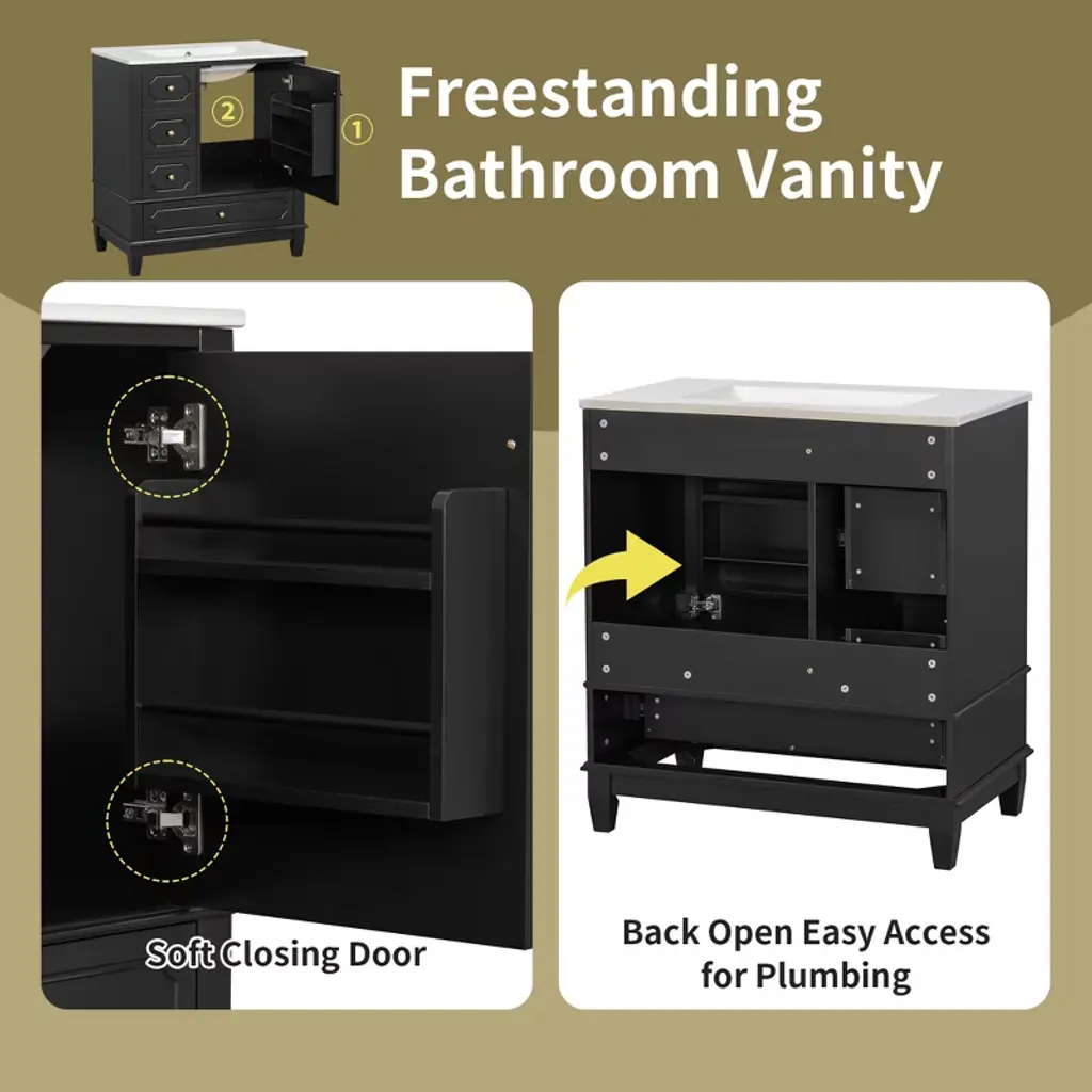 Timeless Style Meets Practical Storage — A Thoughtfully Designed Vanity for Everyday Living Bring elegance and function to your bathroom with this beautifully crafted vanity. Featuring a durable solid wood frame, smooth painted finish, and a ceramic basin, it’s more than just a sink — it’s a smart storage solution that complements your lifestyle. Why Choose This Bathroom Vanity? This 30-inch bathroom vanity strikes the perfect balance between timeless elegance and everyday practicality. Crafted with a solid wood frame and high-quality MDF panels, it offers reliable support and a refined finish that elevates any bathroom space. The integrated ceramic sink is sleek, easy to clean, and built to last, while the smart storage design — including soft-close door hinges, three spacious drawers, and built-in shelving — keeps your essentials organized and within reach. Whether you're upgrading a guest bath or furnishing a new space, this freestanding vanity combines classic design, functional features, and durable materials to meet your daily needs with style and ease. Premium Materials You Can Trust Constructed with a poplar and rubber wood frame and MDF panels, this vanity is built for everyday durability while maintaining a refined look. Functional Layout, Smart Storage With 3 drawers and a side cabinet featuring integrated racks, there’s a place for everything — from toiletries to towels. Seamless Ceramic Sink with Modern Flair The integrated one-piece ceramic basin features clean edges and a glossy surface, offering both visual appeal and everyday practicality. It’s stain-resistant, easy to clean, and perfectly complements the cabinet’s design for a polished, cohesive look. Quiet Closing, Long-Lasting Use Soft-close hinges on the door prevent wear and tear, making every close gentle and quiet.