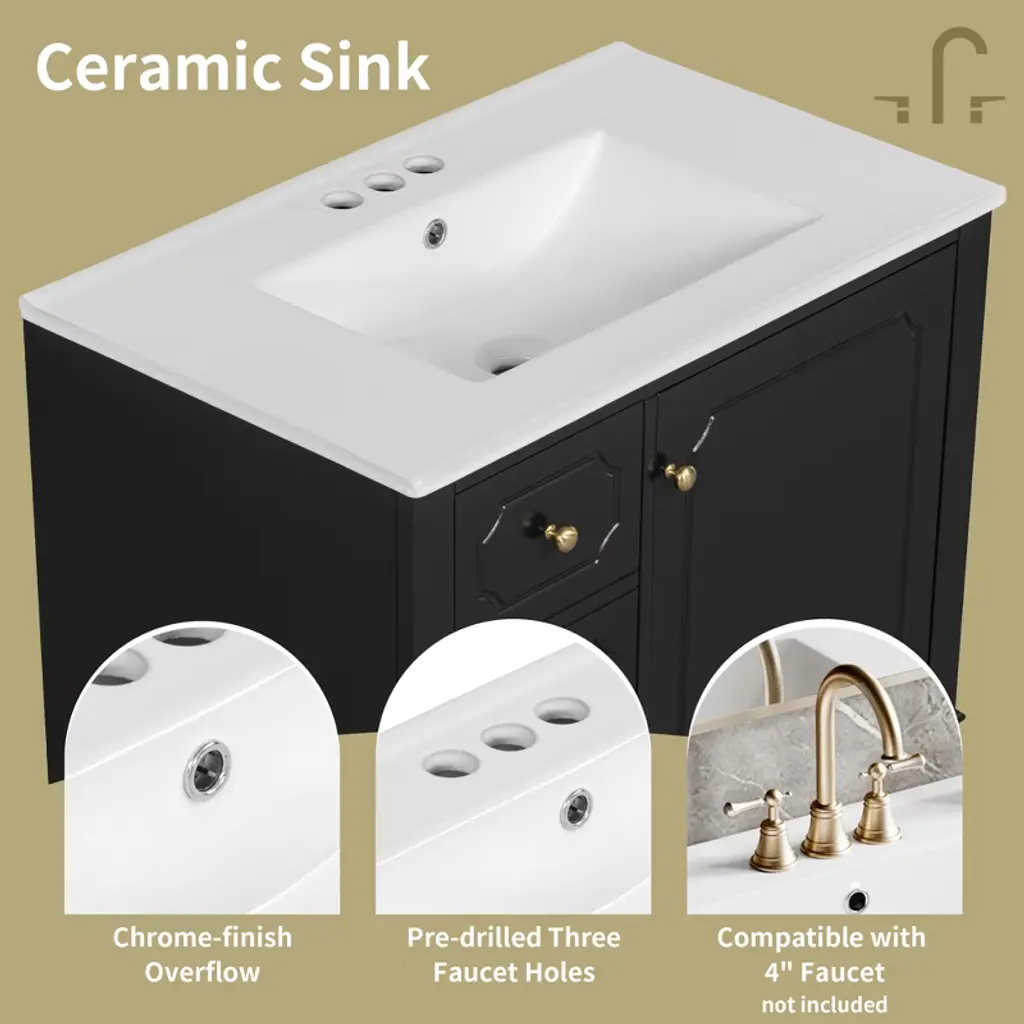 Dexmalle 30"freestanding Black Vanity Cabinet With Ceramic Basin With Solid Wood Frame And Soft-close Door
