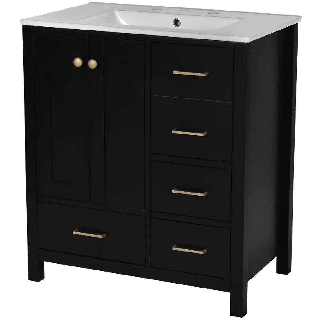 As a functional furniture in bathroom, the following materials are used for this bathroom vanity: ceramic for basin, solid pine wood for frame and MDF boards for doors and drawers. Ceramic material has the advantage of being smooth and easy to clean. MDF boards are wearable and durable as well.