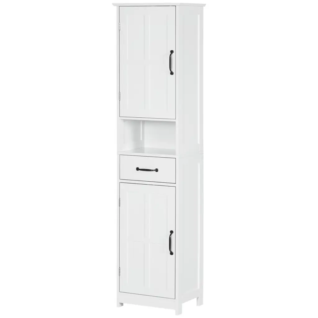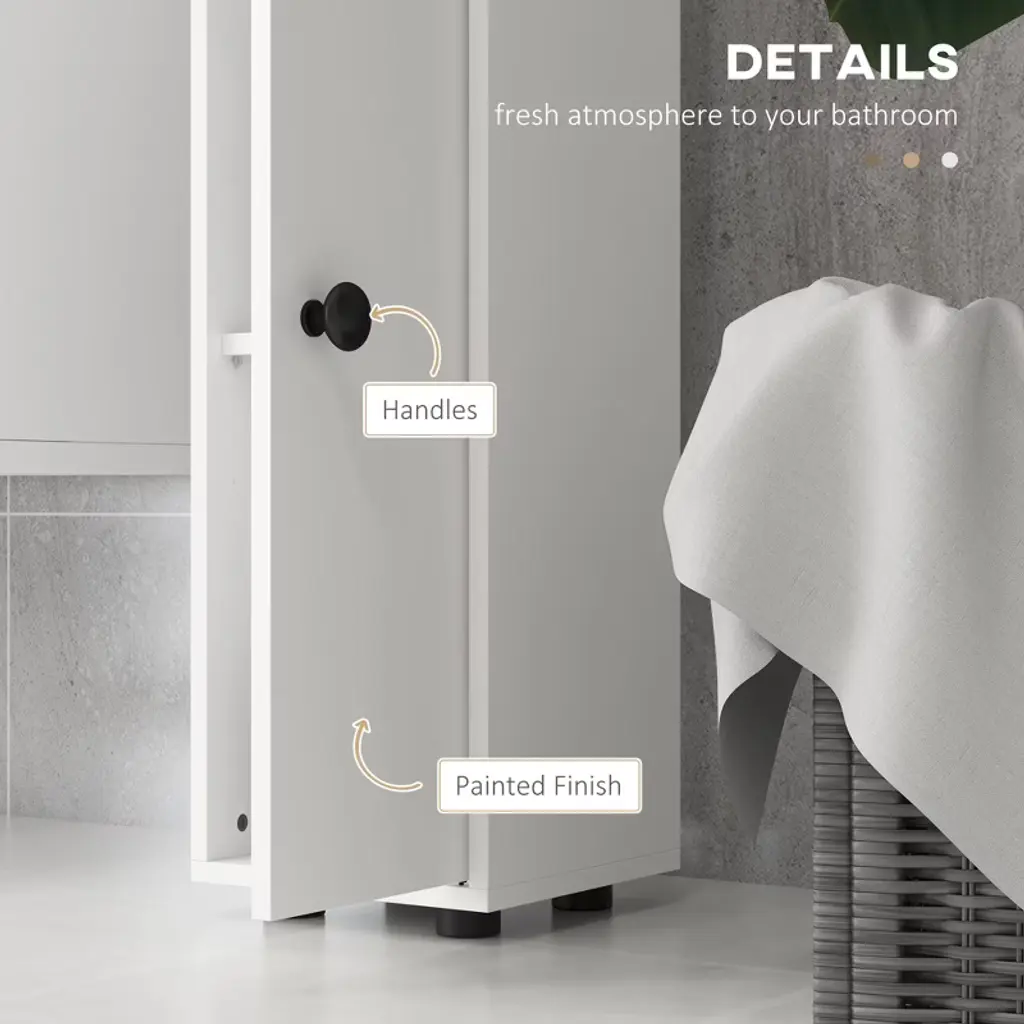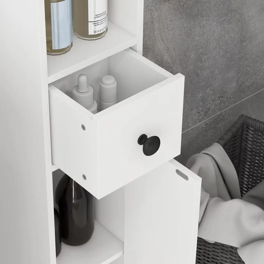 There never seems to be enough storage in the bathroom for everything you need. This bathroom organizer has four open shelves and two 2-tier cabinets so that you can store towels, daily hygiene products, and cleaning supplies without trying to fit everything under the sink. The shelves inside our bathroom storage cabinet can be moved up and down to adapt to your storage needs.