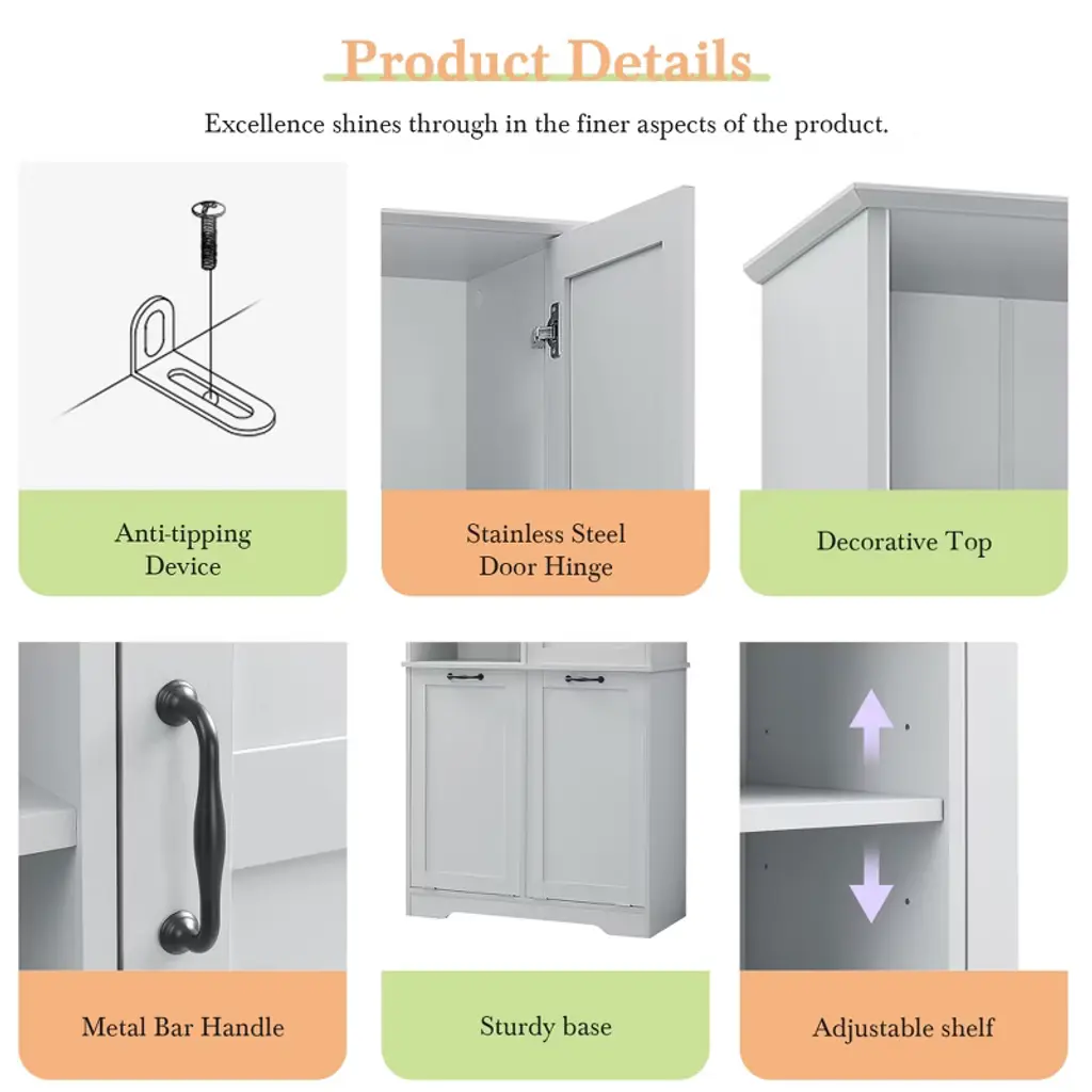 Bullet Point 1. Tall Storage Cabinet 2. High-quality MDF Board 3. Cabinet with Door & Two Tilt-Out Drawers & Storage Rack 4. Applicable for Different Rooms Details 1. Functional Storage Rack 2. Three Adjustable Shelves 3. Metal Black Handles 4. Open shelve 5. Anti-tipping Device