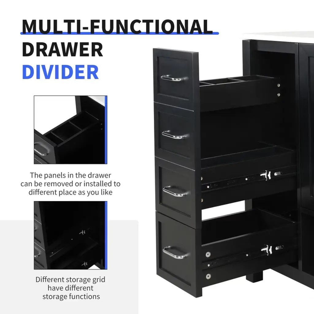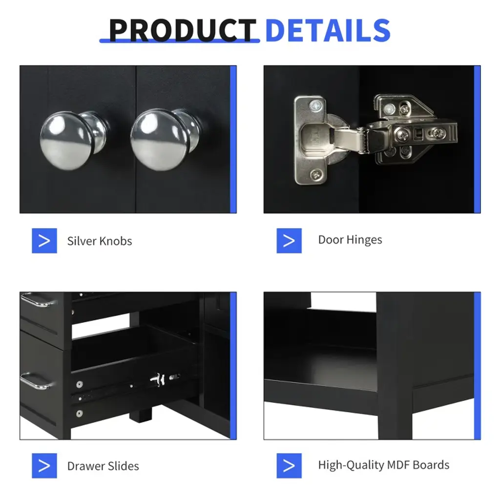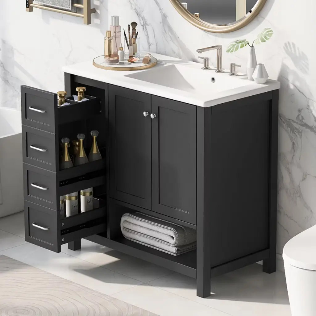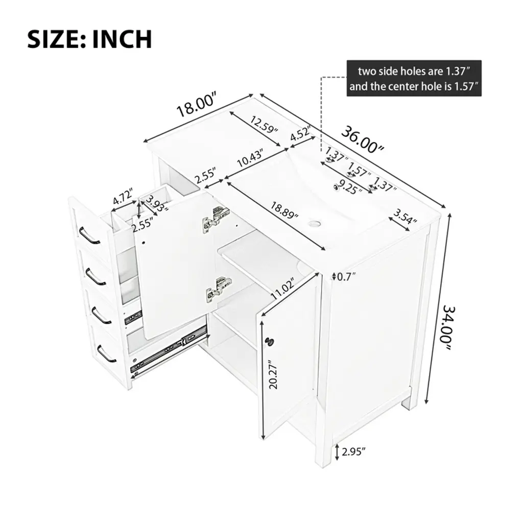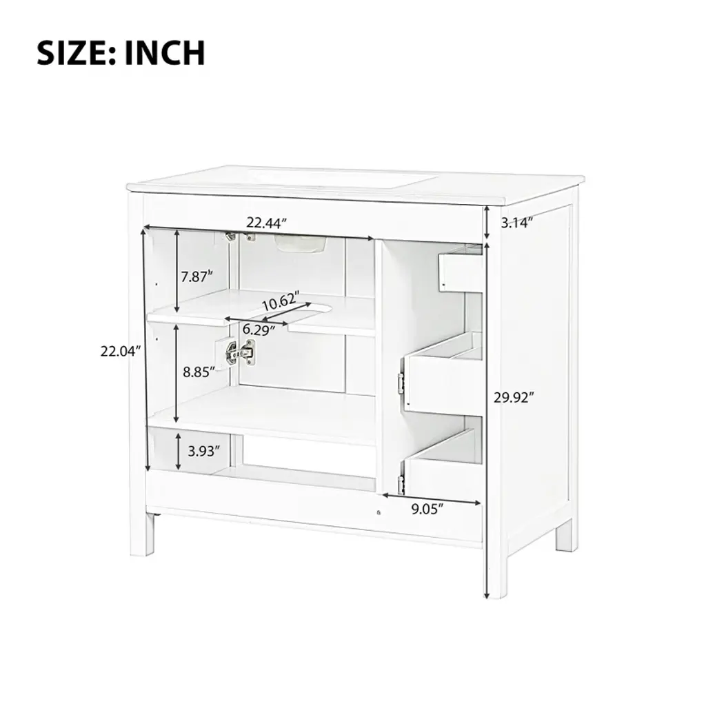 Designed to withstand the humid bathroom environment, this vanity features generous enclosed storage options, including a cabinet with two doors and two smooth-gliding drawers. Perfect for storing soaps, towels, shampoos, tissue paper, and other bathroom essentials, it helps keep your items organized and protected from dust while maximizing space efficiency.
