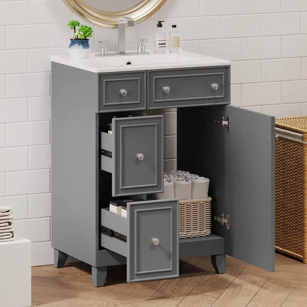 24" Bathroom Vanity with Ceramic Sink, Mid-Century Bathroom Vanity Cabinet with 2 Drawers This stylish bathroom cabinet blends mid-century modern design with practical functionality for today's homes. The elegant piece features unique rattan detailing that adds natural texture, while its spacious interior includes two full-extension drawers and multiple storage compartments to keep your essentials organized. Crafted from premium moisture-resistant MDF, the cabinet boasts a sturdy base for stability and comes with quiet soft-closing hinges for peaceful operation. The glossy ceramic basin sink resists stains and scratches, complemented by durable metal handles for a refined finish. Practical touches like 4-inch faucet compatibility (faucet not included), anti-overflow drainage, and accessible plumbing holes make installation and daily use effortless. Perfect for creating a clutter-free, designer-inspired bathroom space. Timeless Design with Functional Storage This bathroom cabinet combines mid-century modern elegance with practical storage solutions. The sleek design features unique rattan accents, adding warmth and texture to your space. Inside, two full-extension drawers and well-organized compartments provide ample room for toiletries. Quiet, Smooth, and Sturdy Performance Designed for everyday convenience, the cabinet operates with soft-closing hinges that eliminate noise and prevent slamming. The sturdy base offers stability, while the high-quality metal handles ensure a secure grip. Smart Features for a Clutter-Free Bathroom Thoughtful details like anti-overflow holes and accessible plumbing cutouts enhance functionality. The easy-to-clean surfaces and efficient storage design help maintain a tidy, organized bathroom.